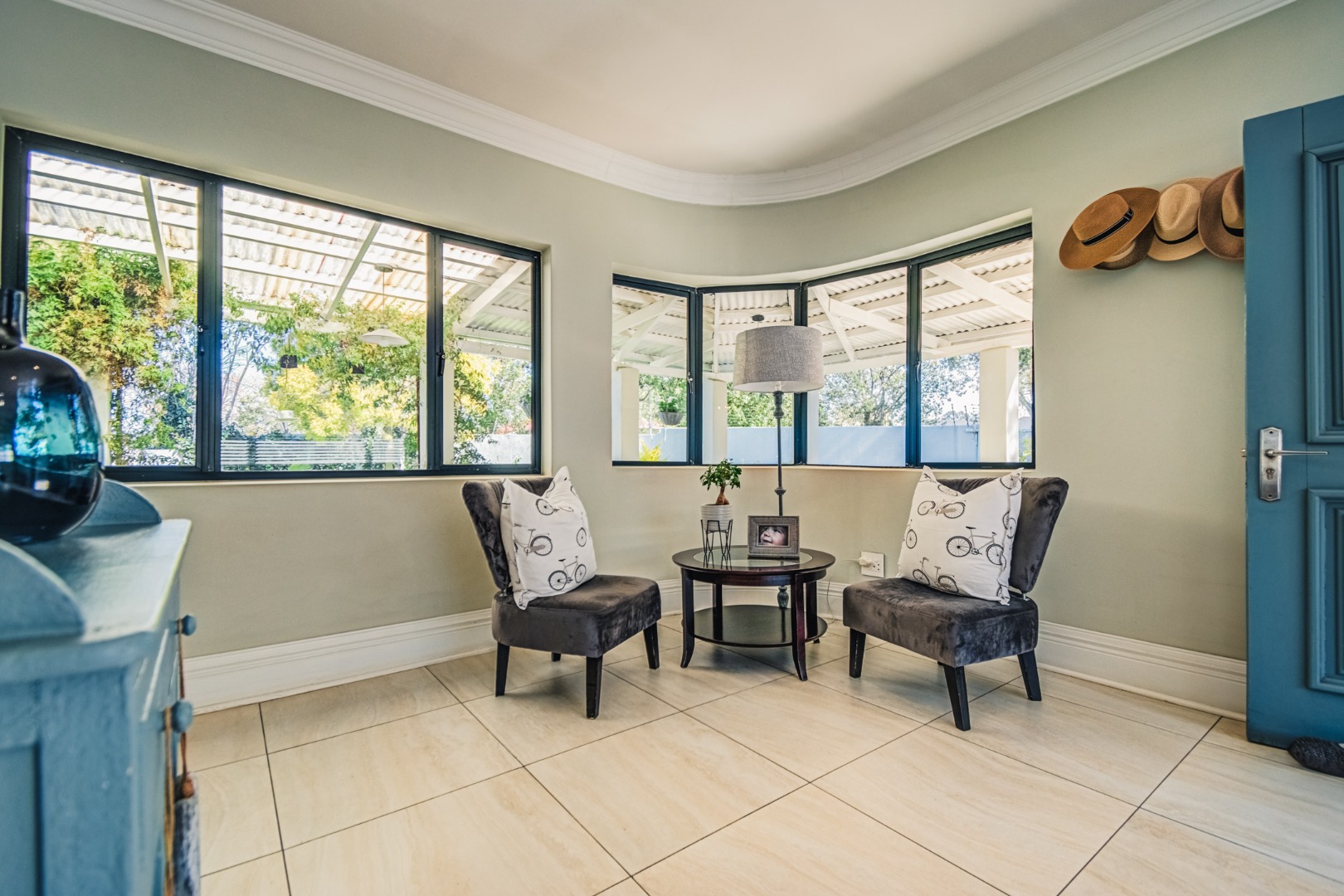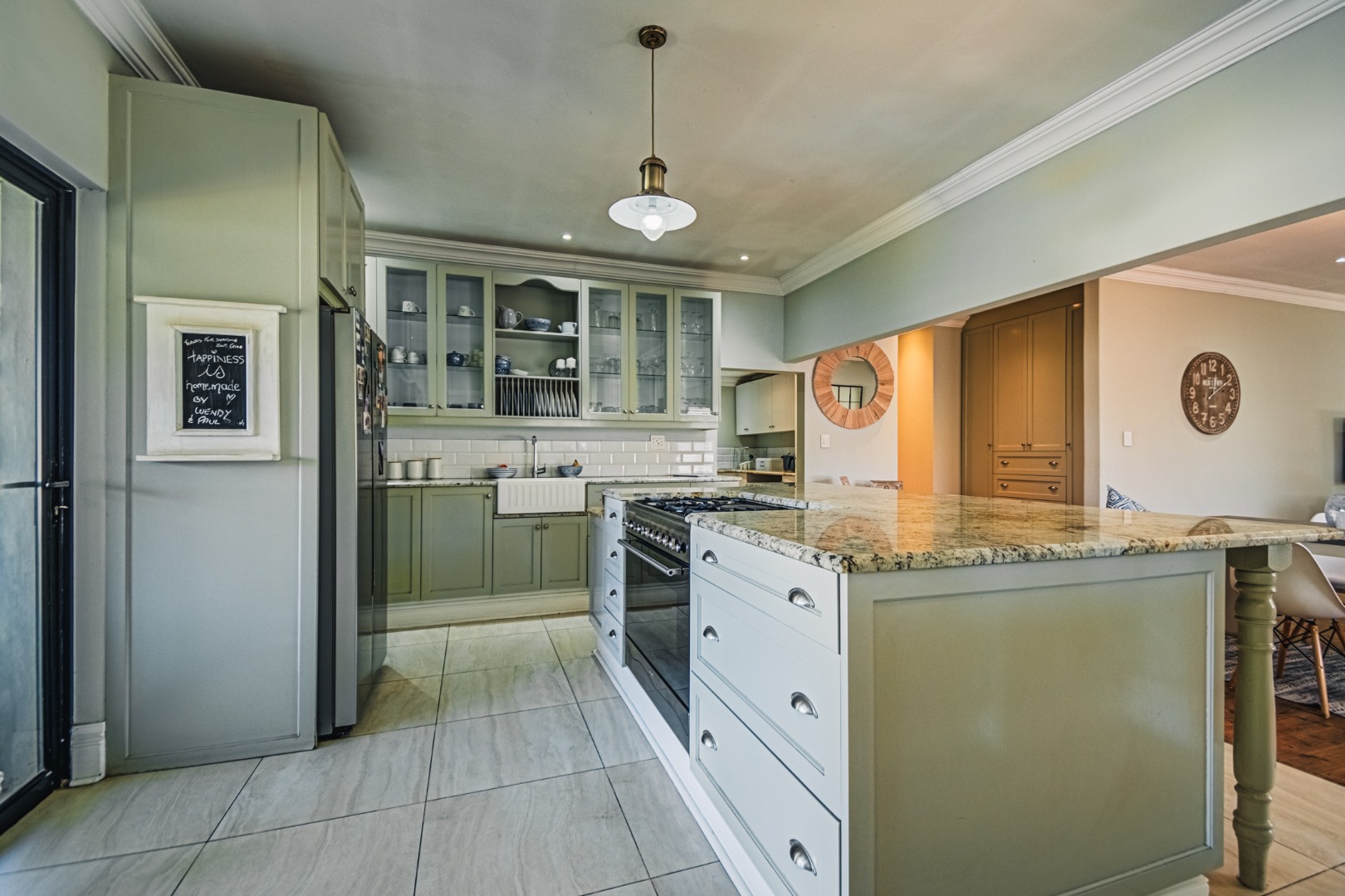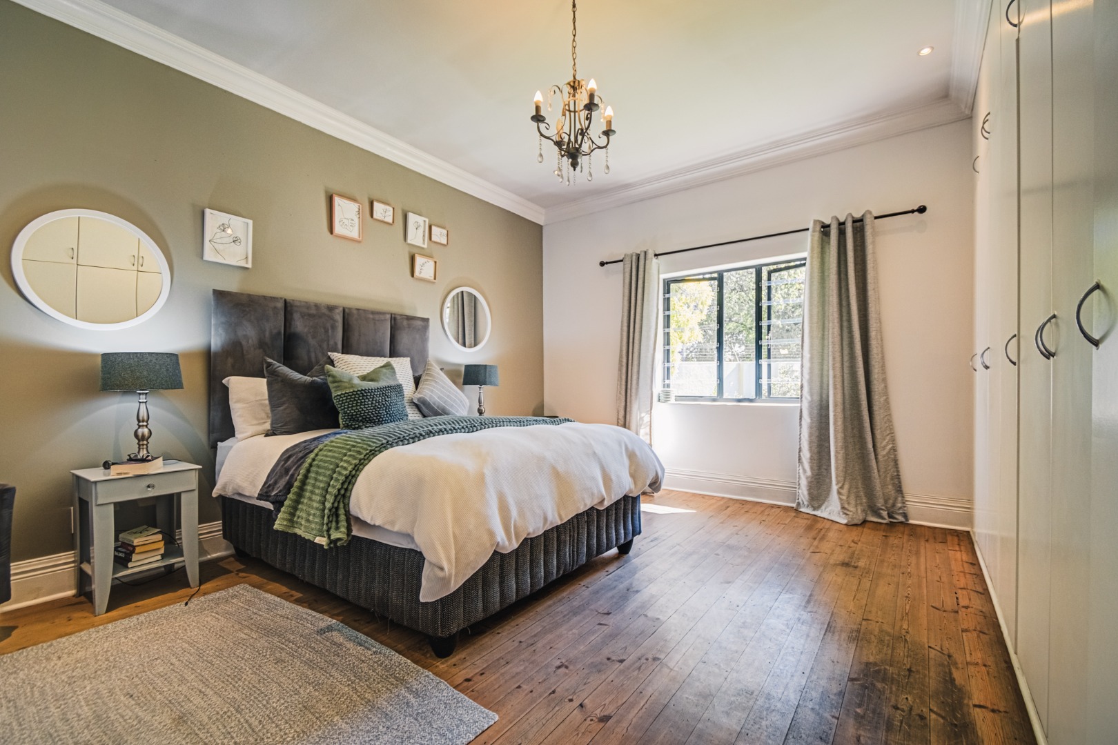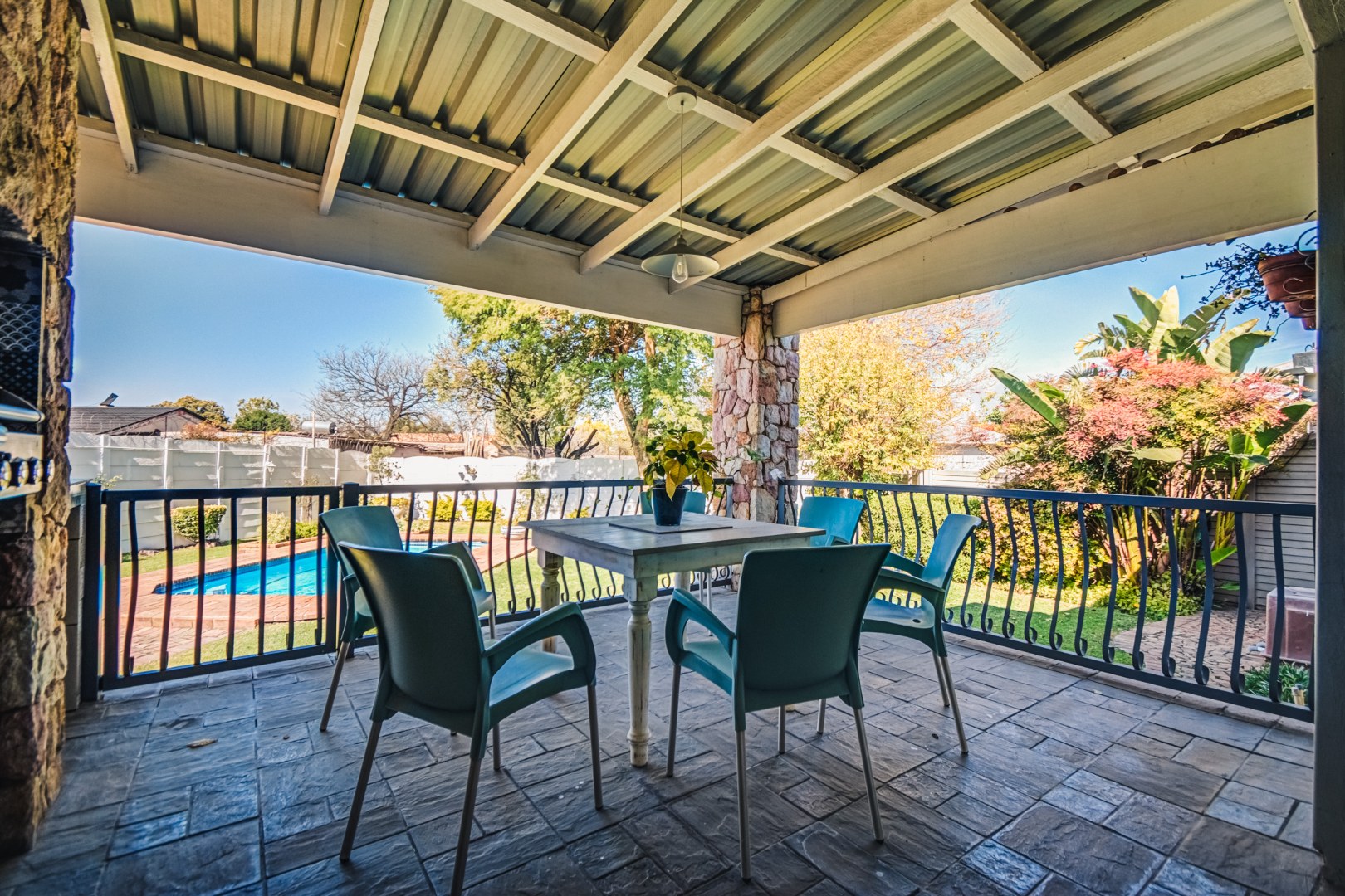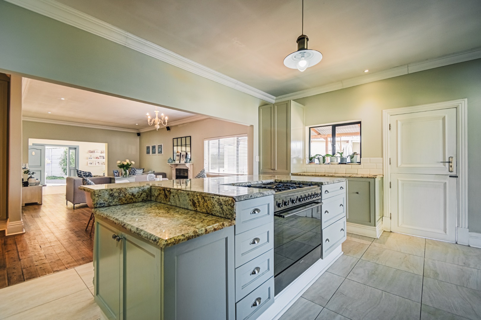 As you meander through this home, there is a beautifully tiled entrance hall that flows onto a rich and warm lounge with wooden floors and a gas fireplace (that services the diningroom and lounge. The open plan kitchen is absolutely stunning with granite tops a gas hob, country sink and space for a double door fridge. There is a separate scullery. The kitchen opens with gorgeous aluminium stacker doors onto an under cover patio with beautiful stonework as well as a gas braai. It overlooks a manicured back garden and blue, blue pool. Outside there is also a built in boma for those evening conversations with friends and family,