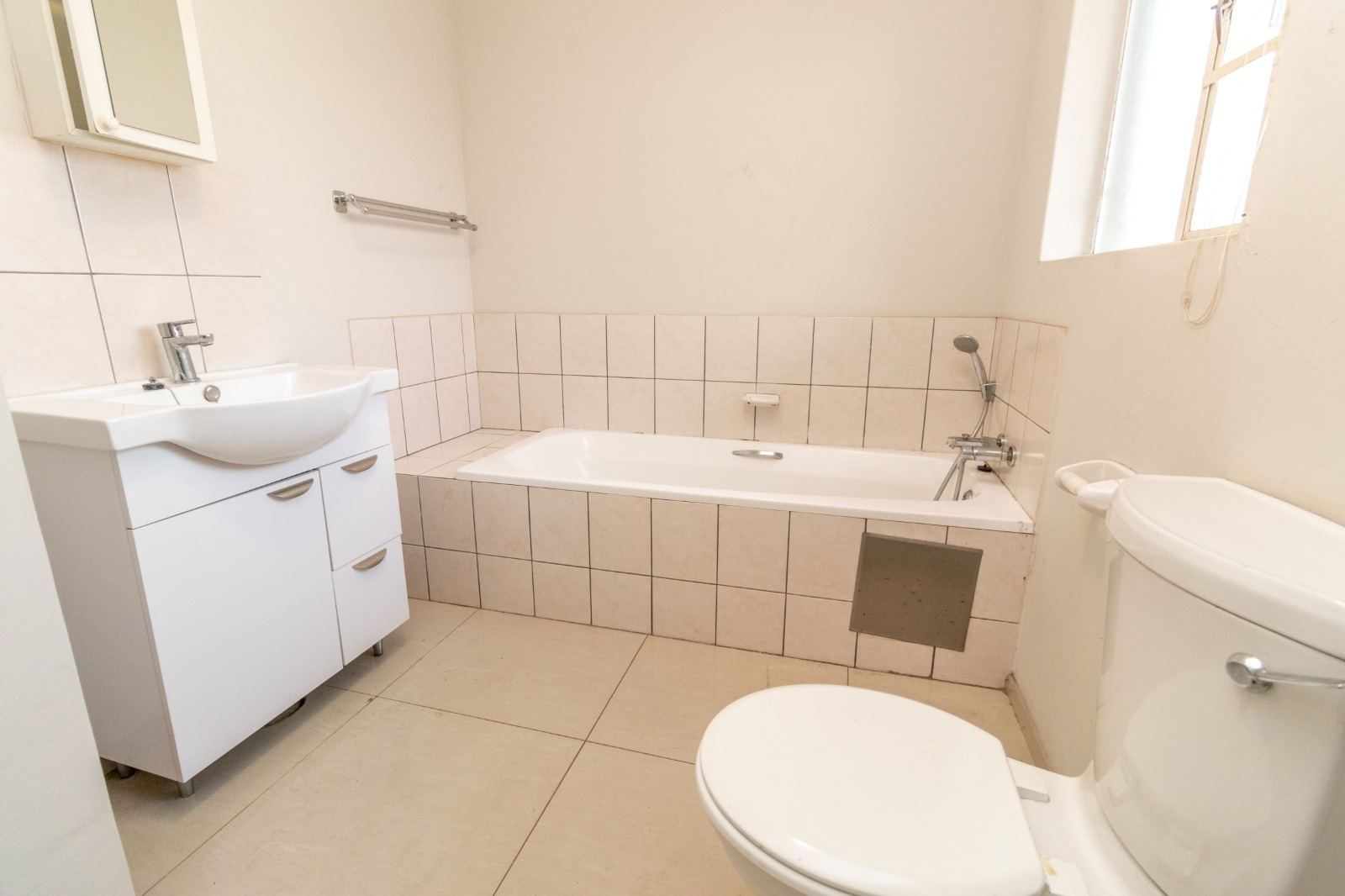 Both bedrooms feature modern laminate flooring and continue the neutral colour palette, offering a clean and inviting atmosphere. Large windows in each room provide ample natural light, enhancing the sense of space. The single bathroom is designed for efficiency and comfort, catering to the needs of the residents.