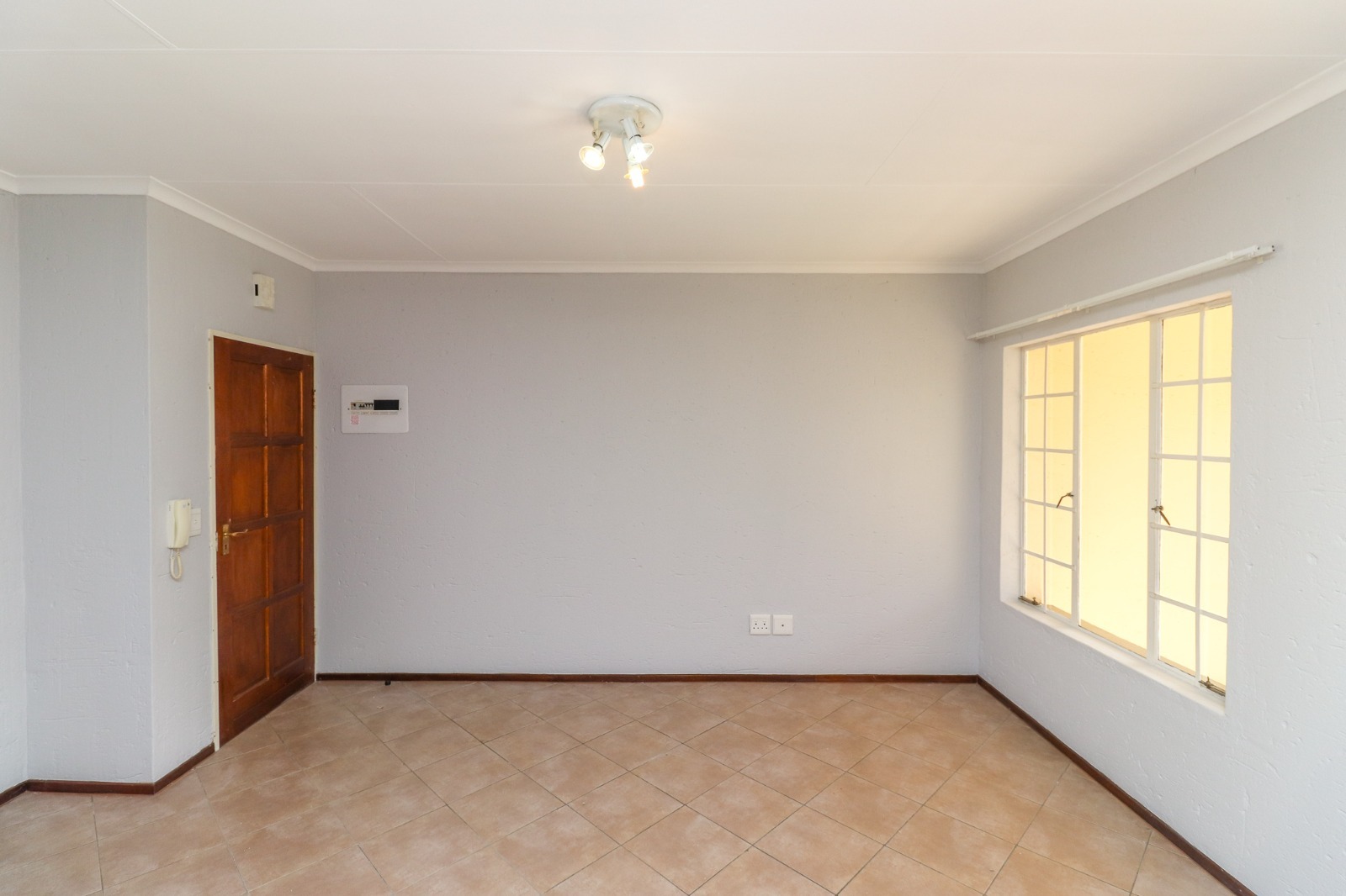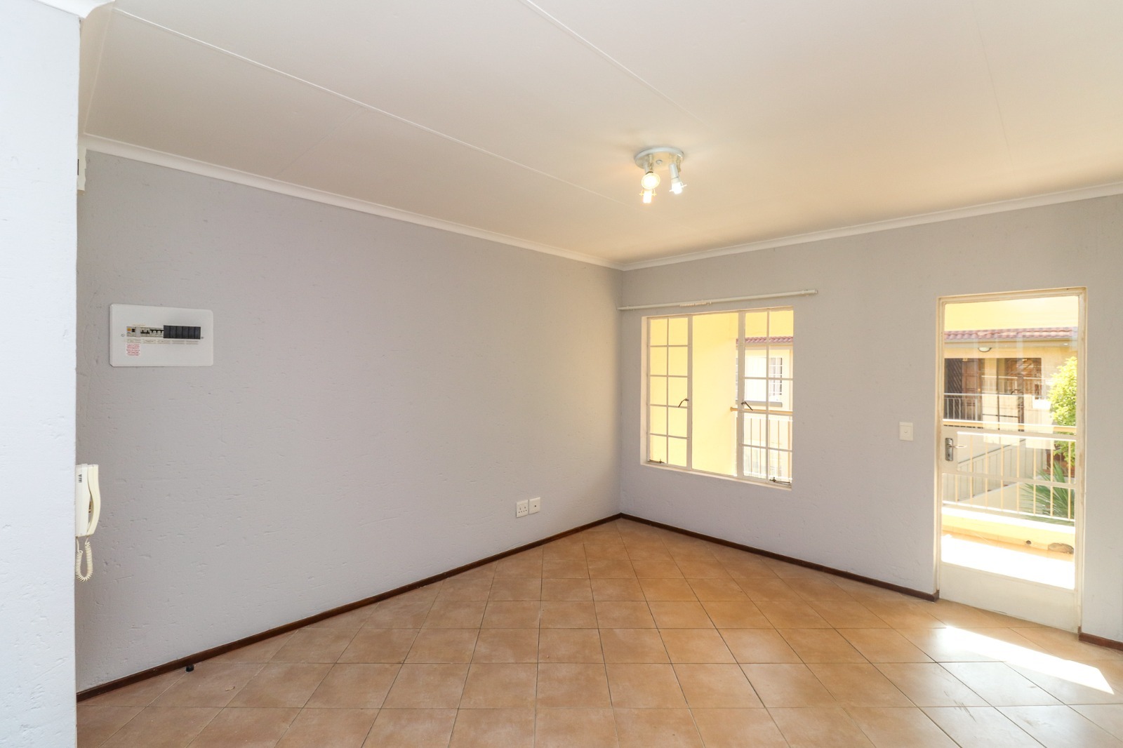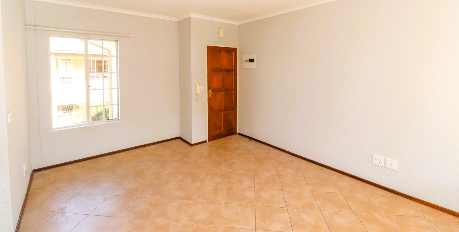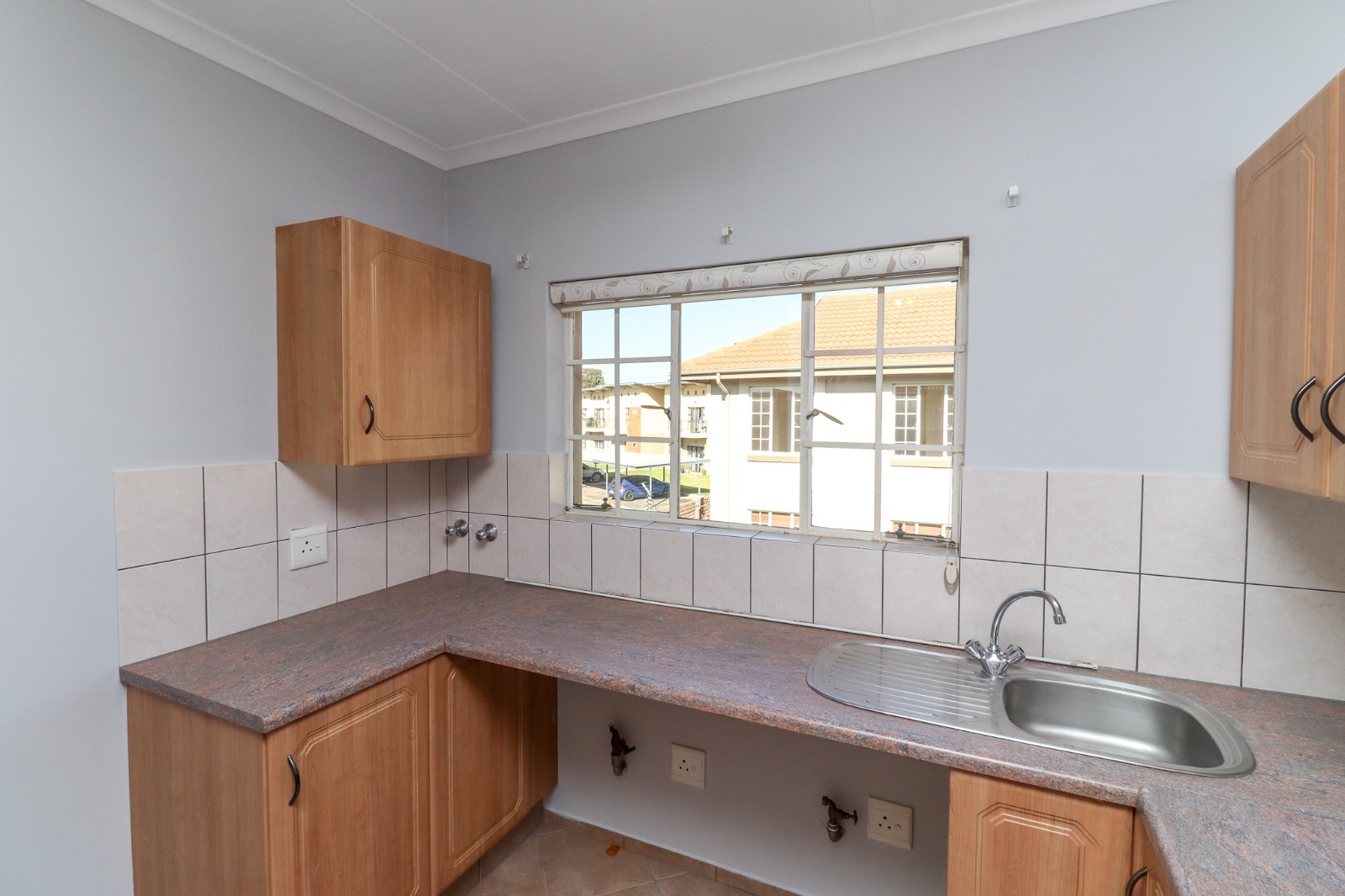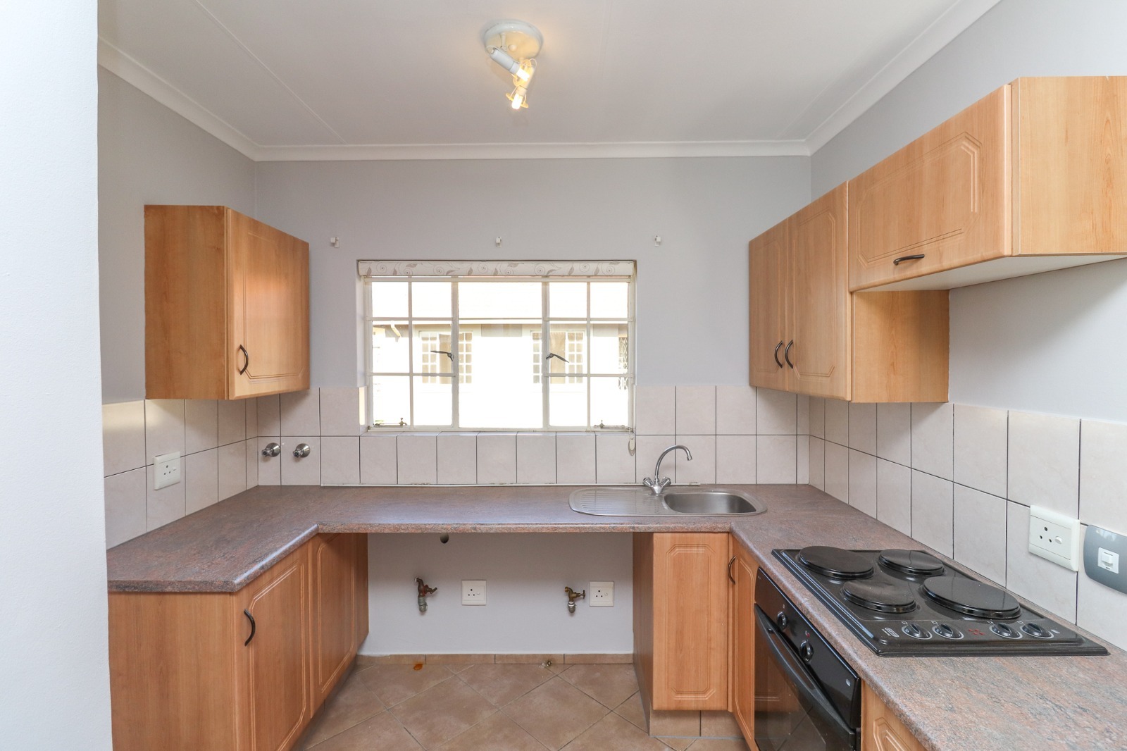 The interior boasts a functional open-plan layout, seamlessly connecting the living area and kitchen. Throughout the main living spaces, durable tiled flooring ensures easy maintenance, complemented by neutral light grey walls that allow for personal customisation. The kitchen is equipped with light wooden cabinetry, ample countertop space, a built-in oven and hob, and a stainless steel sink, providing a practical environment for daily meal preparation. Natural light floods these areas through well-sized windows, some fitted with security bars for added peace of mind.