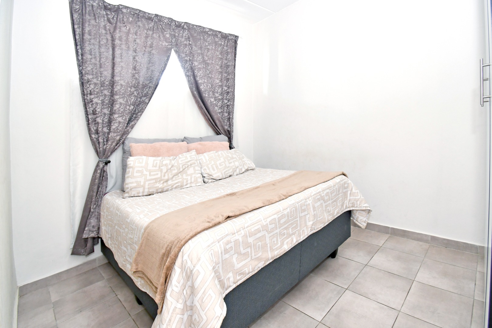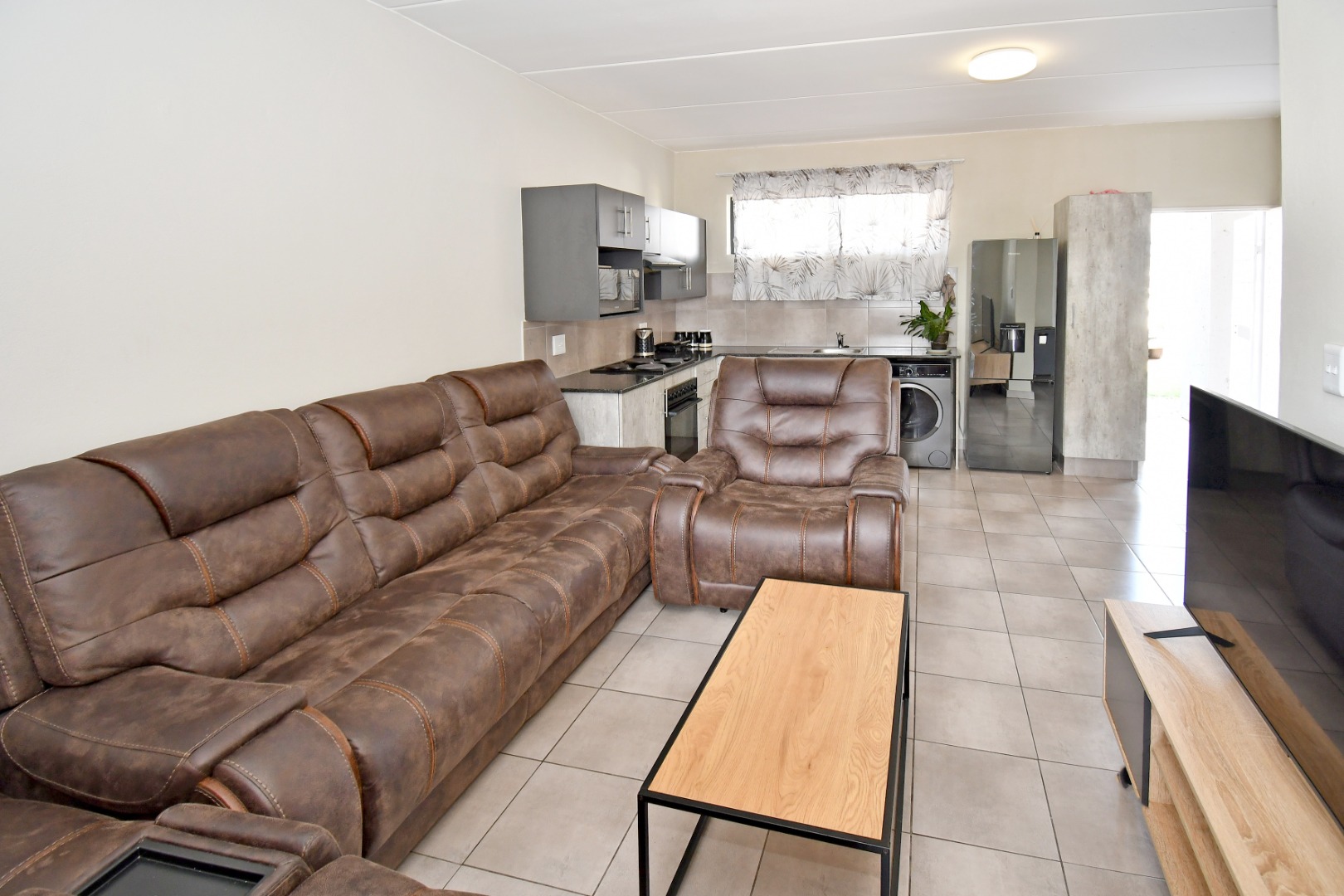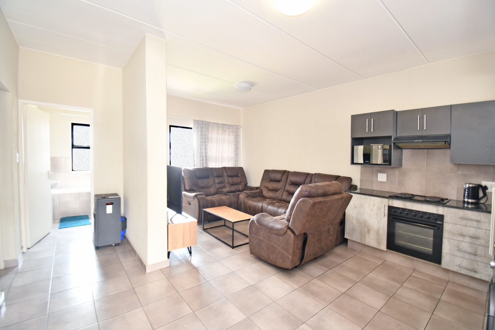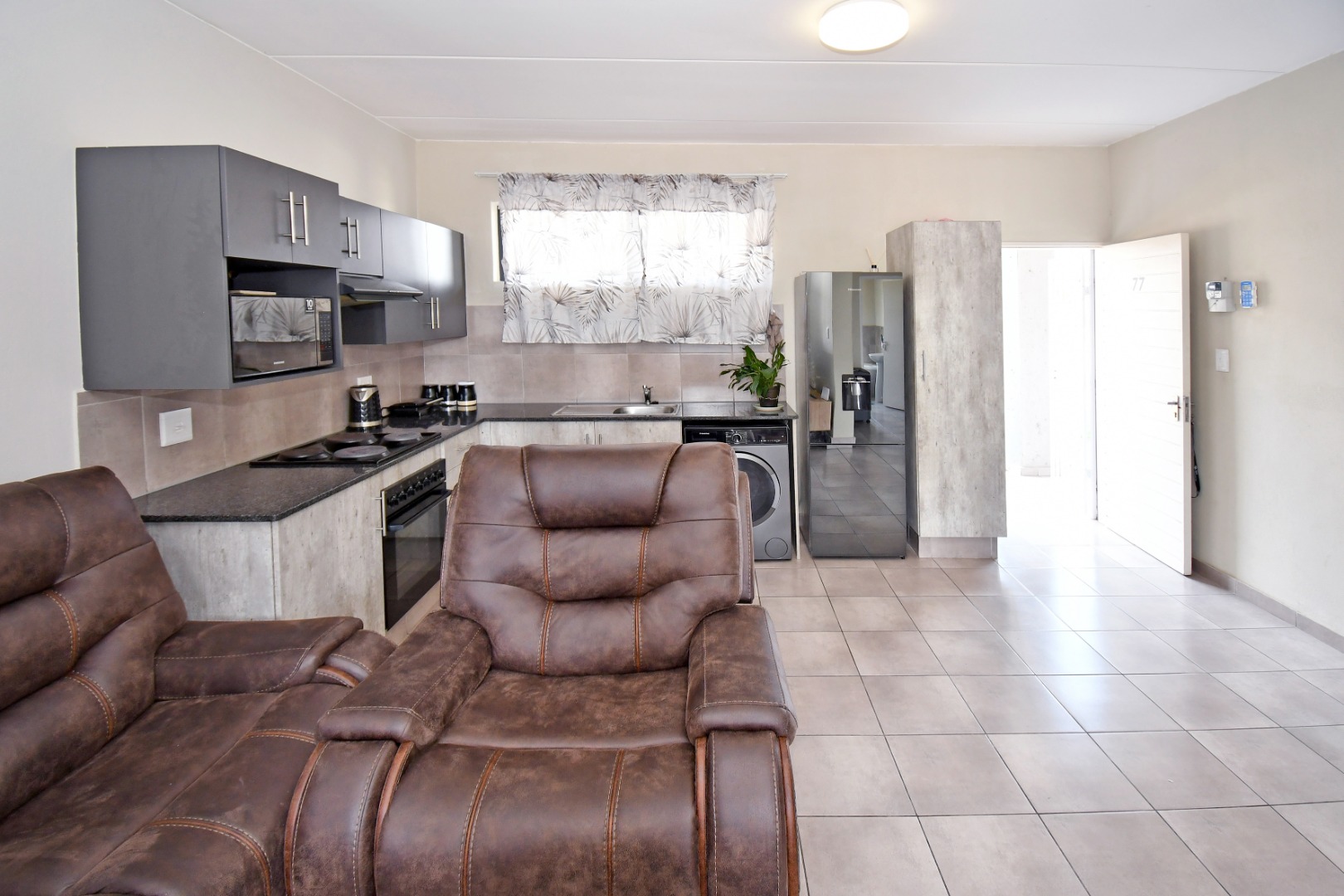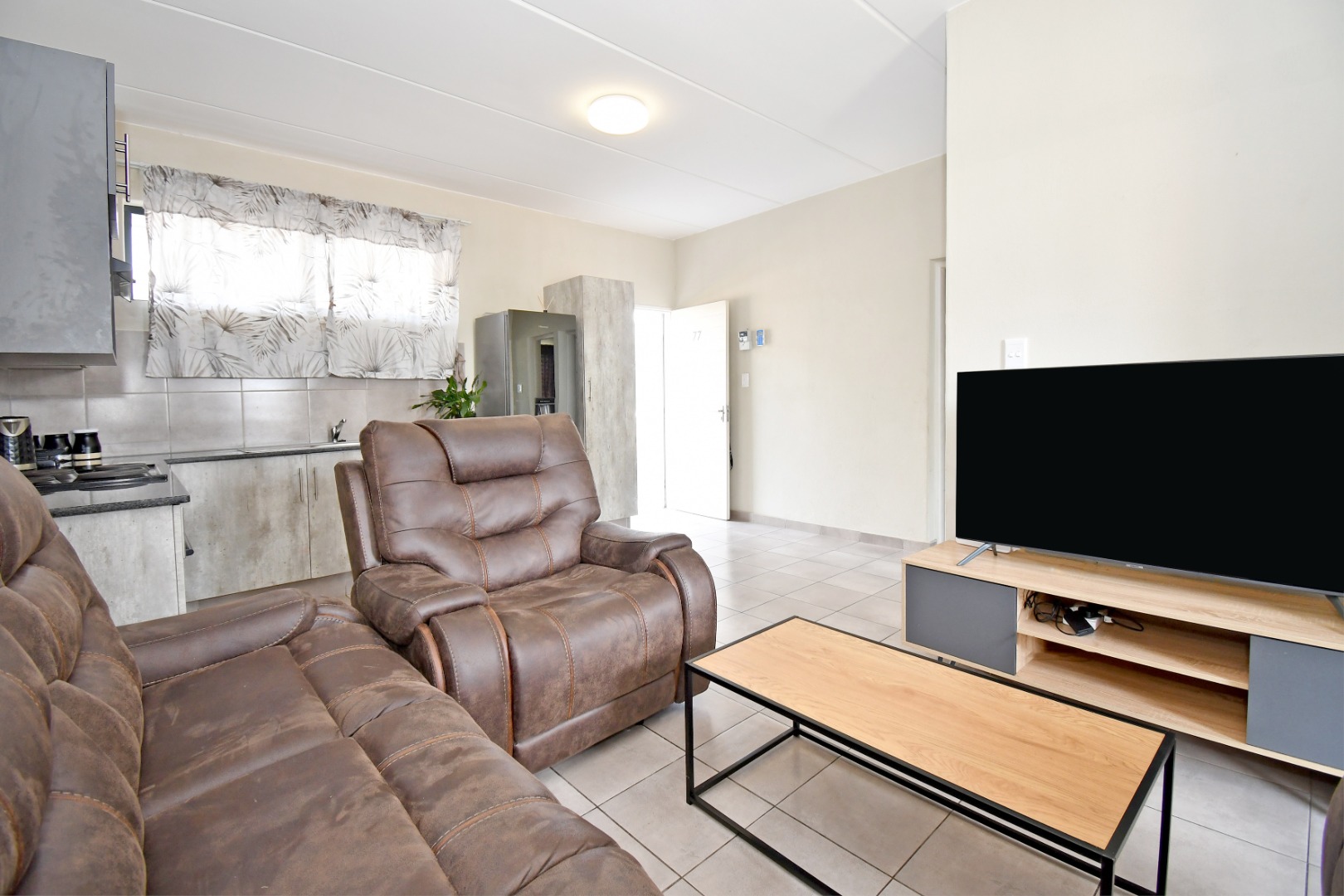 This modern 2-bedroom, 1-bathroom apartment offers comfortable living within a secure complex in Benoni. The open-plan layout seamlessly connects the living and dining areas with a contemporary kitchen, creating an inviting space for relaxation and entertaining. The kitchen is a highlight, featuring stylish grey upper and light wood-toned lower cabinetry, complemented by dark granite countertops. It comes fully equipped with integrated appliances including an oven, hob, extractor fan with space for a washing machine, all set on practical tiled flooring that extends throughout the unit.