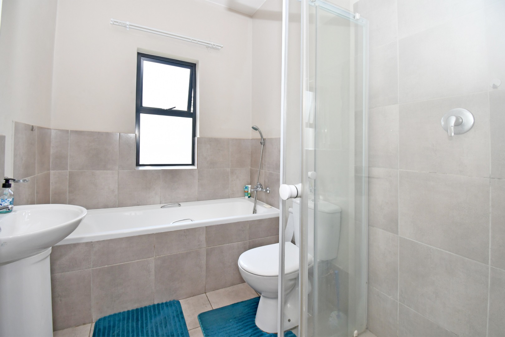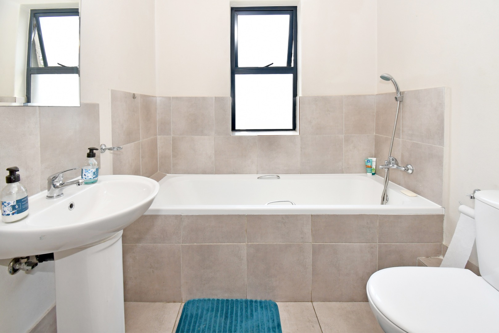Both bedrooms are designed for comfort, boasting built-in wardrobes that provide ample storage solutions. The neutral colour palette and tiled floors ensure a clean and low-maintenance environment. The well-appointed bathroom offers both a bathtub with an overhead shower and a separate glass-enclosed shower, alongside a pedestal sink and toilet, catering to all preferences.