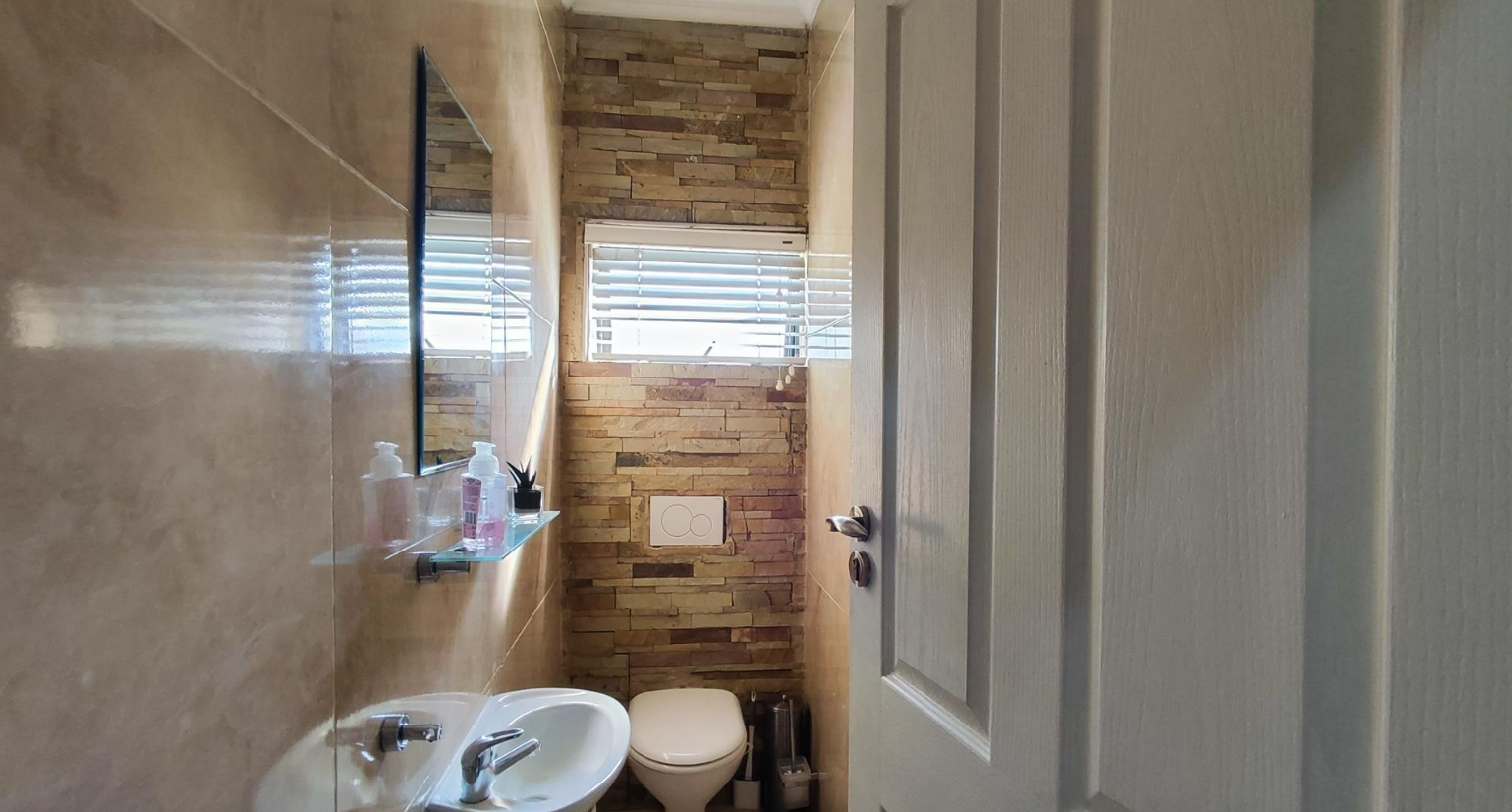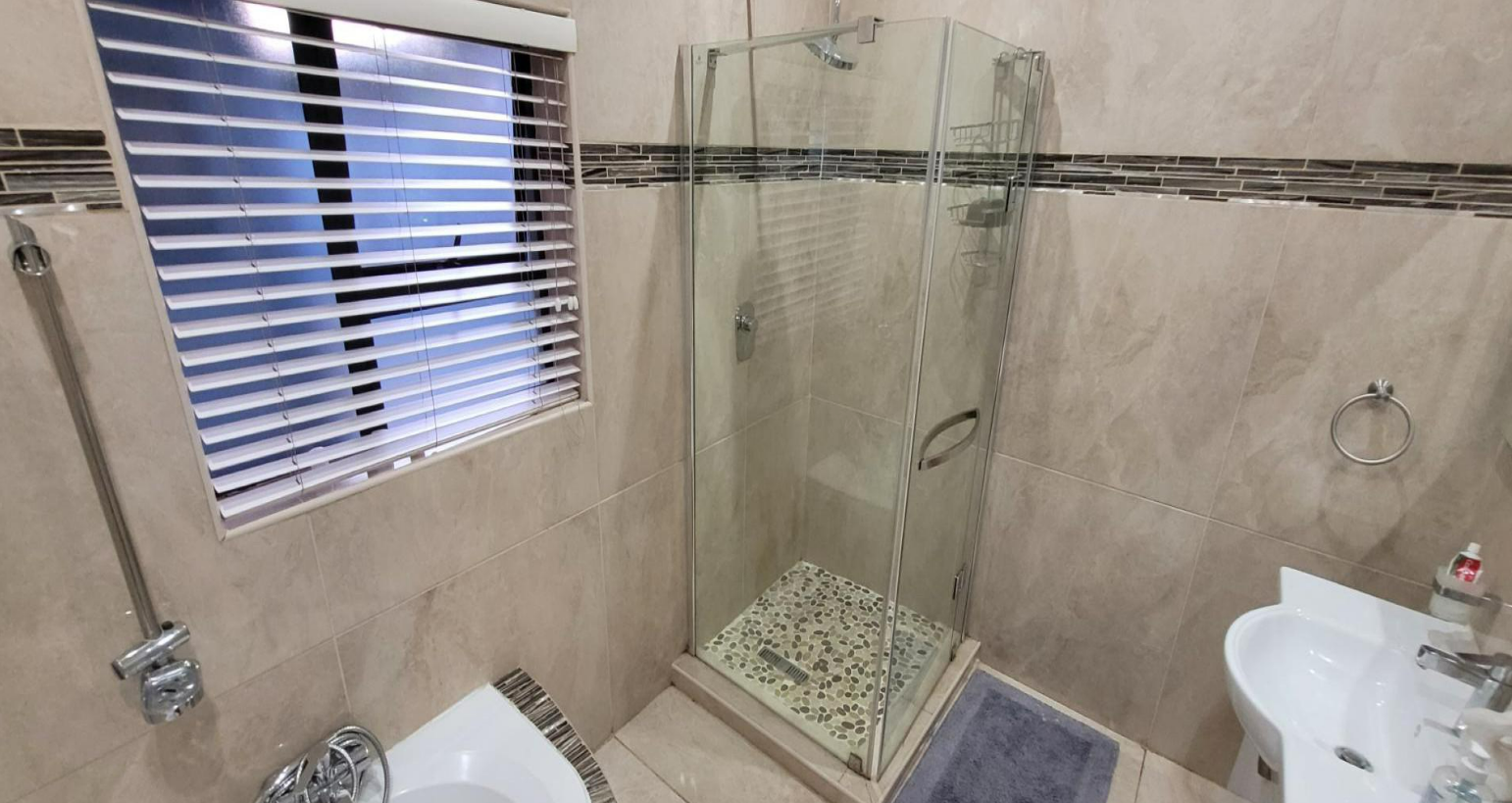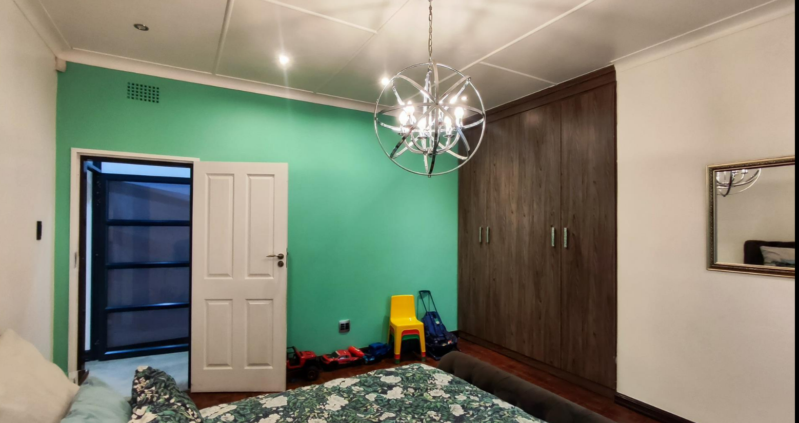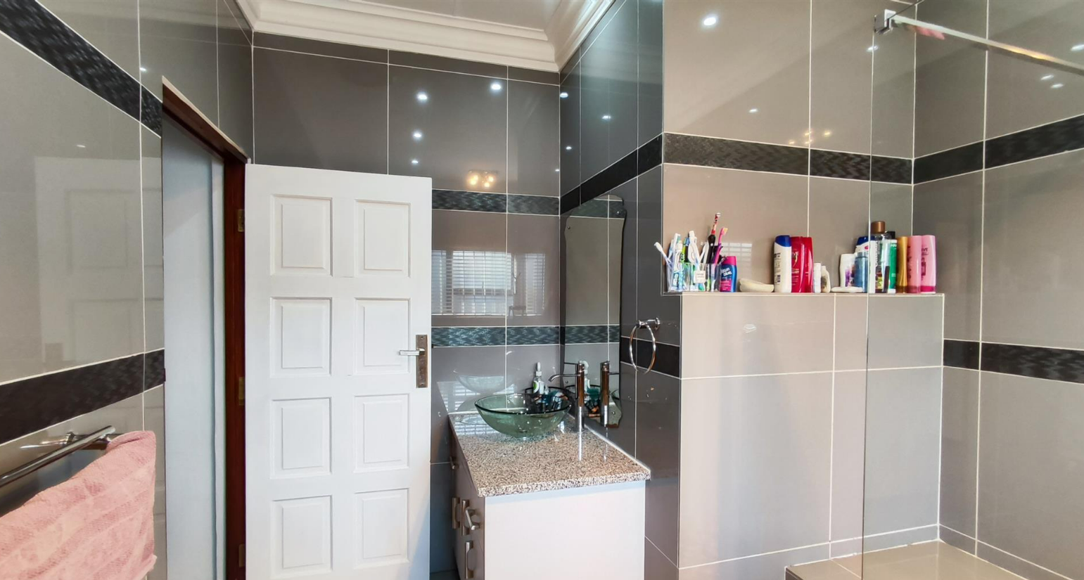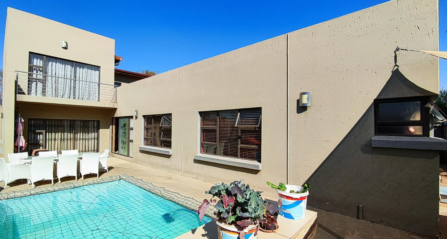 This modern residential property, located in the desirable Rynfield suburb of Benoni, South Africa, offers exceptional living on a generous 1170 sqm erf. The home immediately impresses with its well-maintained, beautifully landscaped garden, featuring mature palm trees and a lush lawn. A contemporary grey exterior is complemented by a decorative water feature, enhancing its inviting kerb appeal.