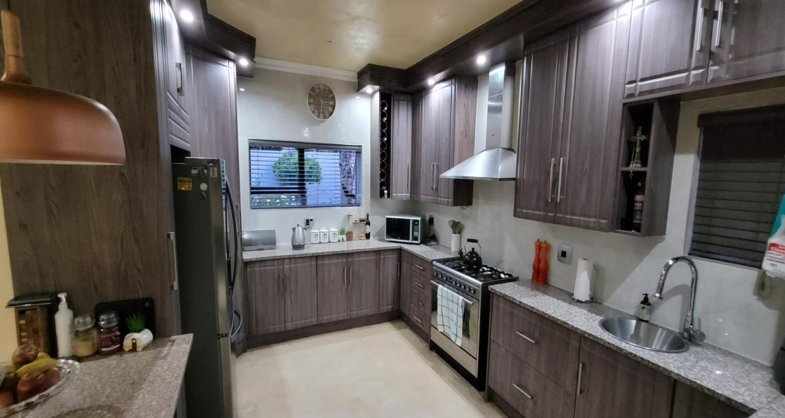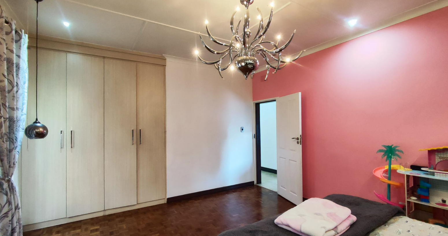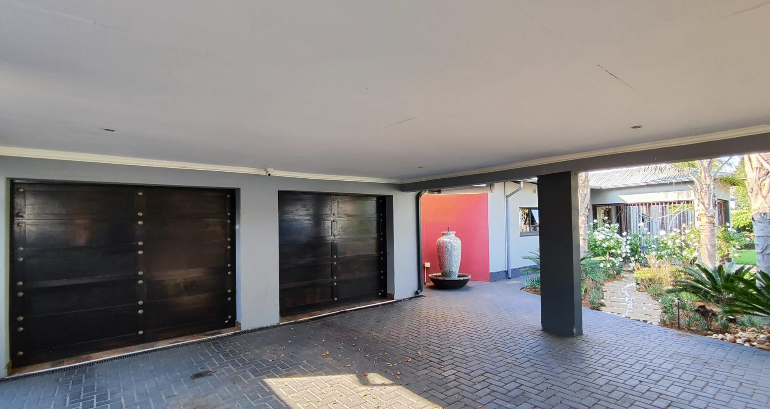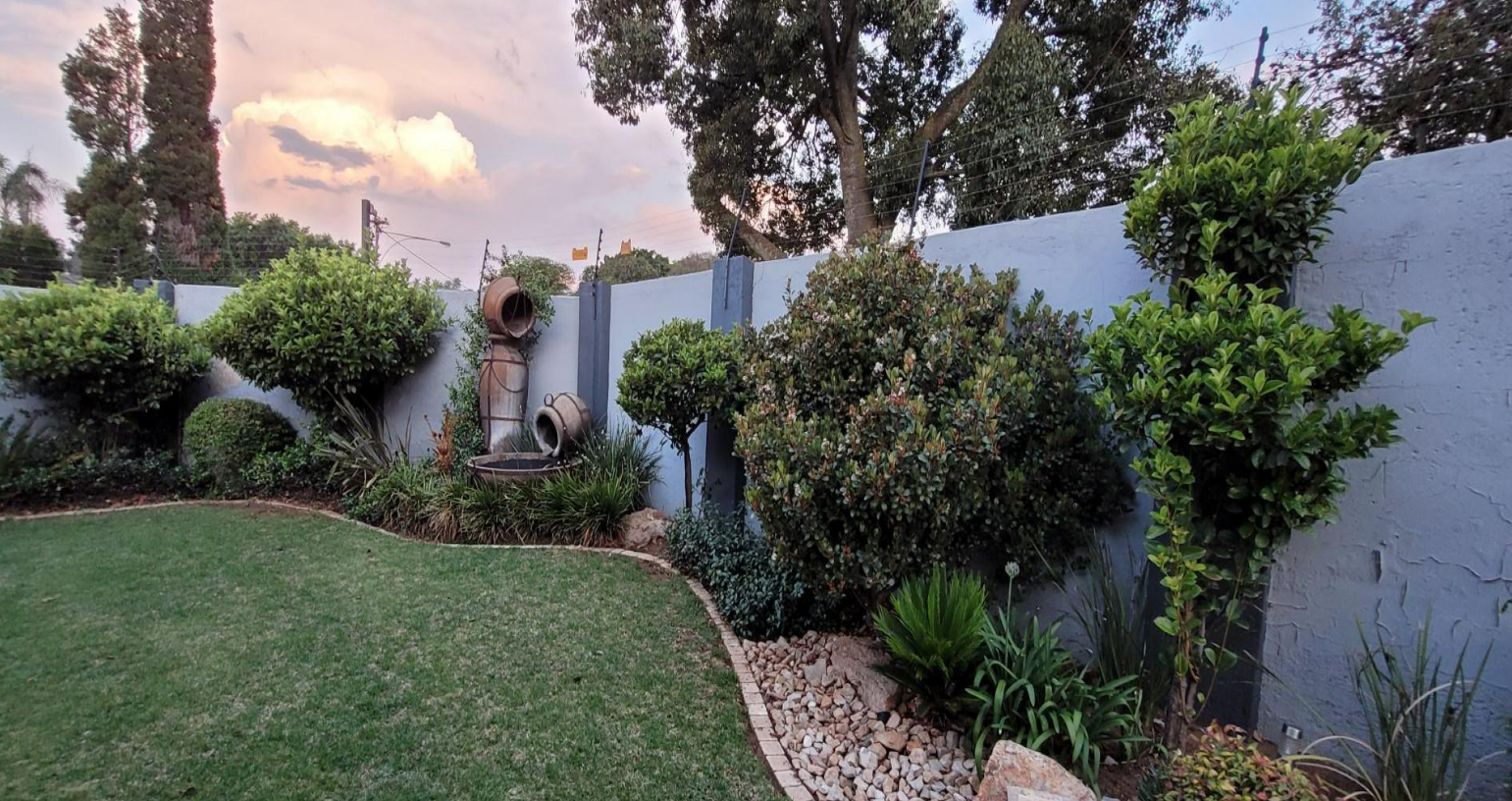 This modern residential property, located in the desirable Rynfield suburb of Benoni, South Africa, offers exceptional living on a generous 1170 sqm erf. The home immediately impresses with its well-maintained, beautifully landscaped garden, featuring mature palm trees and a lush lawn. A contemporary grey exterior is complemented by a decorative water feature, enhancing its inviting kerb appeal.