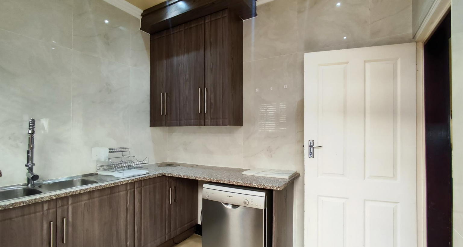 The modern kitchen is a chef's delight, featuring extensive dark wood-look cabinetry, granite countertops, including an integrated dishwasher and range hood. Ample storage, integrated lighting, and a sleek sink complete this functional space. The residence offers three comfortable bedrooms and two well-appointed bathrooms, including one ensuite, providing privacy and convenience for the entire family.