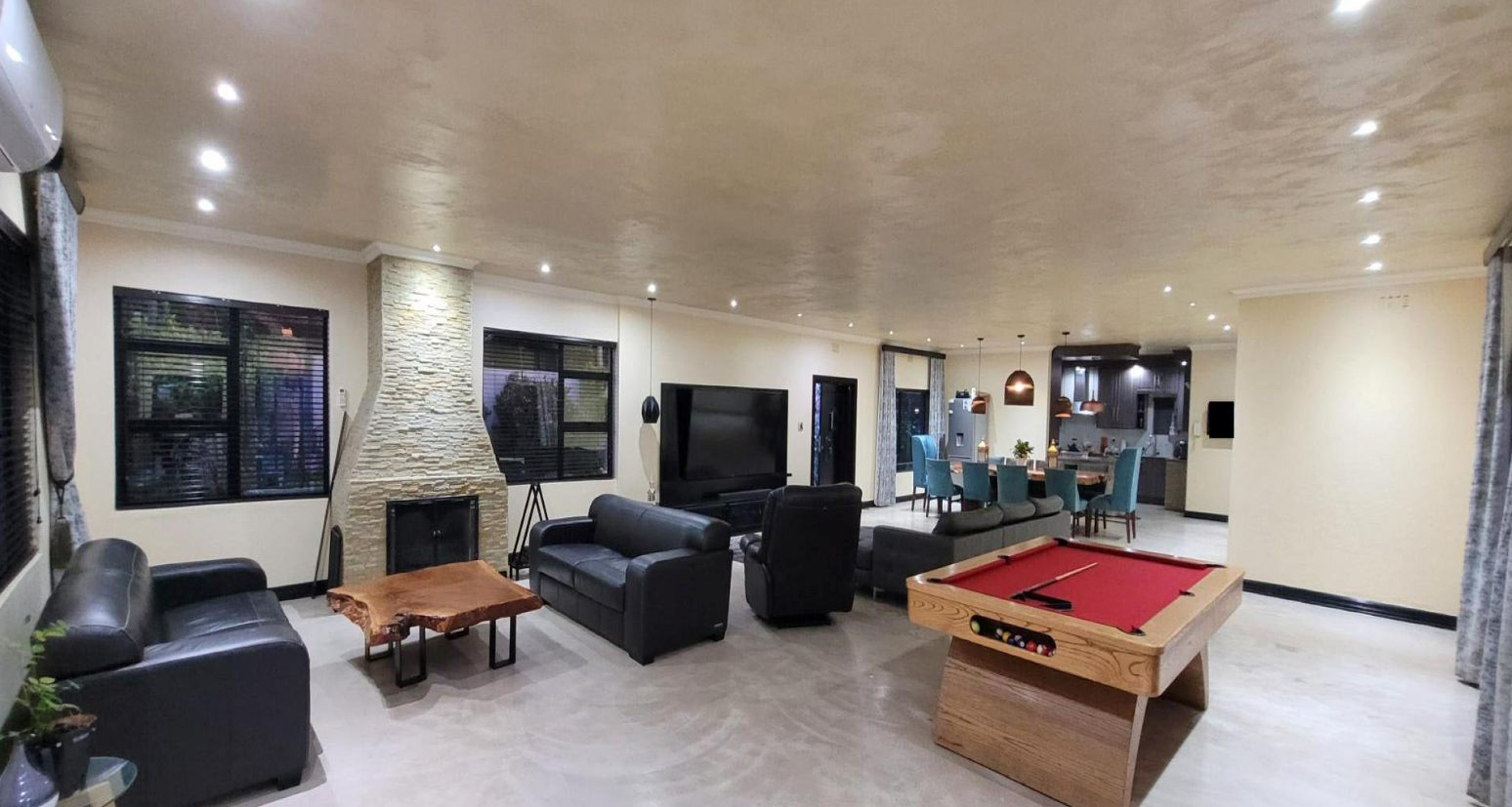 Step inside to discover a spacious 630 sqm floor plan designed for seamless open-plan living and entertaining. The integrated lounge, dining, and recreation areas are bathed in natural light from ample windows, creating an inviting atmosphere. This versatile space boasts a fireplace, a large wall-mounted TV, and a pool table, ensuring year-round enjoyment within the dedicated family TV room.