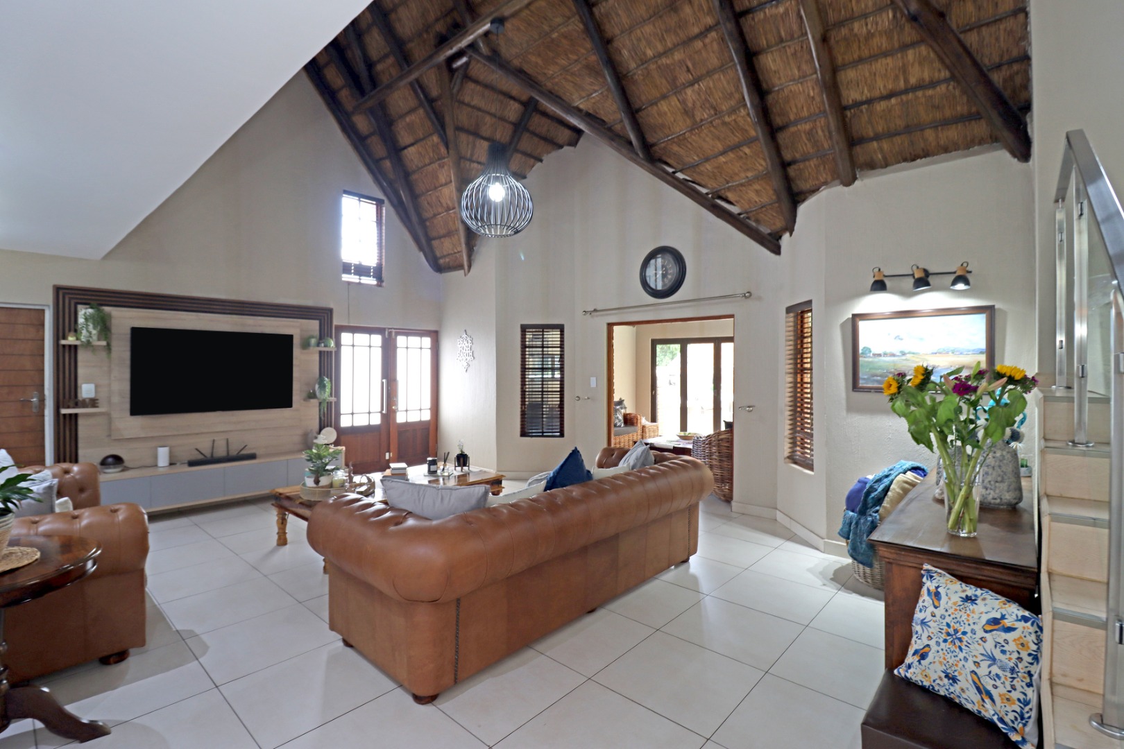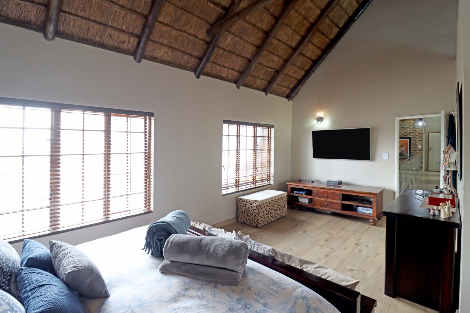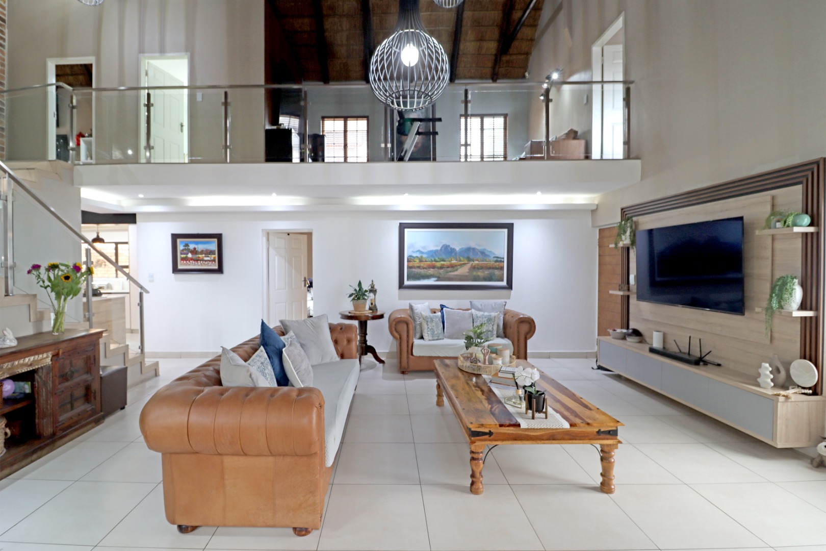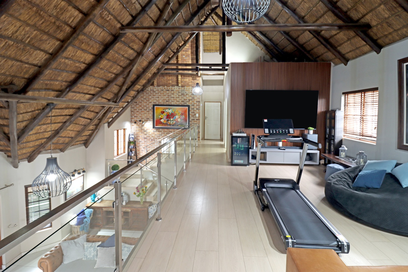 Discover this exceptional 4-bedroom, 3-bathroom residence situated within a secure estate in the sought-after Rynfield suburb of Benoni. This modern home, spanning 420 sqm on a 433 sqm erf, offers a blend of contemporary design and comfortable living. The expansive open-plan living areas are highlighted by a dramatic vaulted thatched ceiling under a Harvey-tile roof with exposed beams, creating an airy and inviting atmosphere. A sleek glass-railed staircase leads to a versatile mezzanine level, perfect for a home office or additional recreational space.