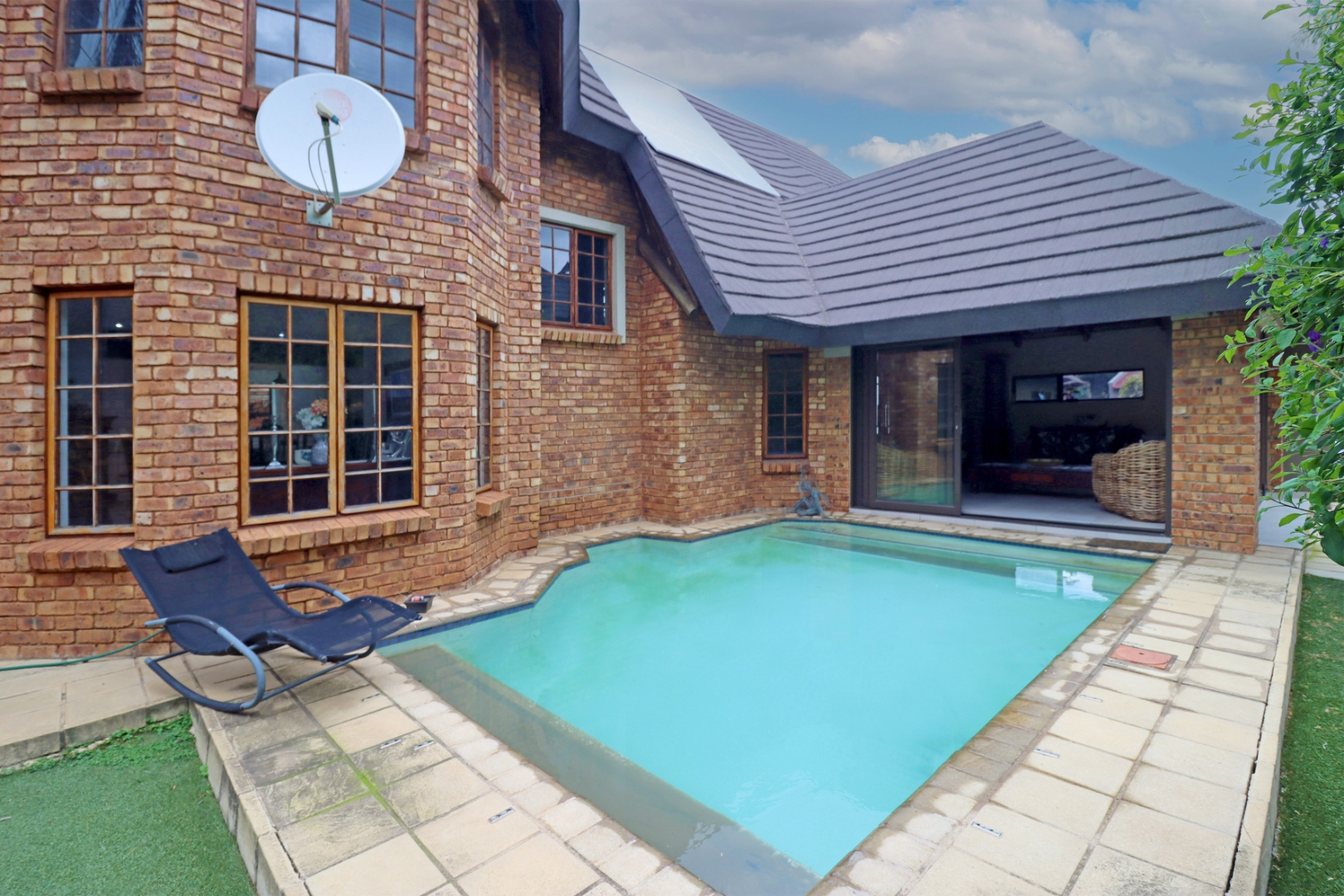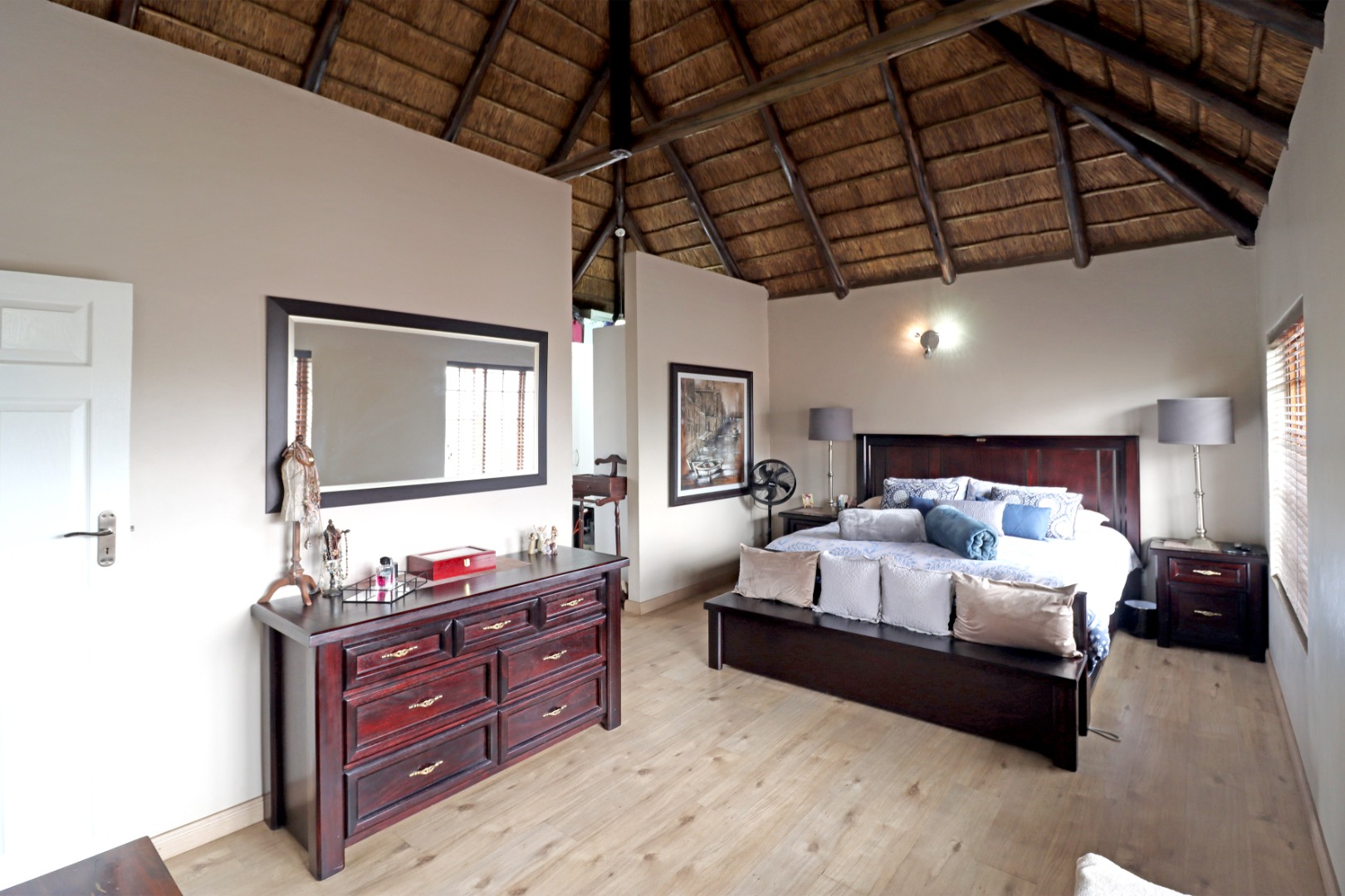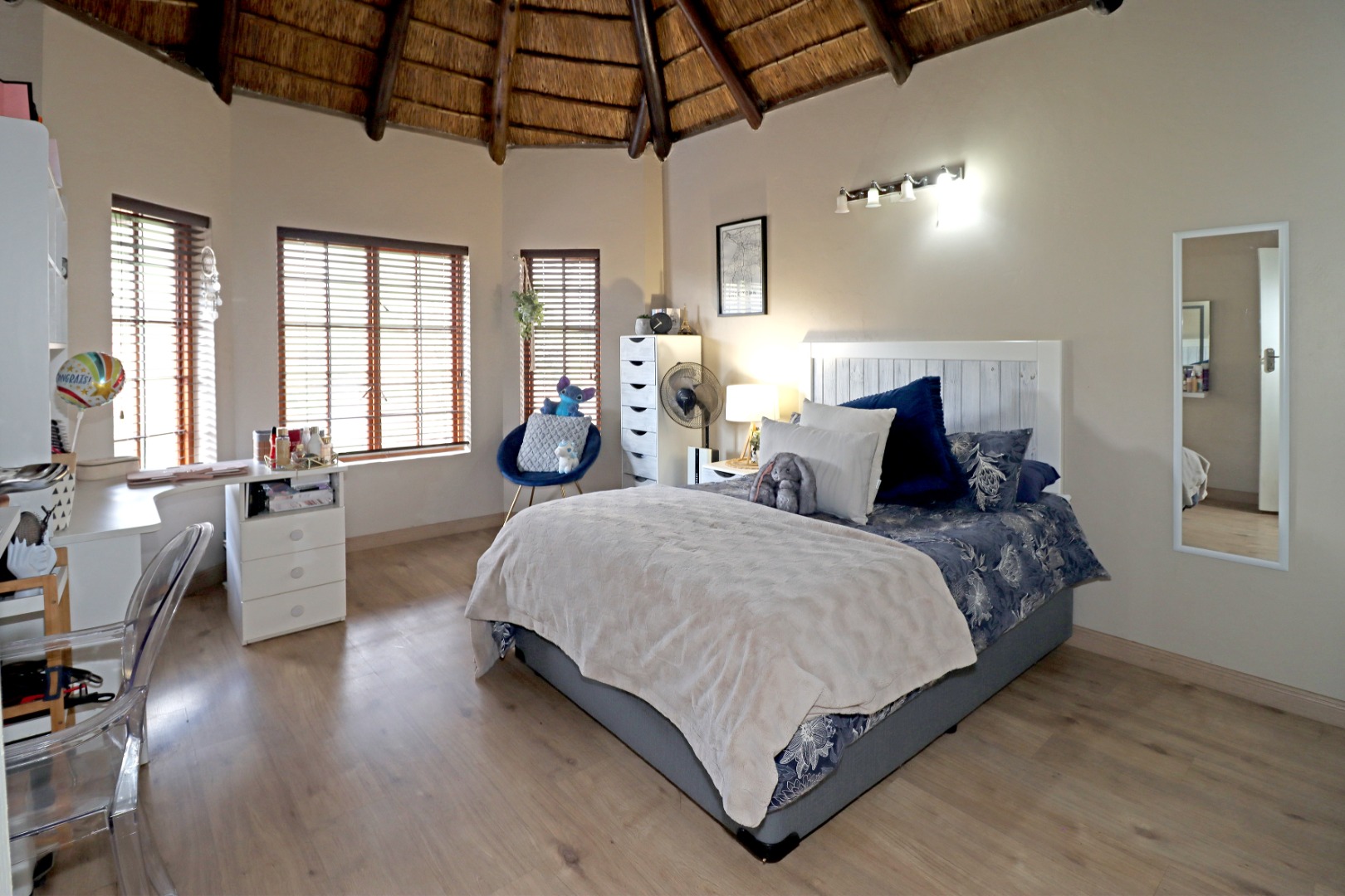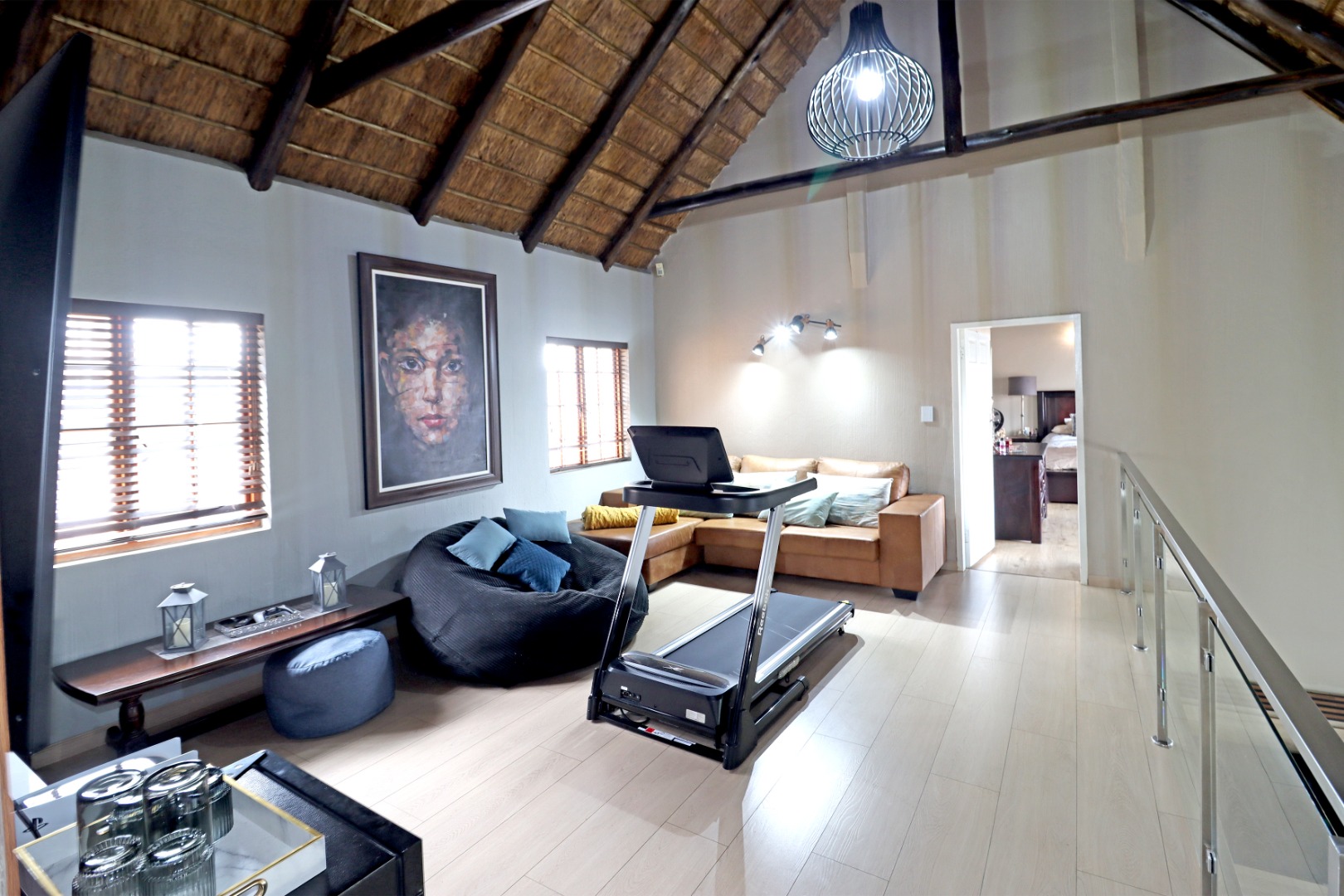 Discover this exceptional 4-bedroom, 3-bathroom residence situated within a secure estate in the sought-after Rynfield suburb of Benoni. This modern home, spanning 420 sqm on a 433 sqm erf, offers a blend of contemporary design and comfortable living. The expansive open-plan living areas are highlighted by a dramatic vaulted thatched ceiling under a Harvey-tile roof with exposed beams, creating an airy and inviting atmosphere. A sleek glass-railed staircase leads to a versatile mezzanine level, perfect for a home office or additional recreational space.