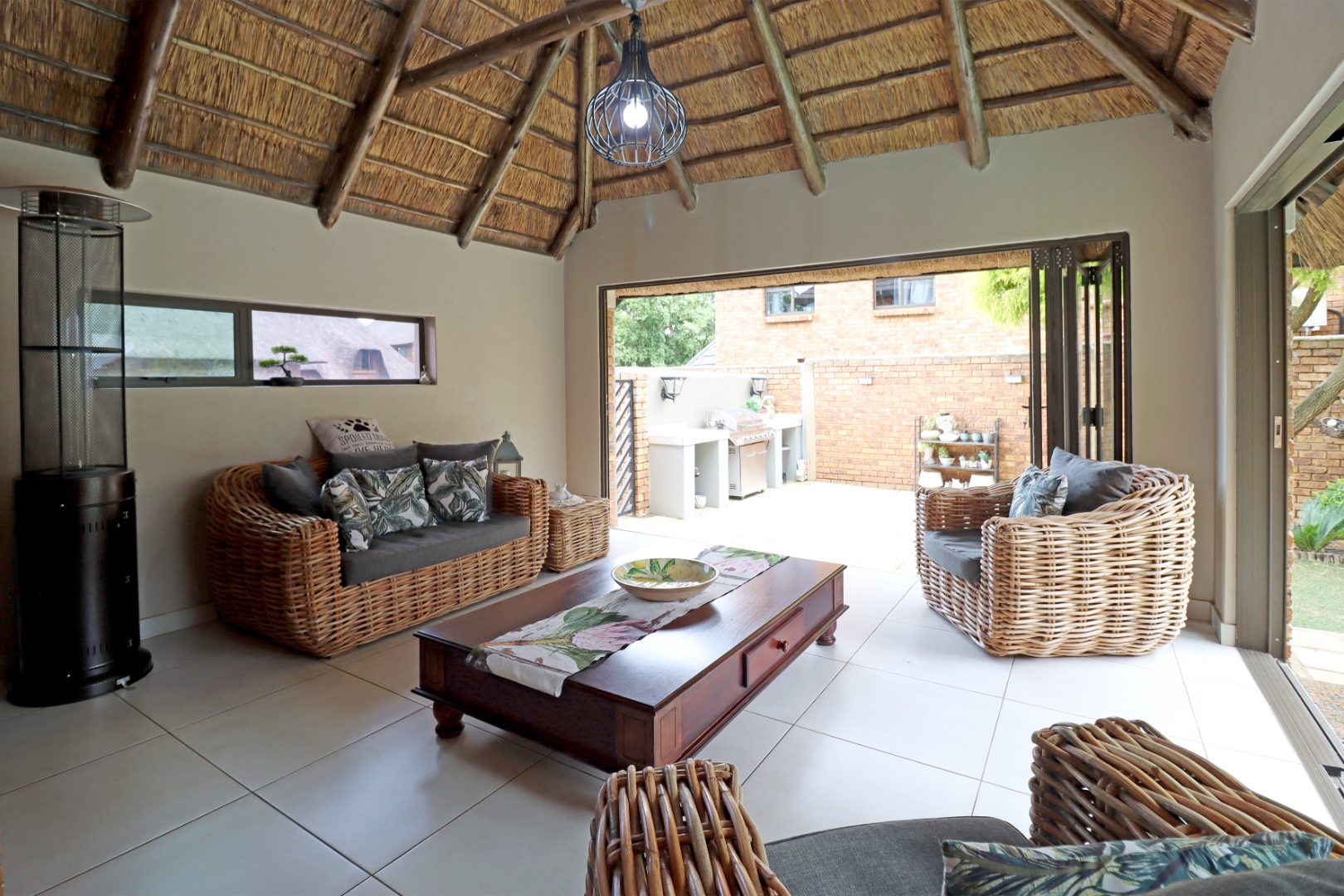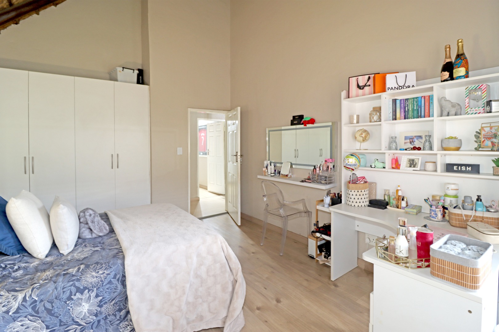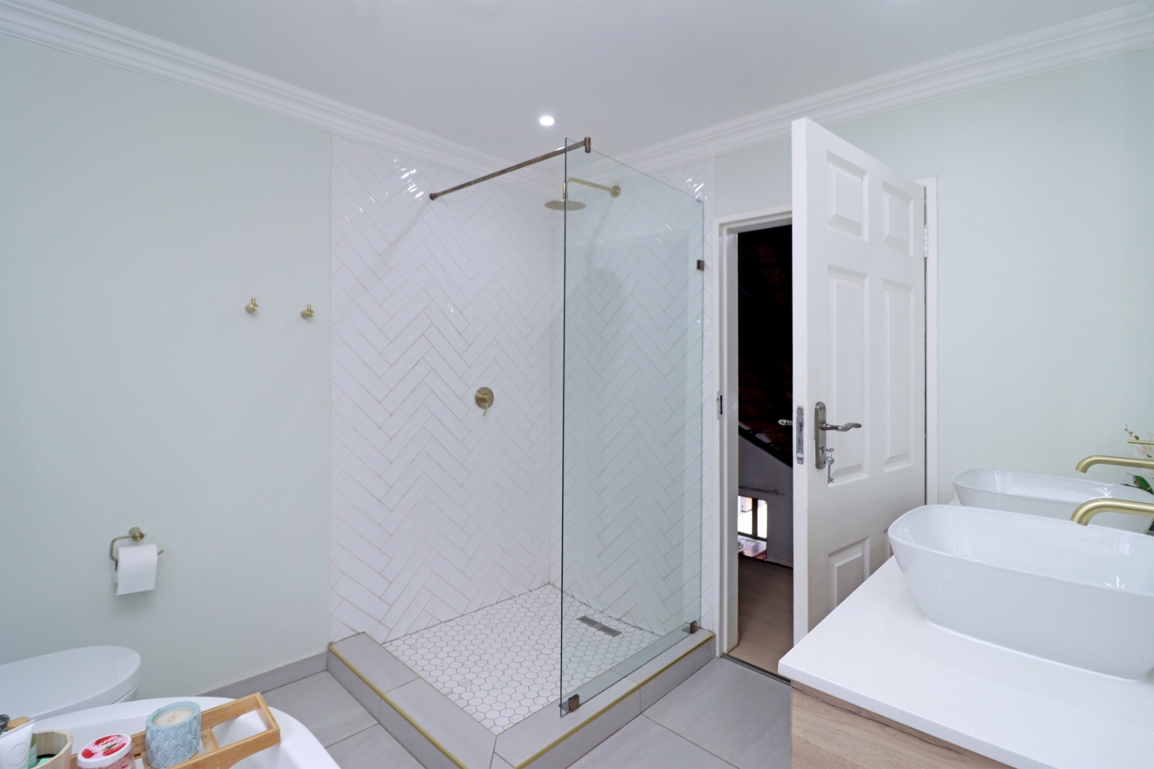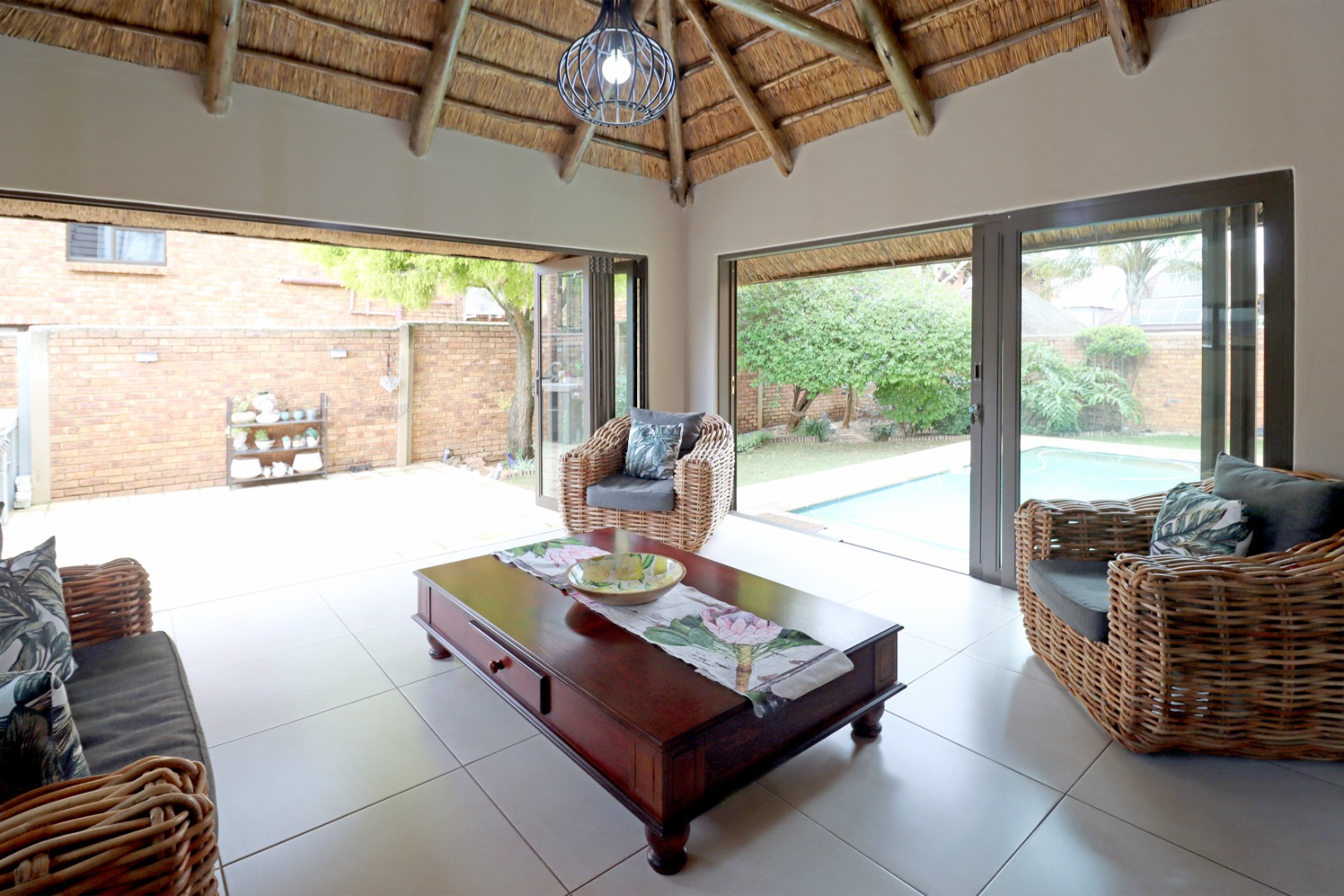 Discover this exceptional 4-bedroom, 3-bathroom residence situated within a secure estate in the sought-after Rynfield suburb of Benoni. This modern home, spanning 420 sqm on a 433 sqm erf, offers a blend of contemporary design and comfortable living. The expansive open-plan living areas are highlighted by a dramatic vaulted thatched ceiling under a Harvey-tile roof with exposed beams, creating an airy and inviting atmosphere. A sleek glass-railed staircase leads to a versatile mezzanine level, perfect for a home office or additional recreational space.