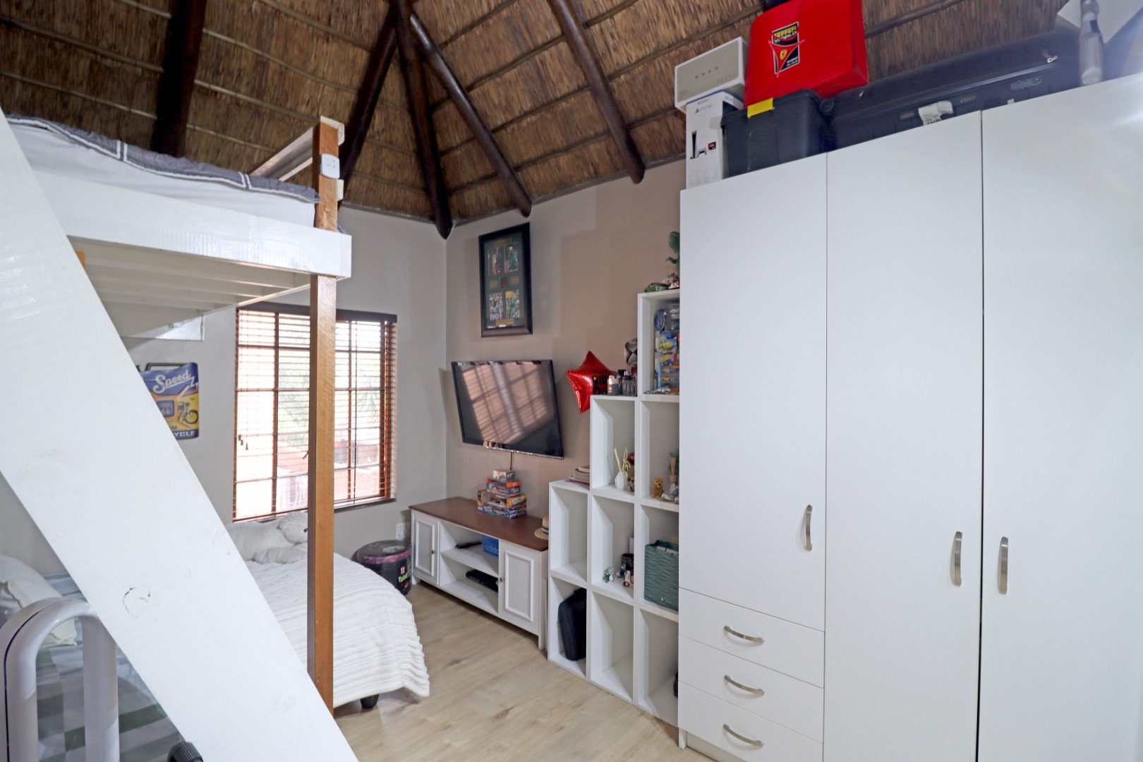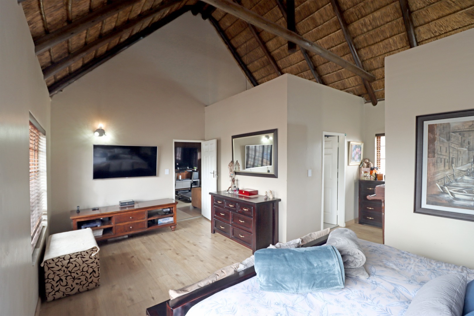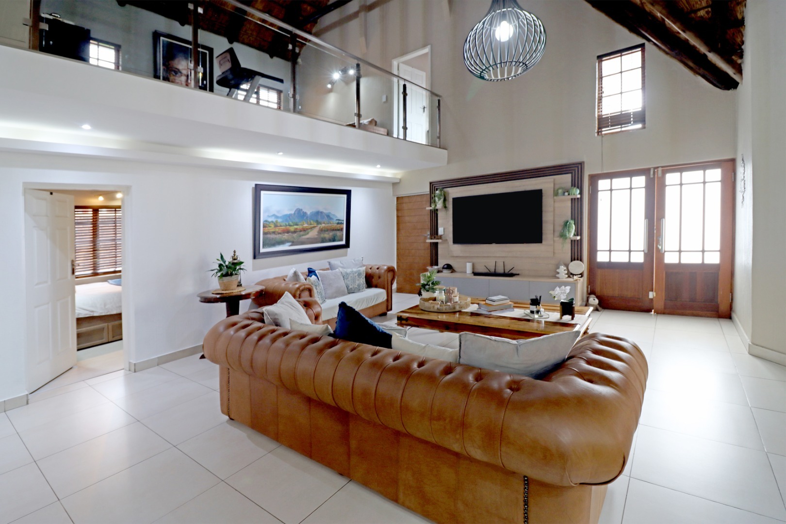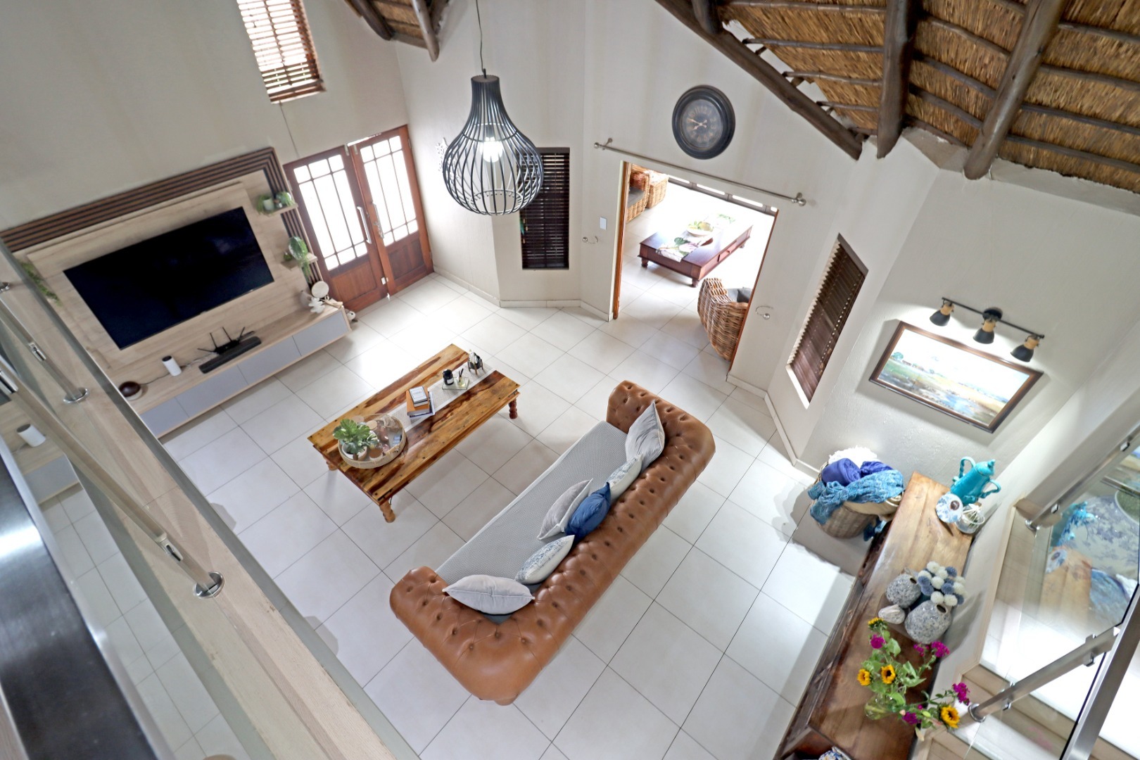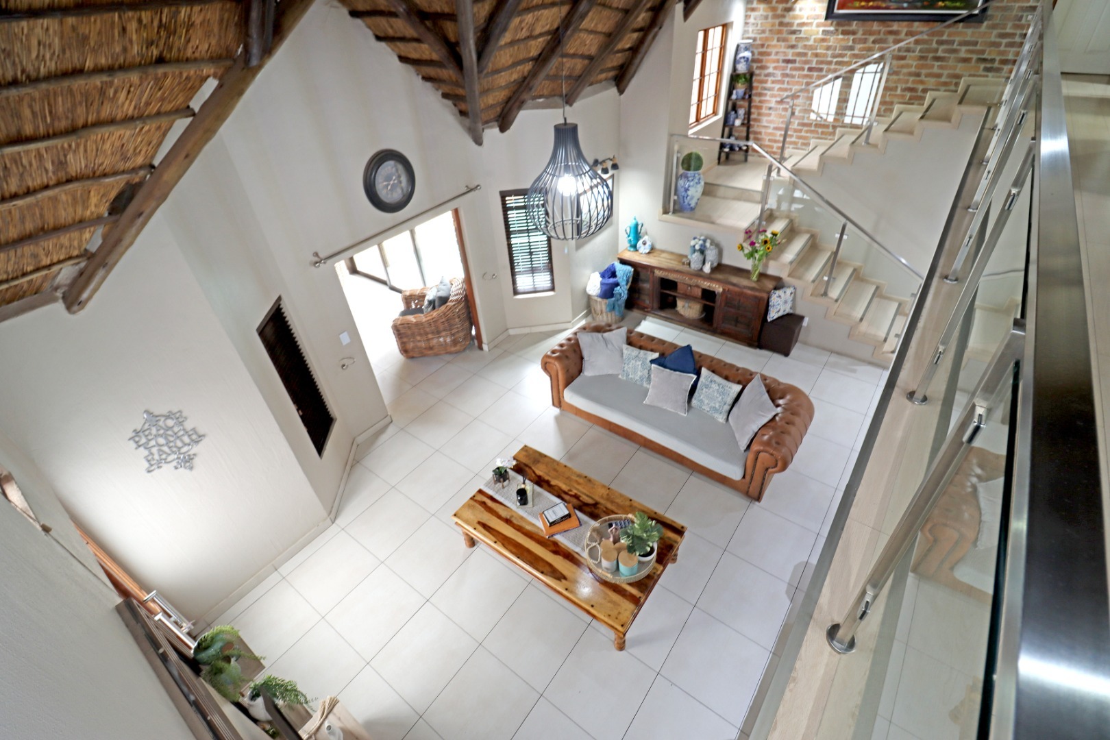 The moment you step inside, you’re greeted by an impressive open-plan layout enhanced by a soaring vaulted thatched ceiling beneath a Harvey-tile roof. Exposed beams and expansive windows create a bright, airy atmosphere. A modern glass-railed staircase leads to a versatile mezzanine space that can serve as a study, lounge, or creative work area.