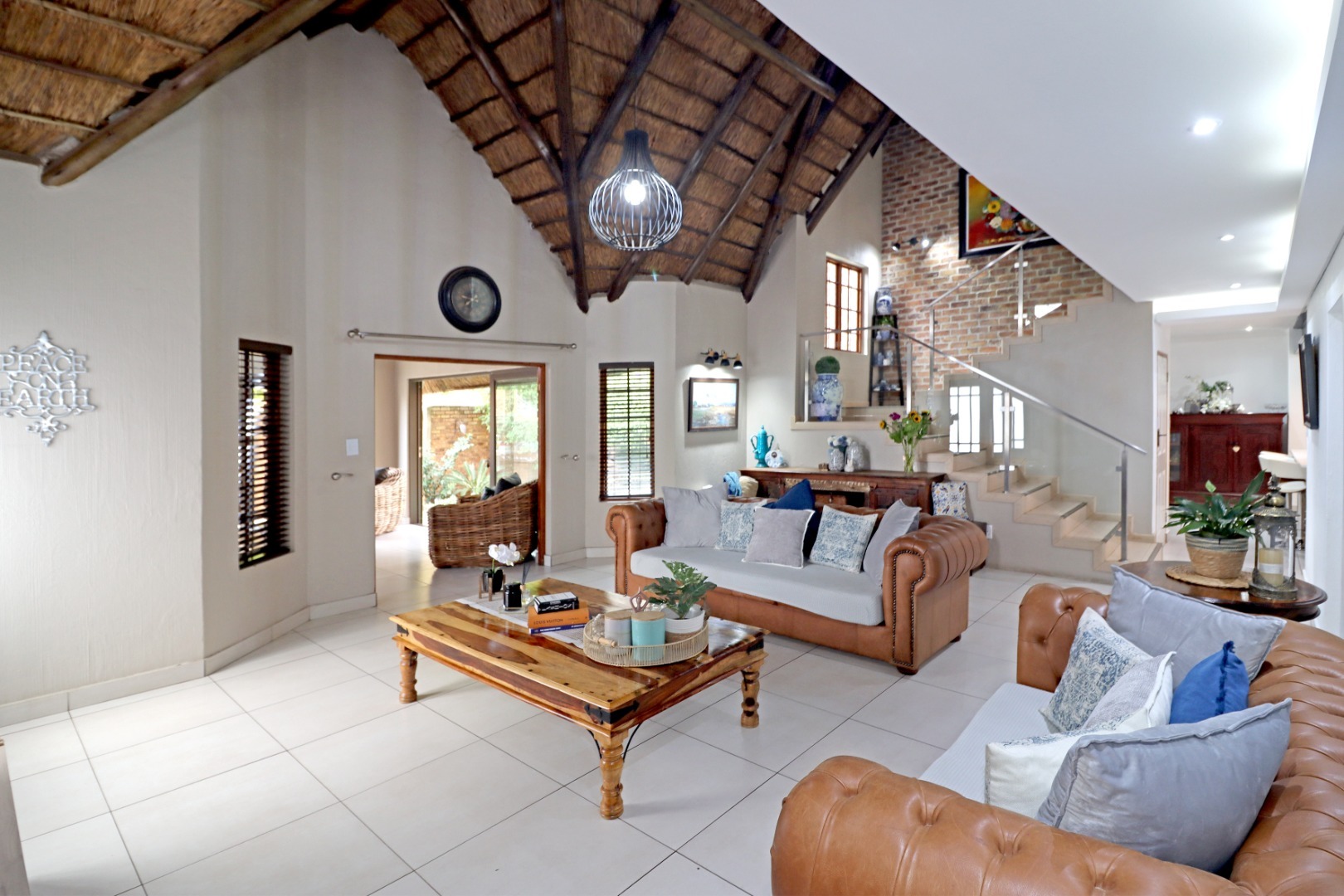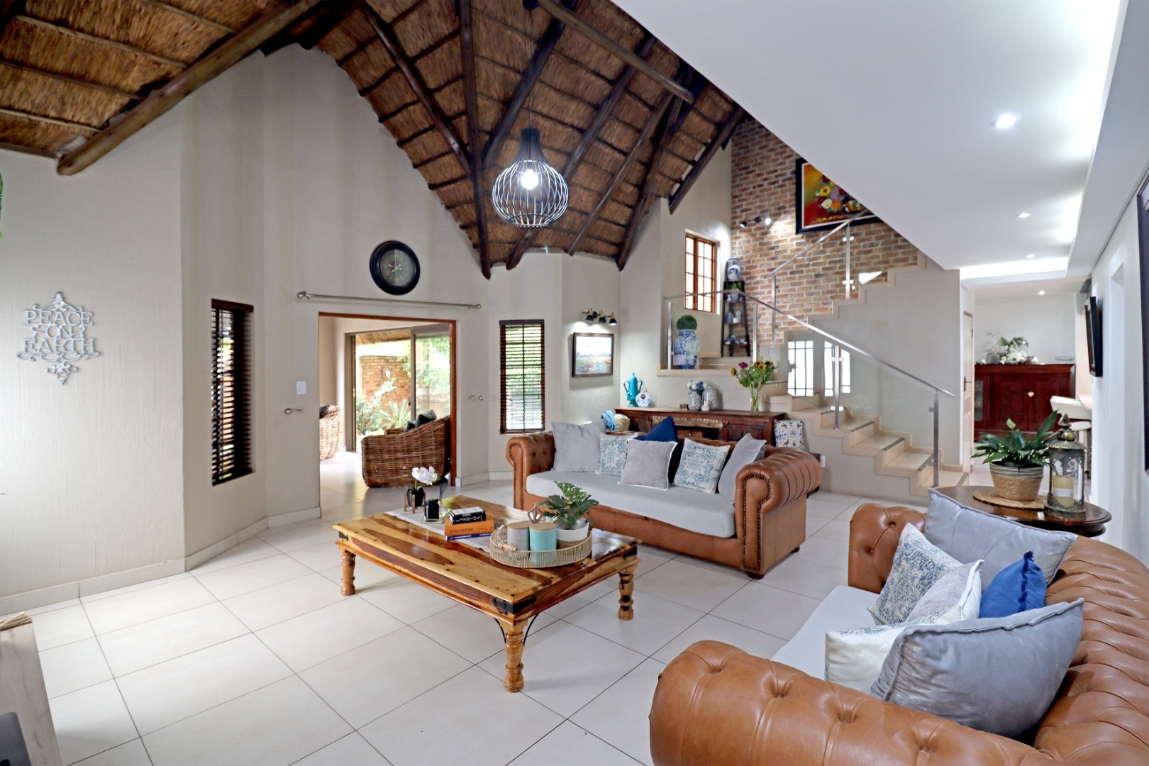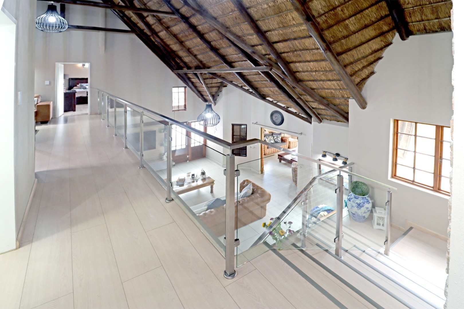 The moment you step inside, you’re greeted by an impressive open-plan layout enhanced by a soaring vaulted thatched ceiling beneath a Harvey-tile roof. Exposed beams and expansive windows create a bright, airy atmosphere. A modern glass-railed staircase leads to a versatile mezzanine space that can serve as a study, lounge, or creative work area.