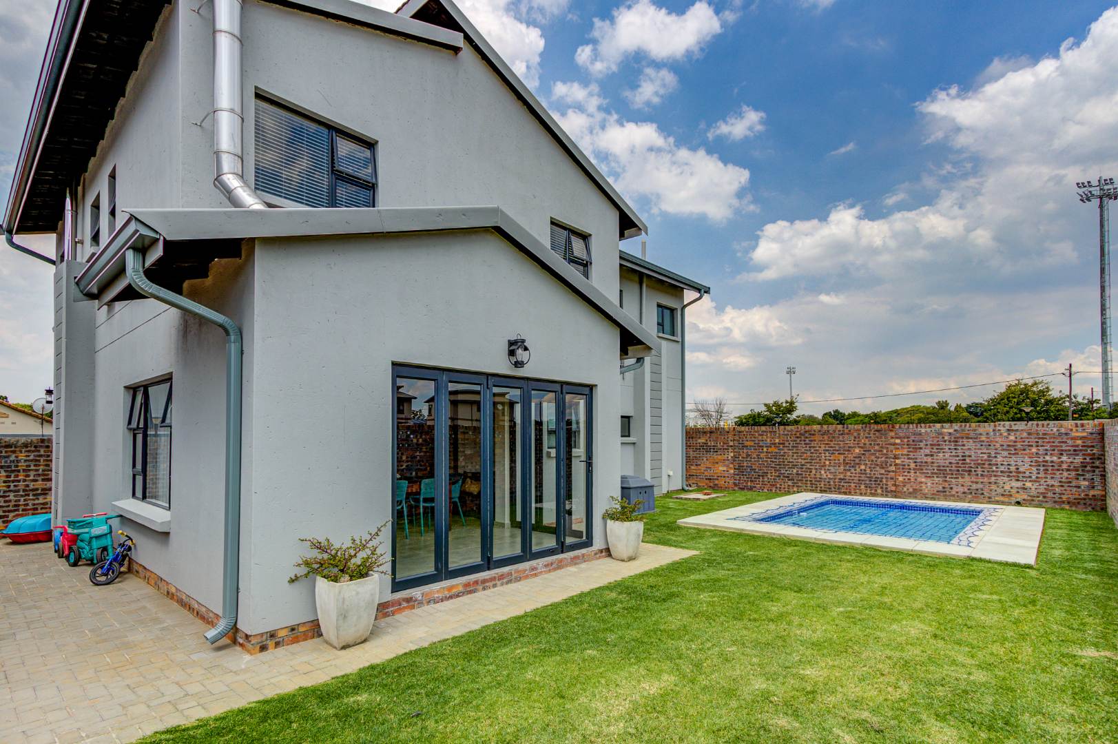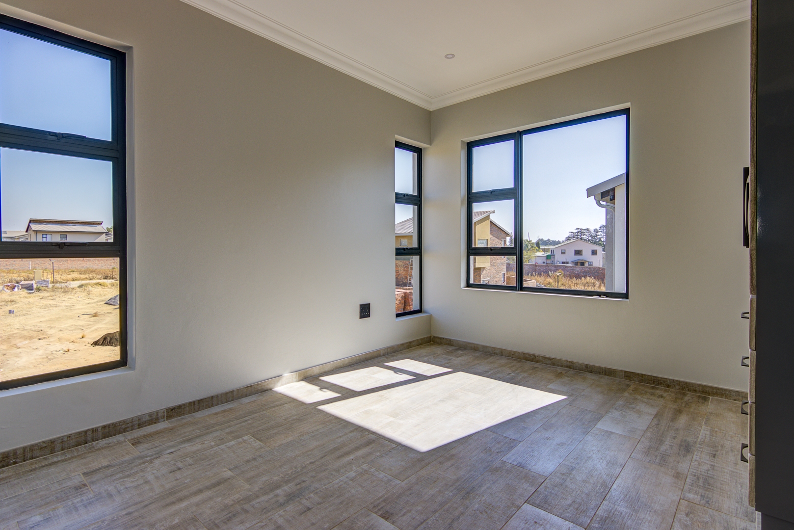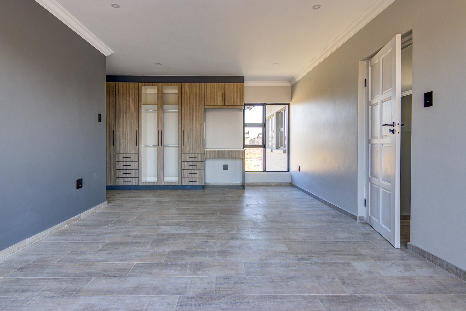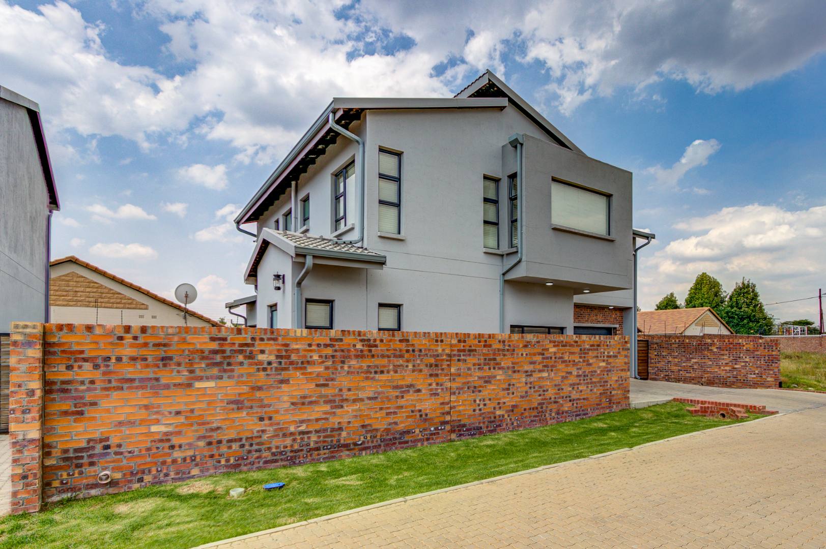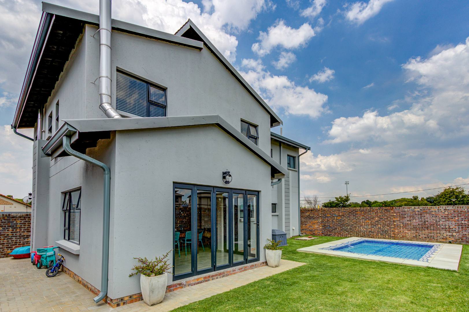 The design of the house is a coachman style, making provision for solar panels. Provision has been made for an inverter system. The north facing roof elevation is perfect for going off the grid. A very modern colour scheme with grey double roman roof tiles, set off with a stone colour plaster and charcoal aluminium window frames. The front and kitchen doors are also aluminium. Maximum usage of glass to make use of the high ceilings and abundance of natural light.