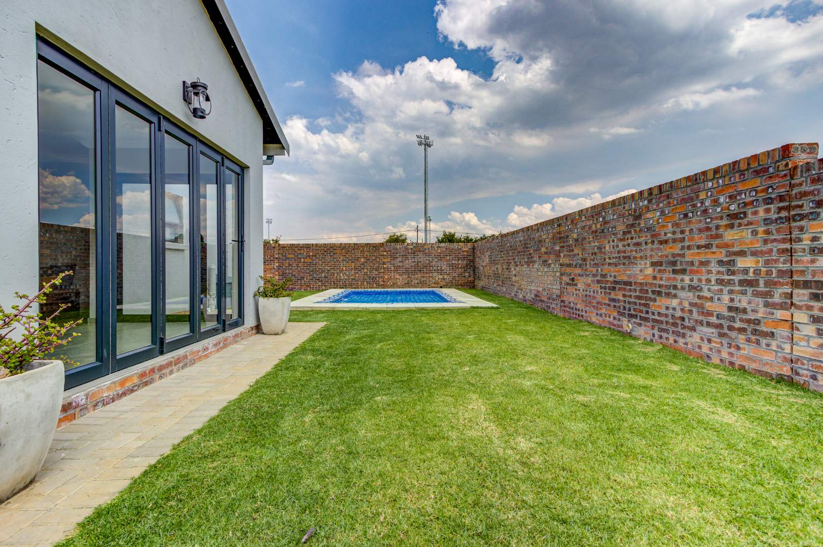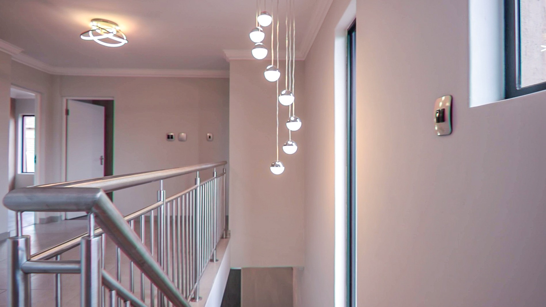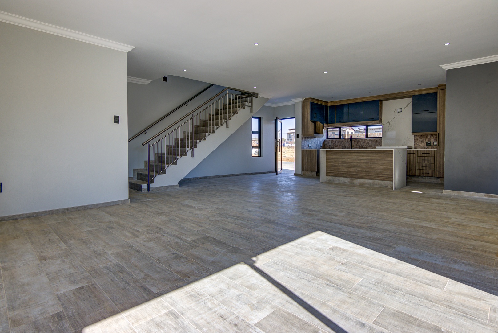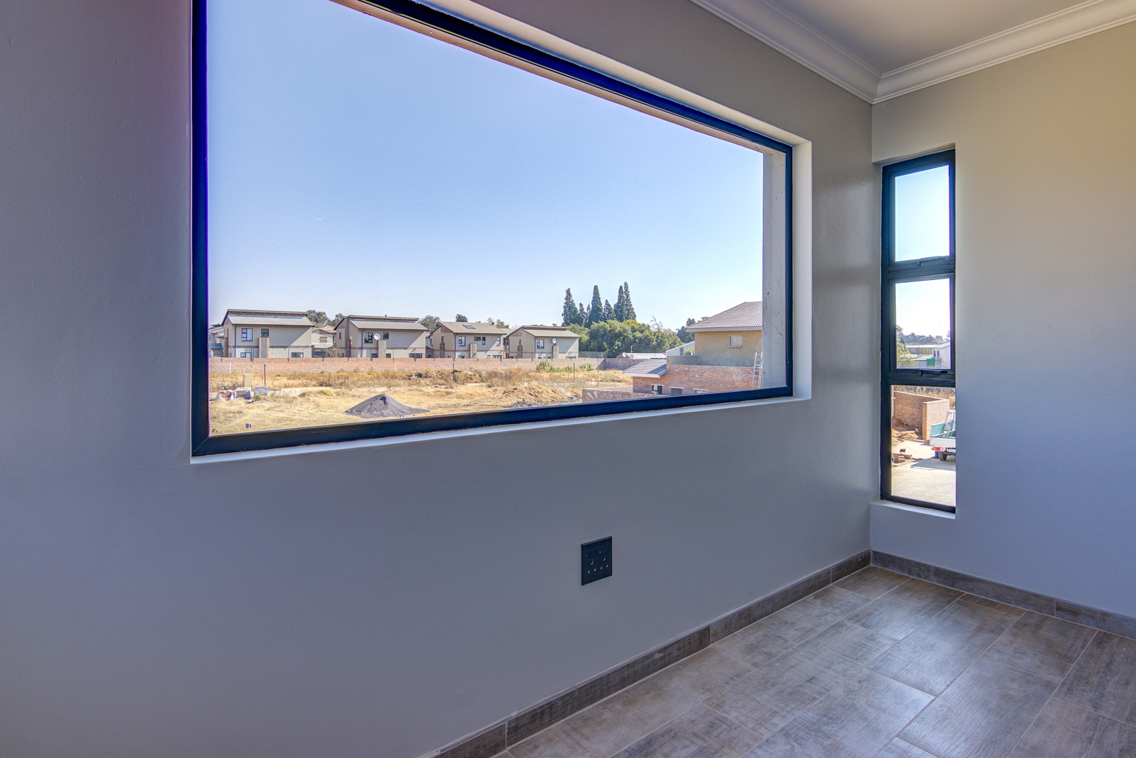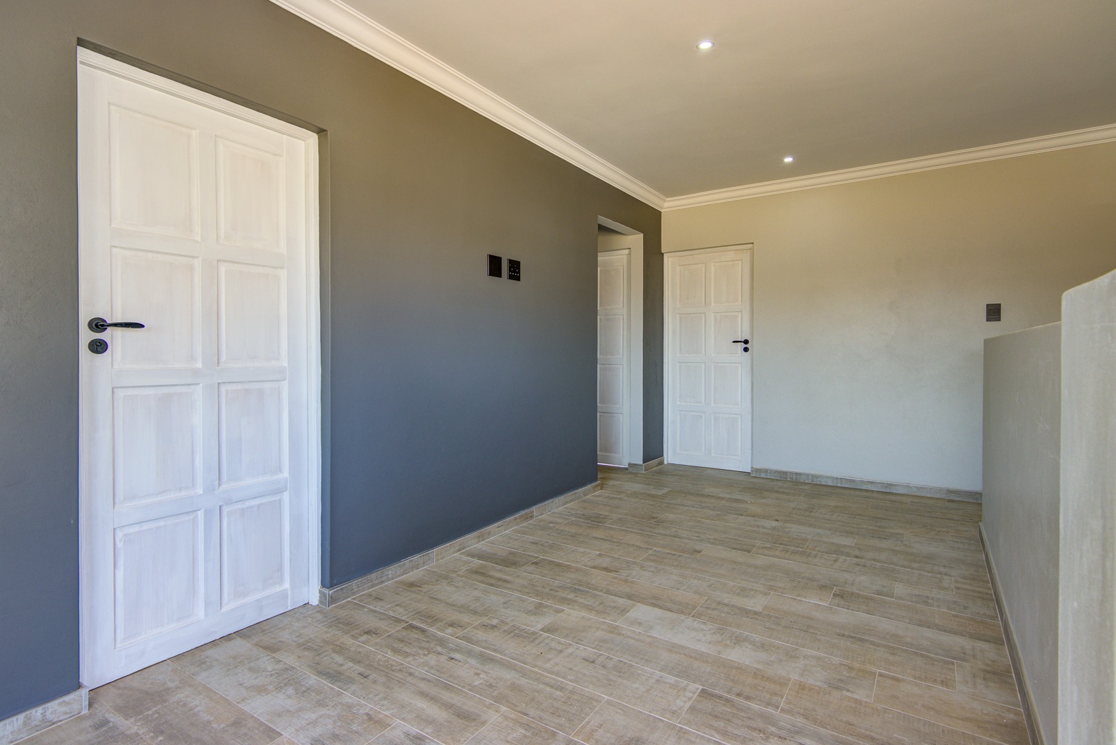 The design of the house is a coachman style, making provision for solar panels. Provision has been made for an inverter system. The north facing roof elevation is perfect for going off the grid. A very modern colour scheme with grey double roman roof tiles, set off with a stone colour plaster and charcoal aluminium window frames. The front and kitchen doors are also aluminium. Maximum usage of glass to make use of the high ceilings and abundance of natural light.