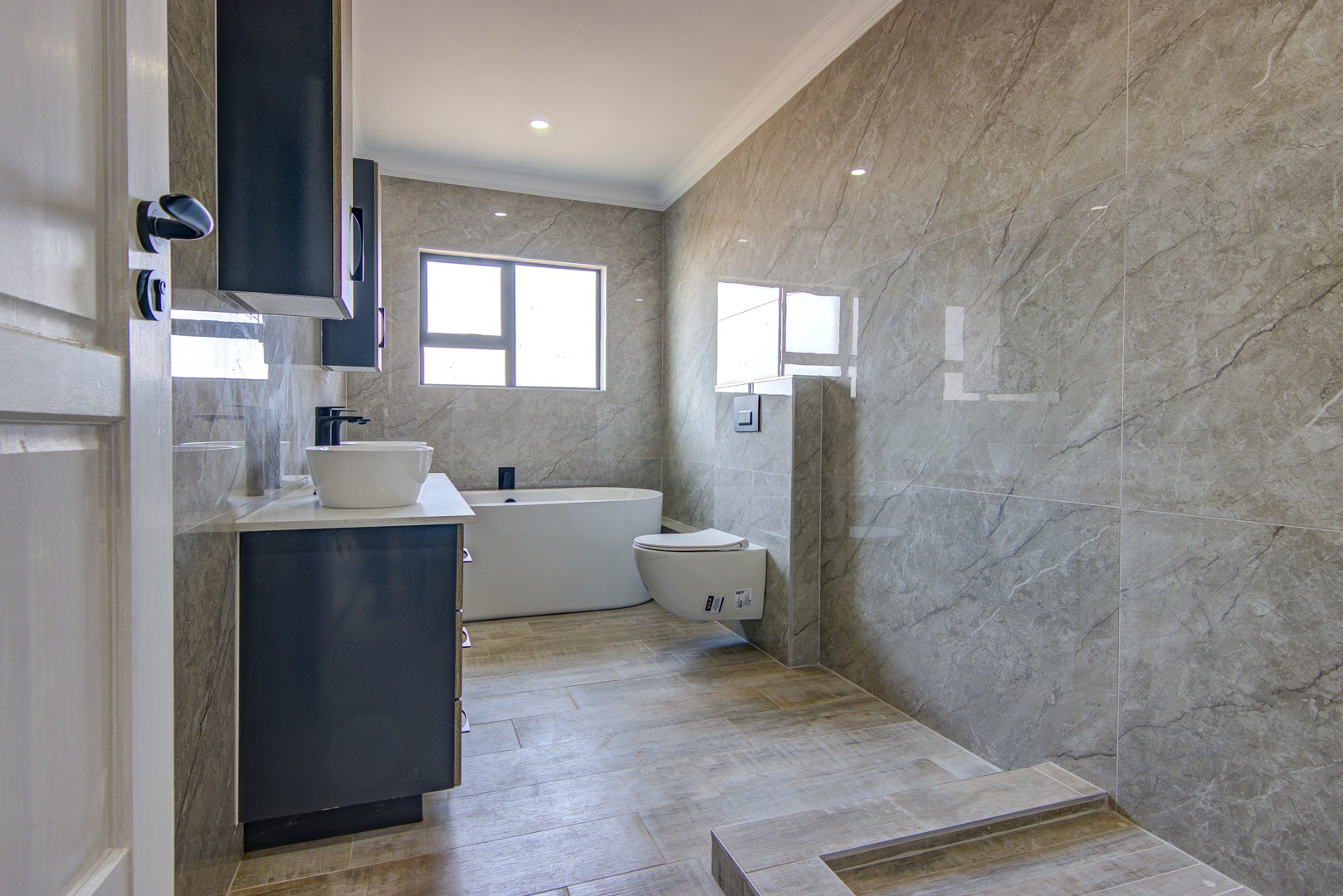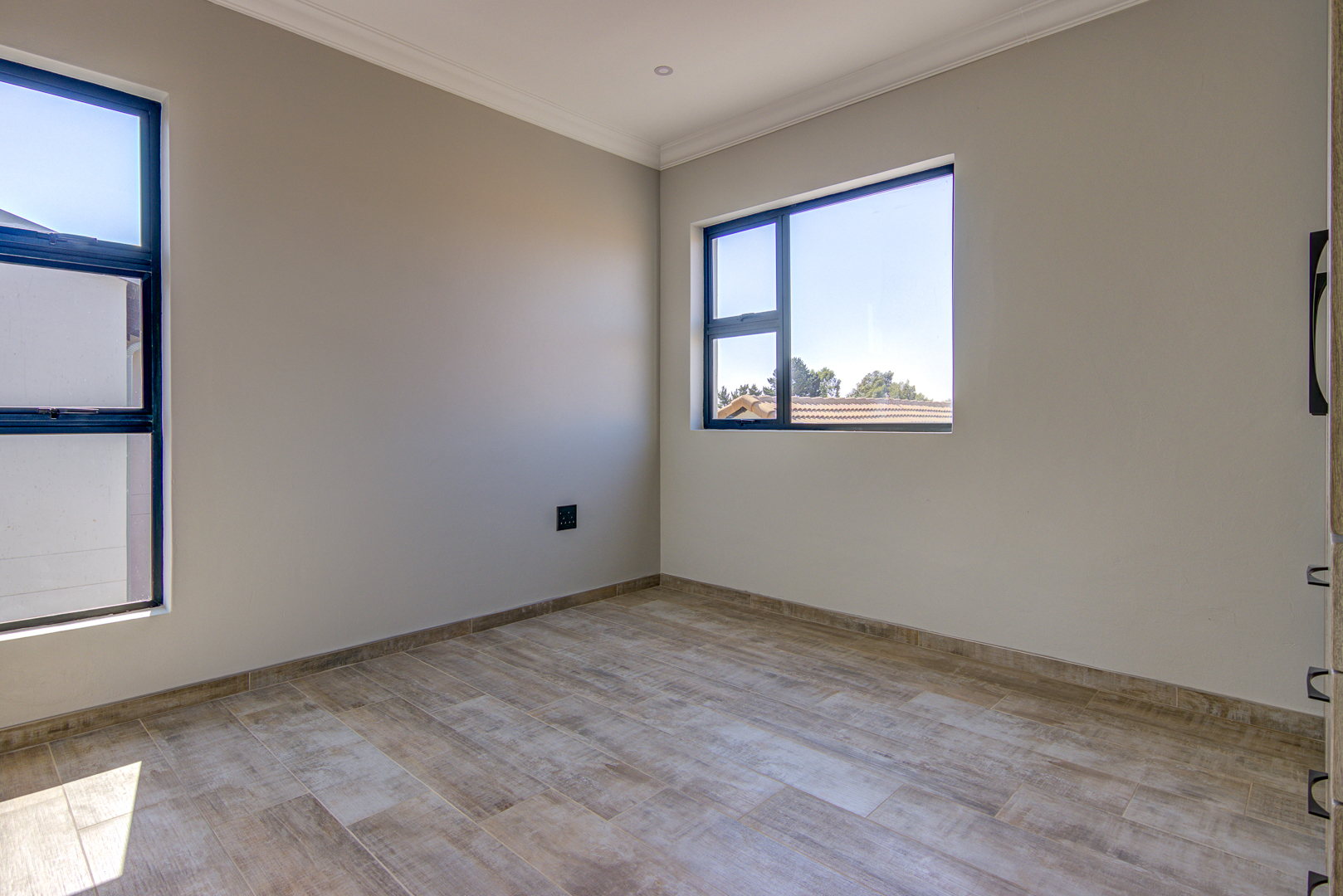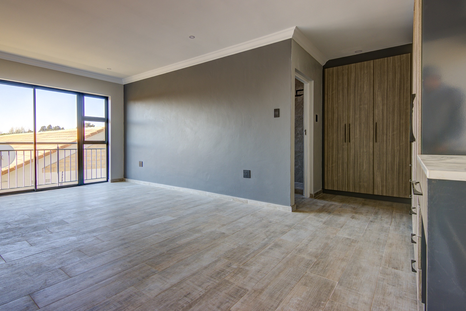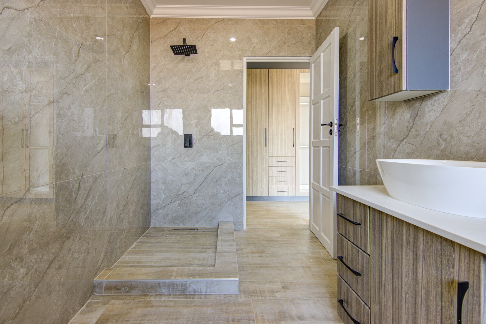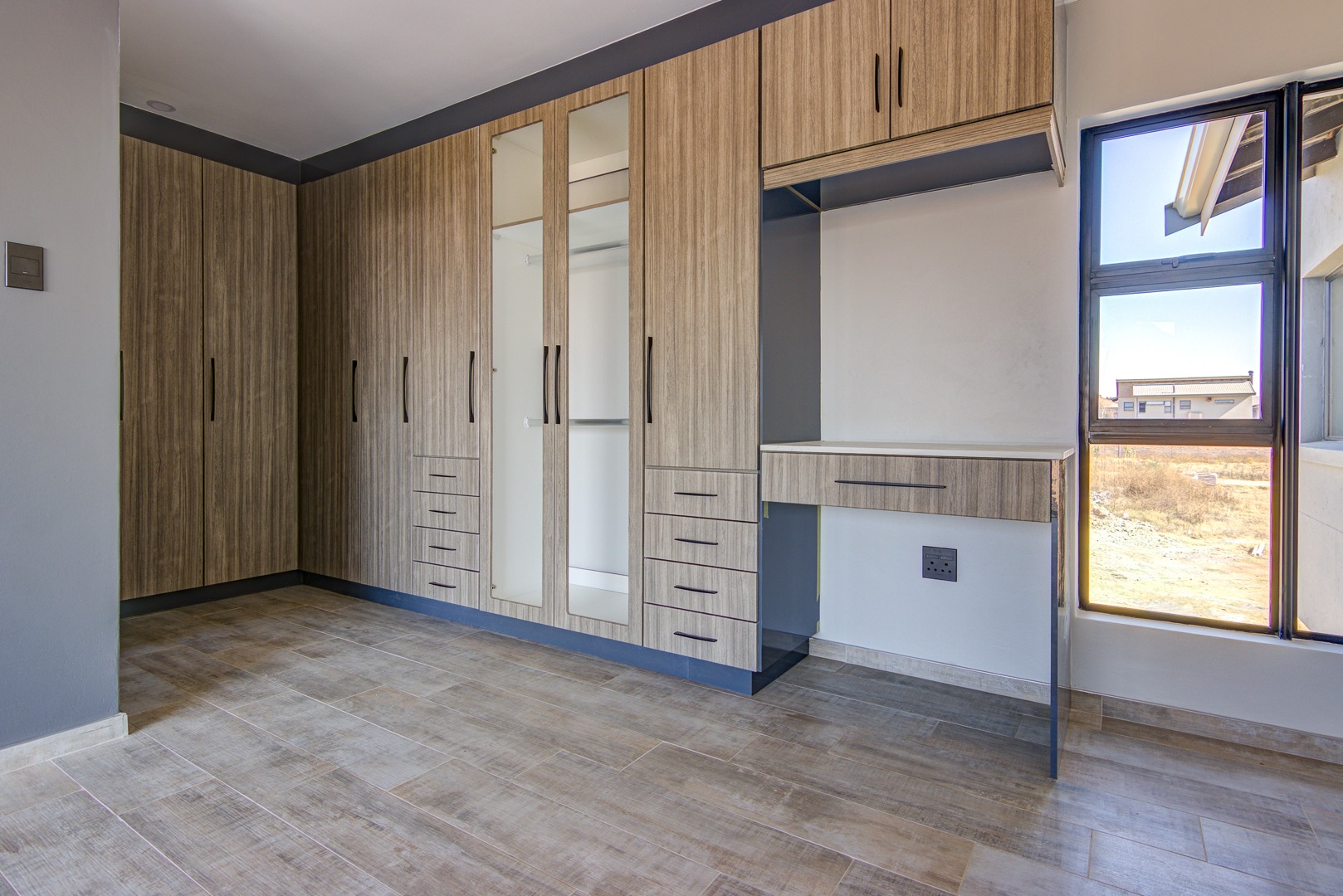 The design of the house is a coachman style, making provision for solar panels. Provision has been made for an inverter system. The north facing roof elevation is perfect for going off the grid. A very modern colour scheme with grey double roman roof tiles, set off with a stone colour plaster and charcoal aluminium window frames. The front and kitchen doors are also aluminium. Maximum usage of glass to make use of the high ceilings and abundance of natural light.
