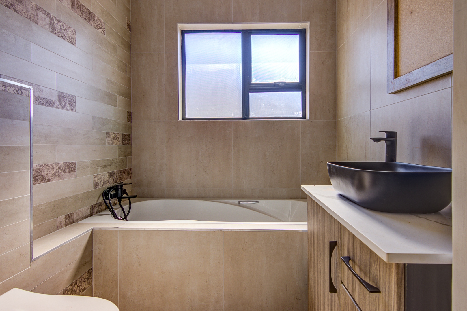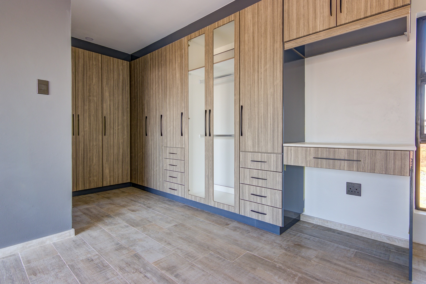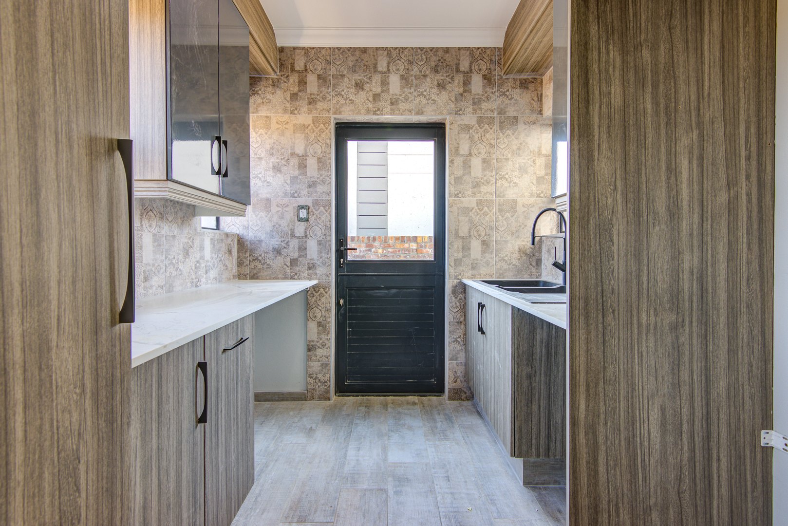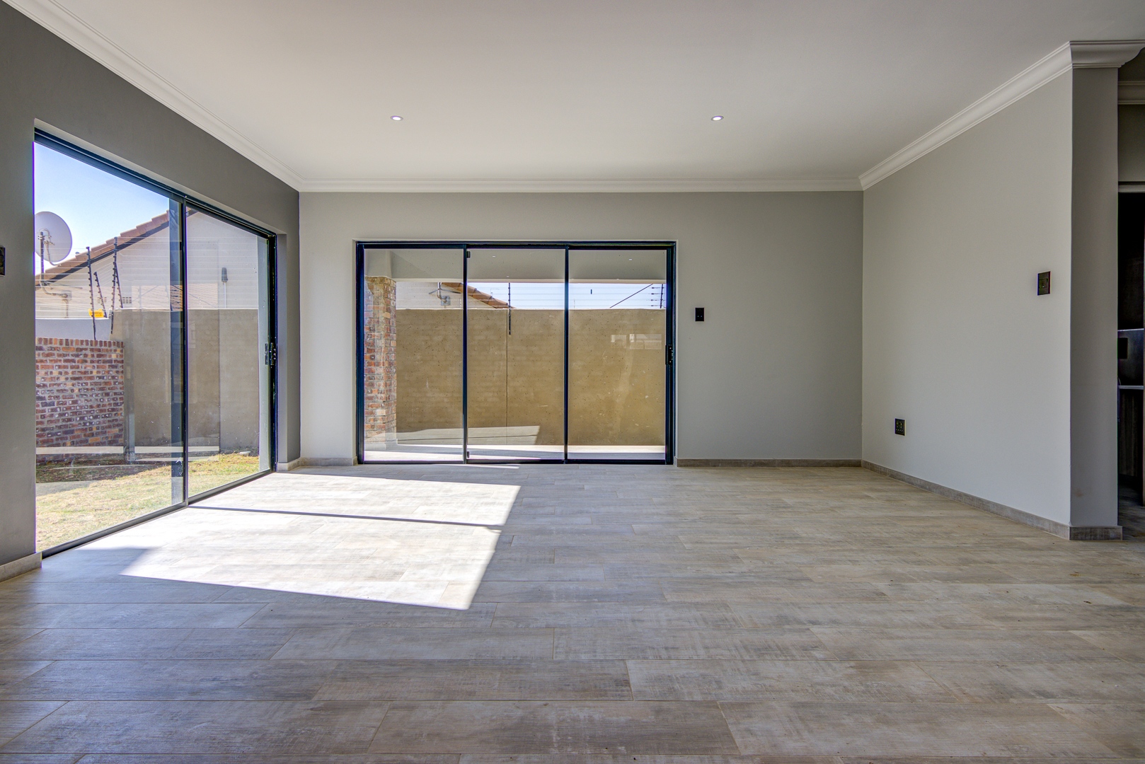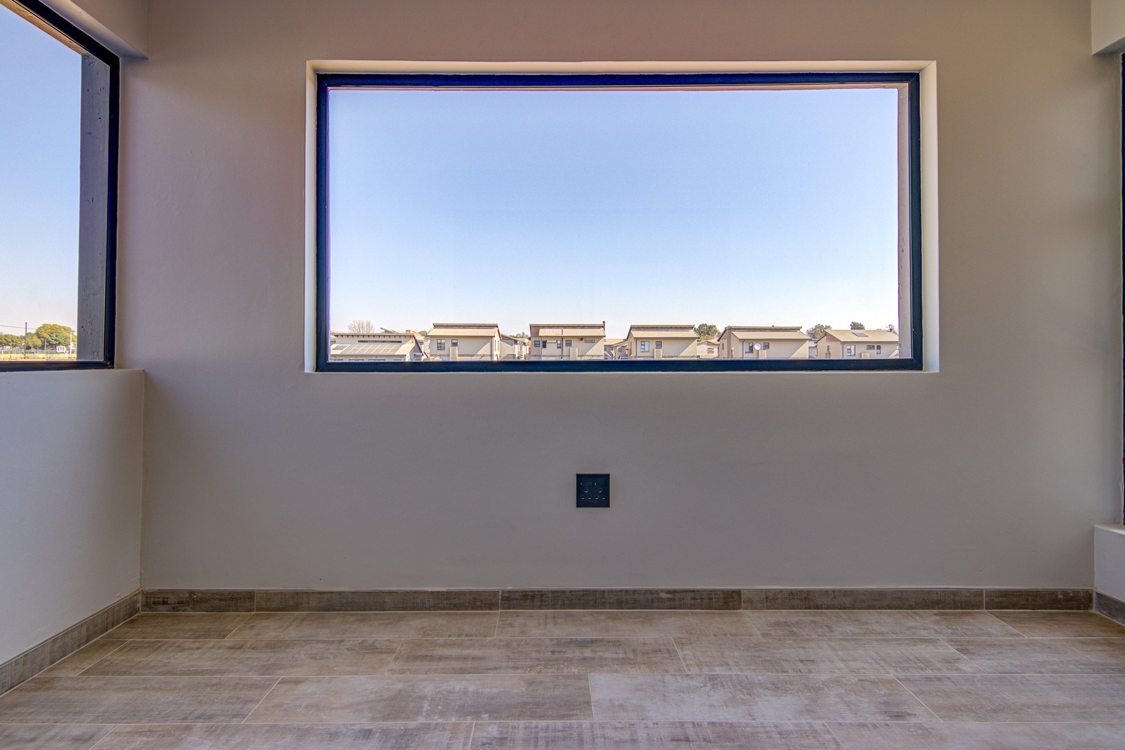 The design of the house is a coachman style, making provision for solar panels. Provision has been made for an inverter system. The north facing roof elevation is perfect for going off the grid. A very modern colour scheme with grey double roman roof tiles, set off with a stone colour plaster and charcoal aluminium window frames. The front and kitchen doors are also aluminium. Maximum usage of glass to make use of the high ceilings and abundance of natural light.