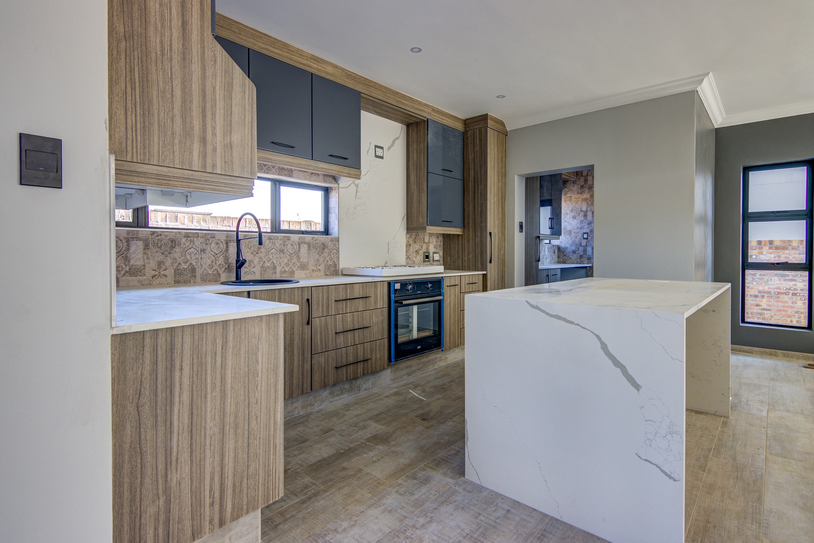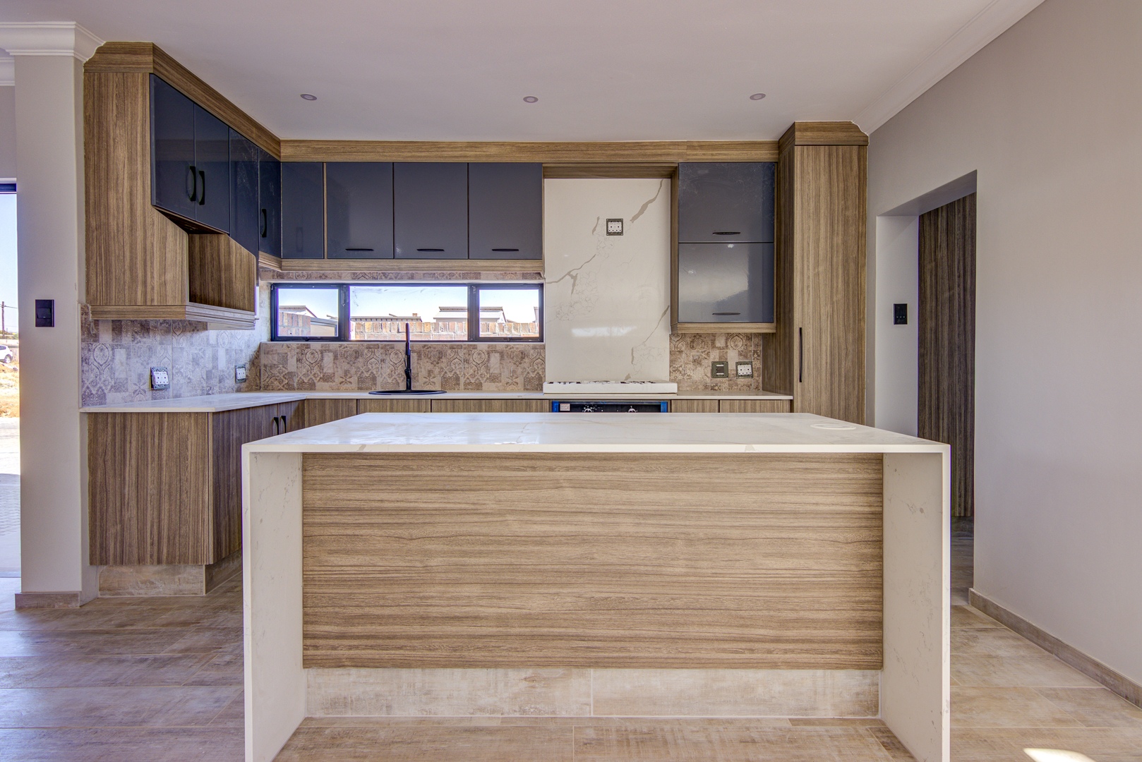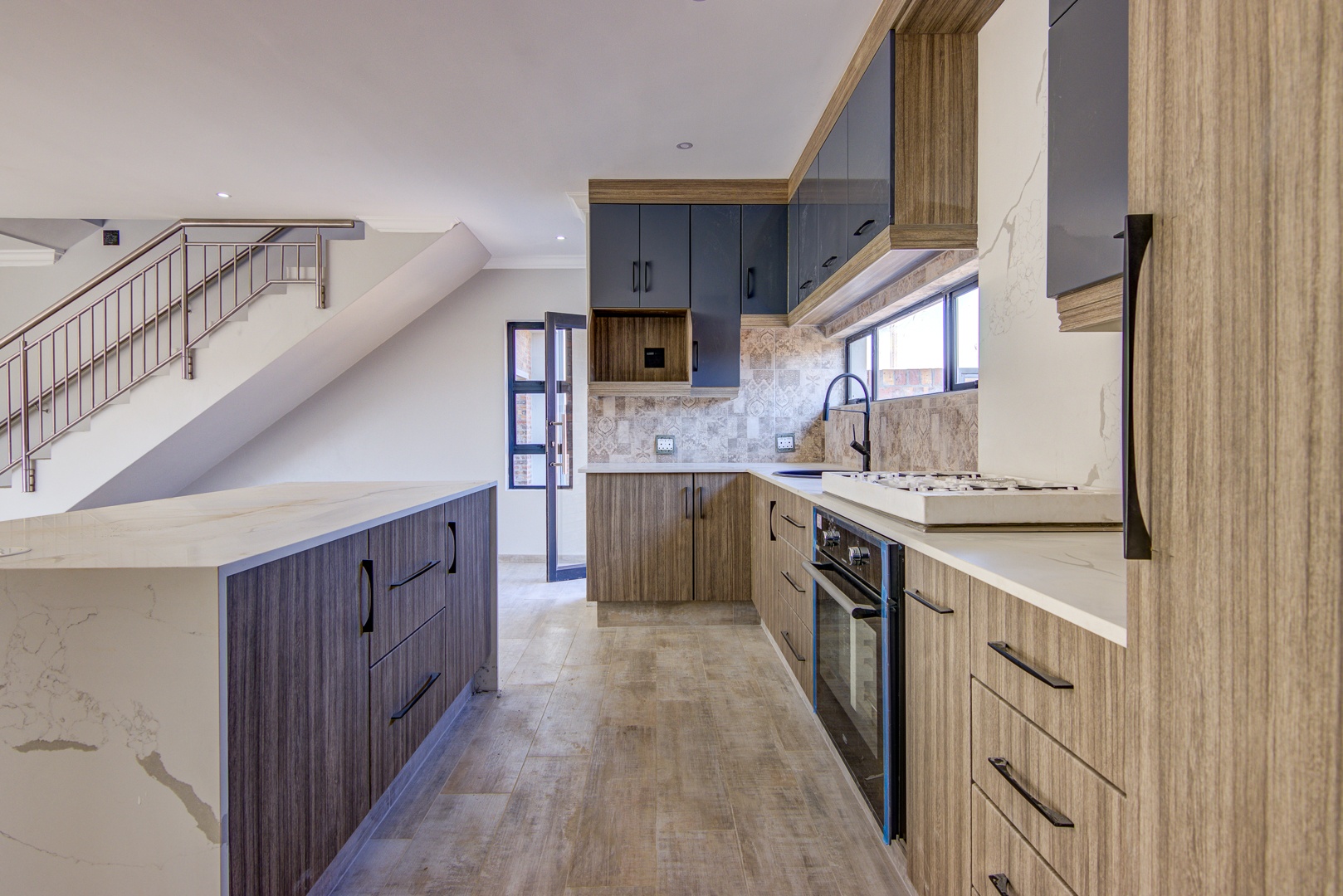 The kitchen is state of the art with your own choice of cabinet colours with cupboards to the ceiling. Counter tops are sigma quartz. Modern island with a gas hob.