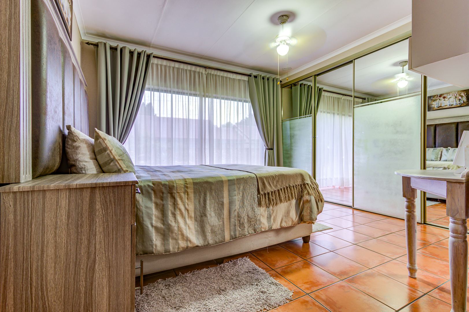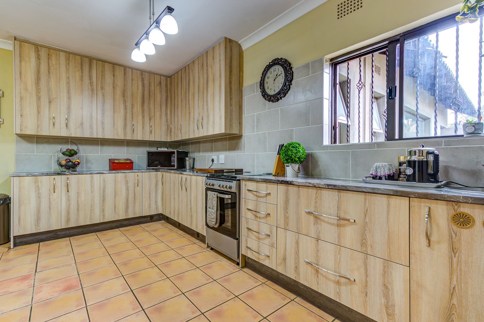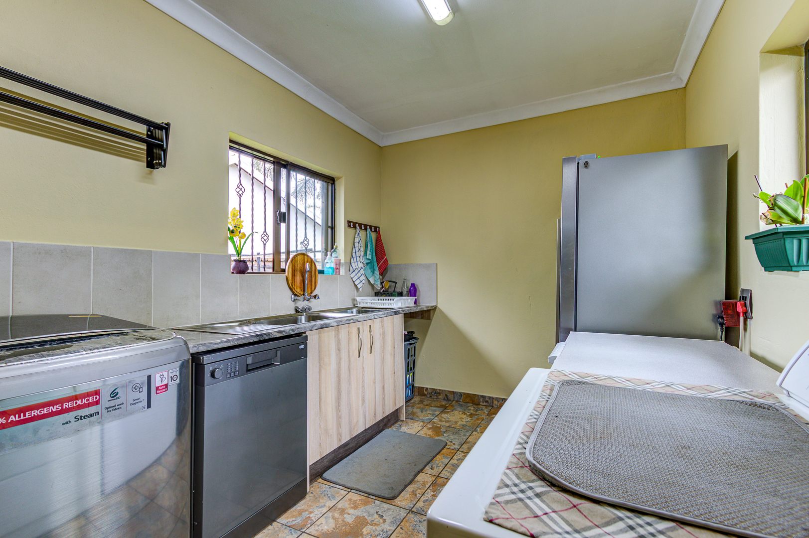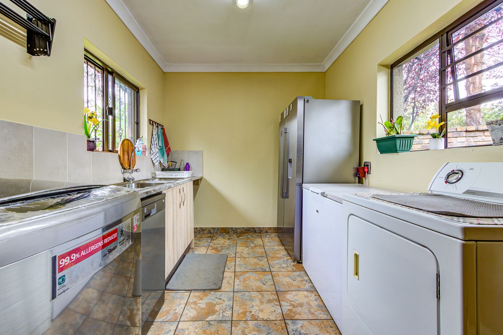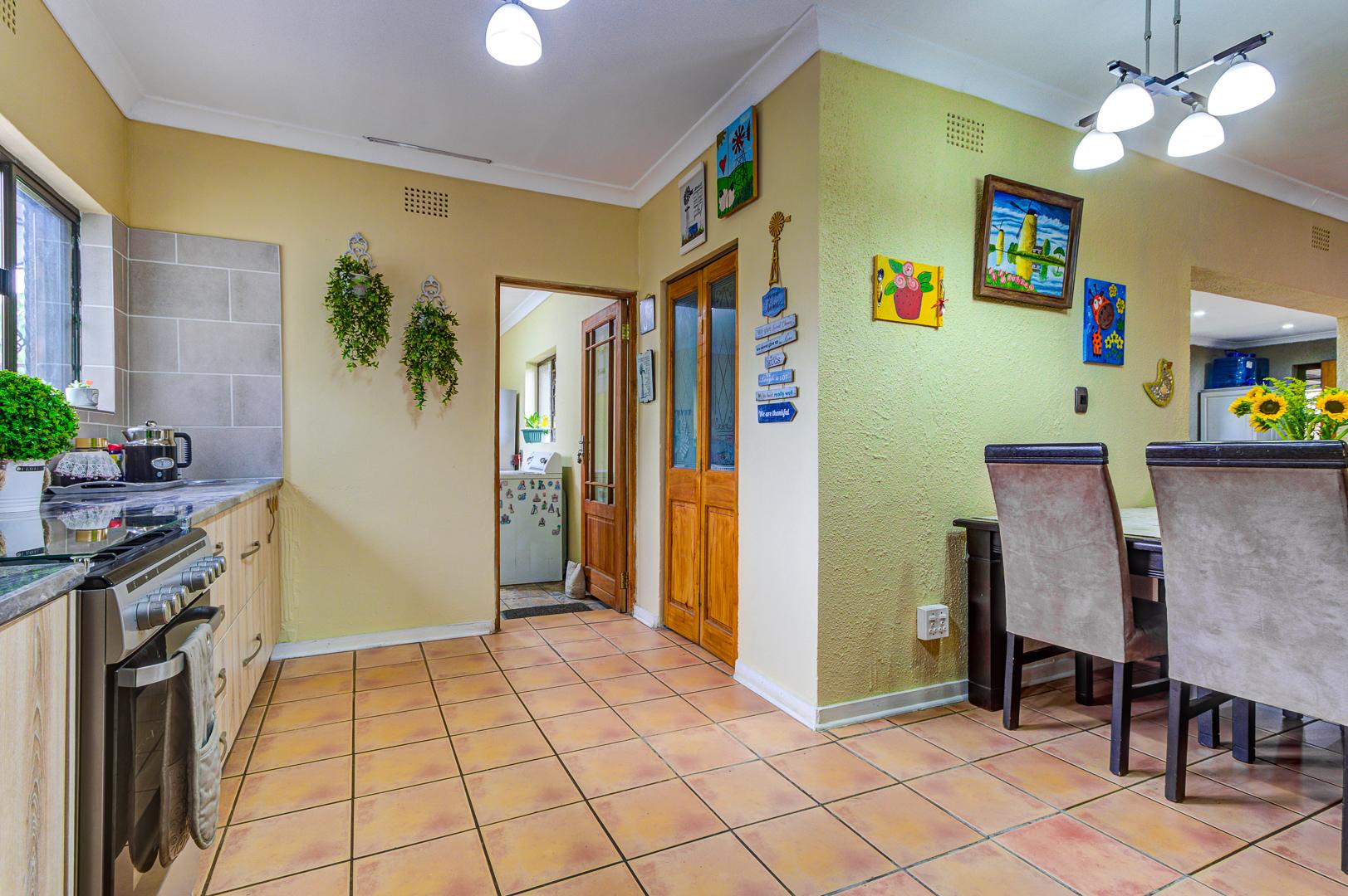 The well designed open plan kitchen offers lots of cupboards, gas stove, walk in pantry, separate scullery and laundry area. For all those garden enthusiasts there is a lovely veggie garden when you step out the back door.