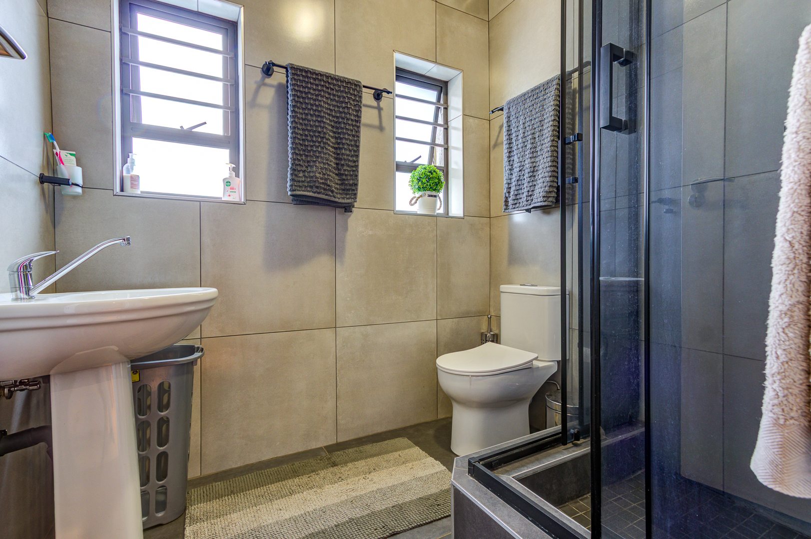 All lights are LED with battery back up switches during load shedding. There is also a generator to assist during load shedding. There is a gas geyser and electric geyser.