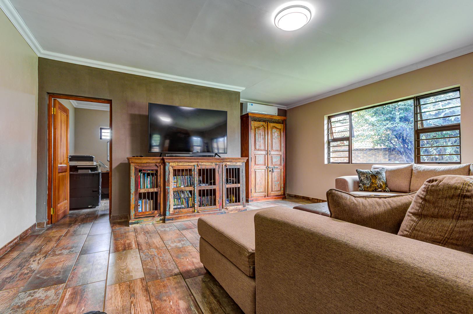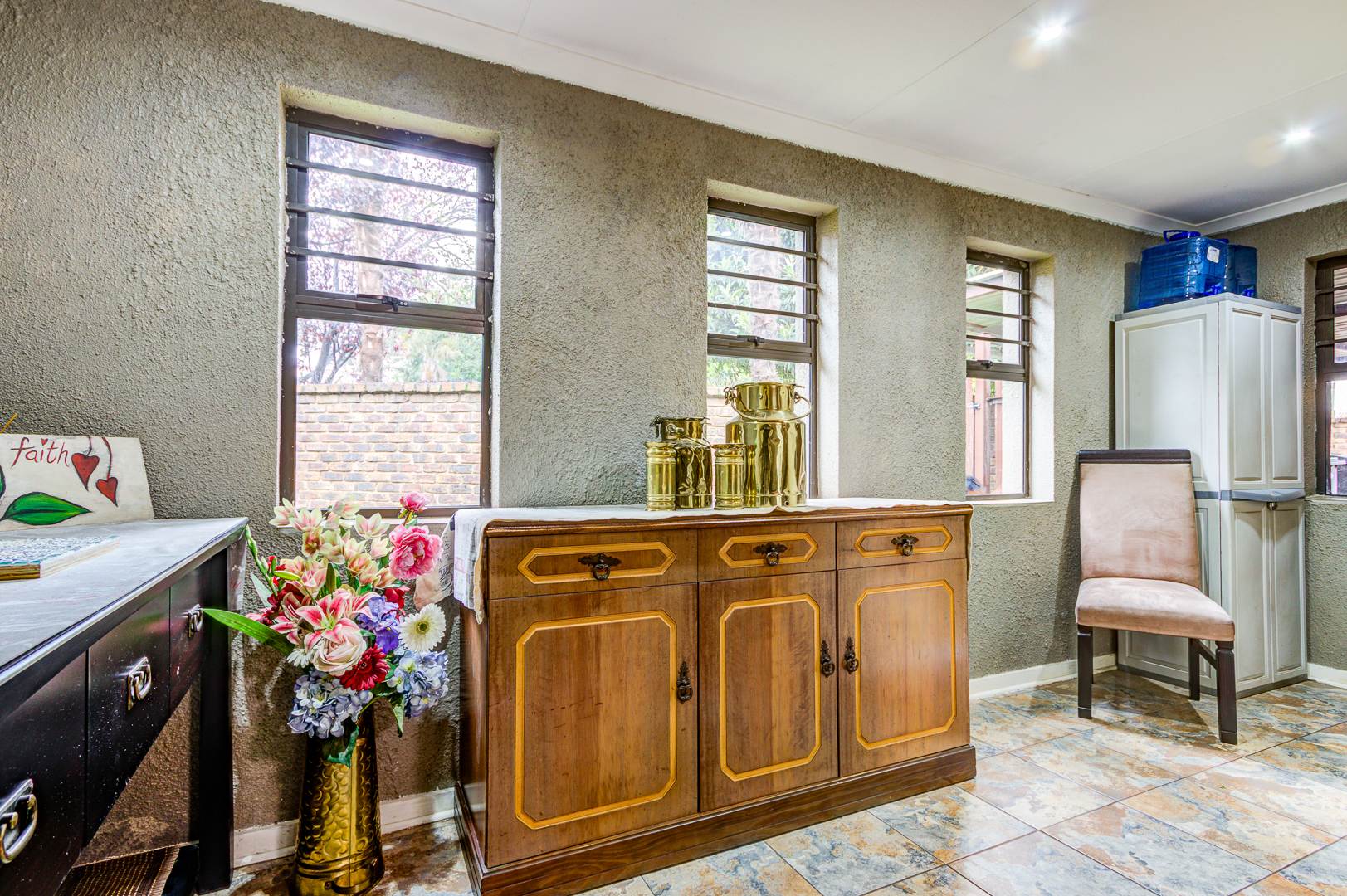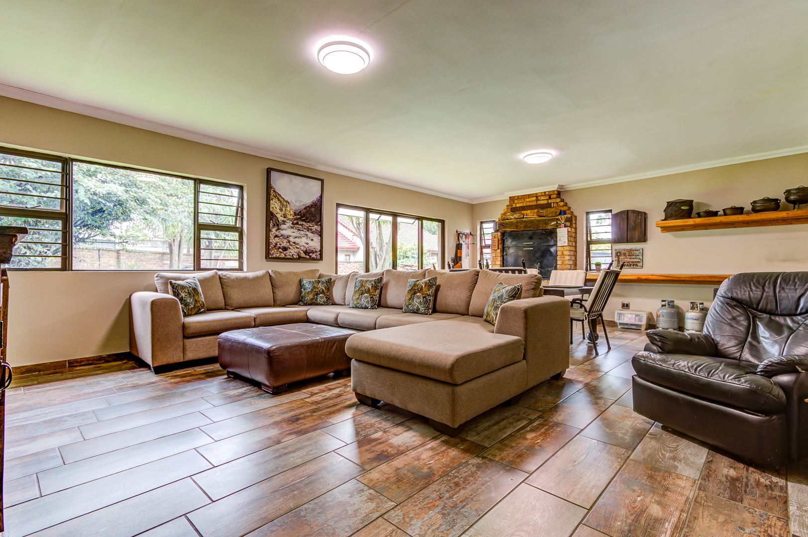 Beautiful and neat this home offers spacious open plan tiled living areas comprising of family lounge, inside entertainment room with built in jet master braai which can be used inside or outside, additional family tv room and dining area. There are aluminium windows with laminated glass throughout the home.