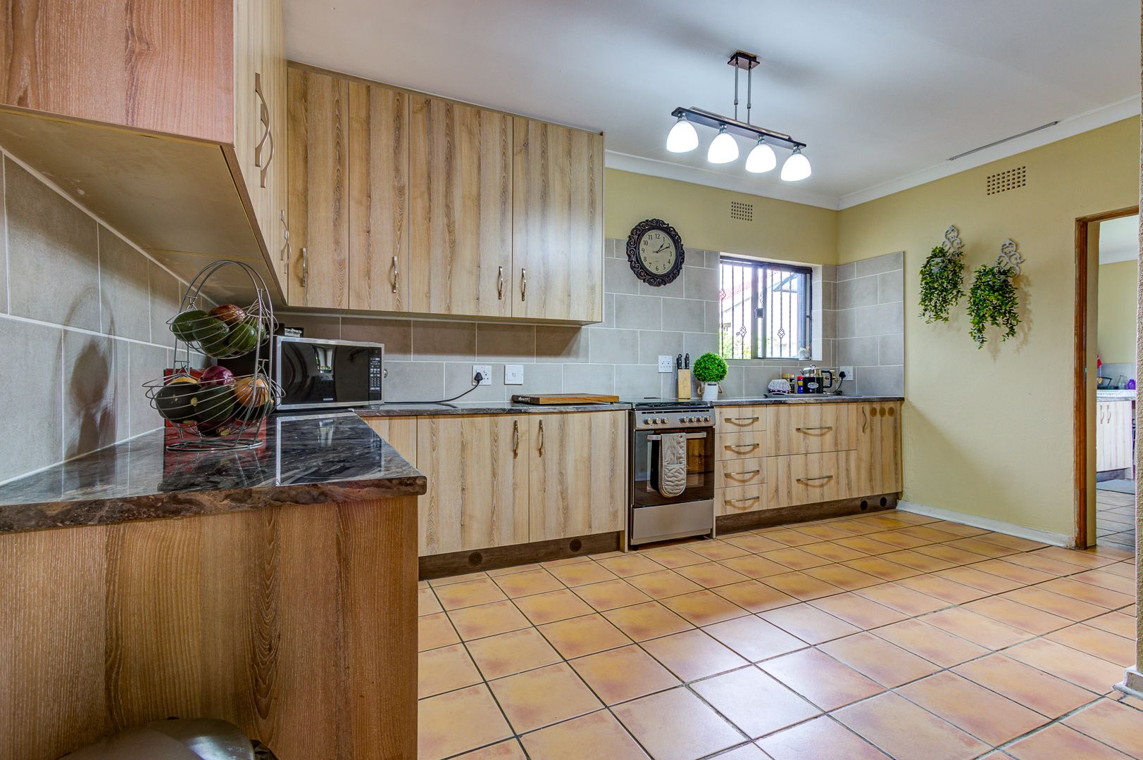 The well designed open plan kitchen offers lots of cupboards, gas stove, walk in pantry, separate scullery and laundry area. For all those garden enthusiasts there is a lovely veggie garden when you step out the back door.
