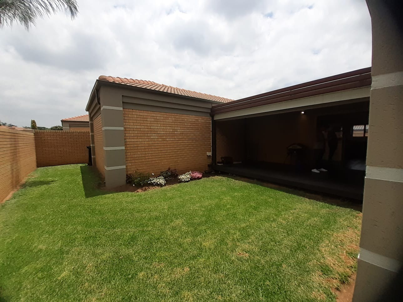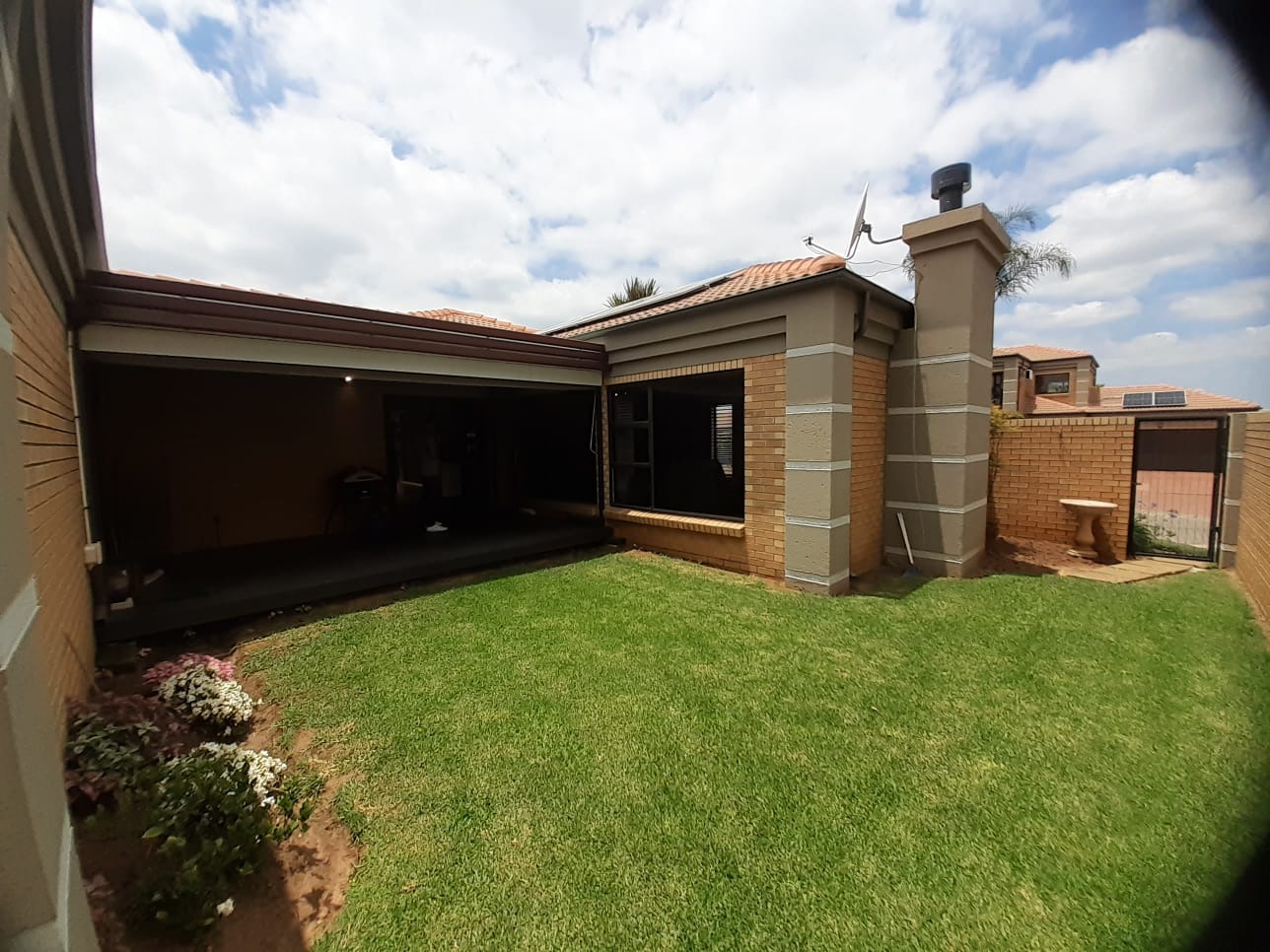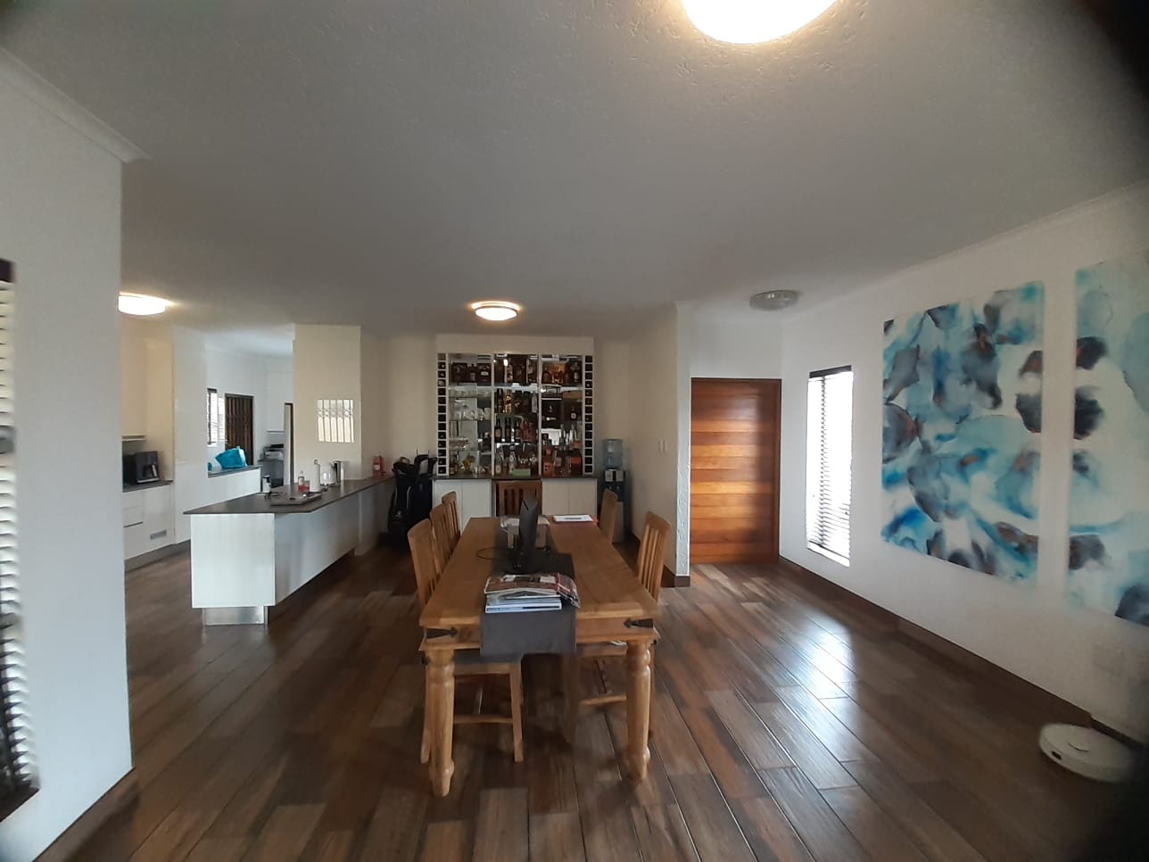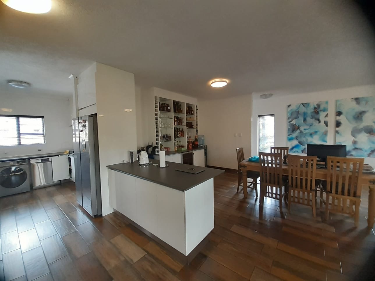 This distinguished residential property, situated within a secure estate in Bartletts, Boksburg, presents an impeccable exterior with a paved driveway leading to a double garage and a meticulously maintained garden. Upon entry, the residence reveals a spacious open-plan interior, characterized by contemporary wood-look tiled flooring and abundant natural light, seamlessly connecting the lounge, dining area, and kitchen.