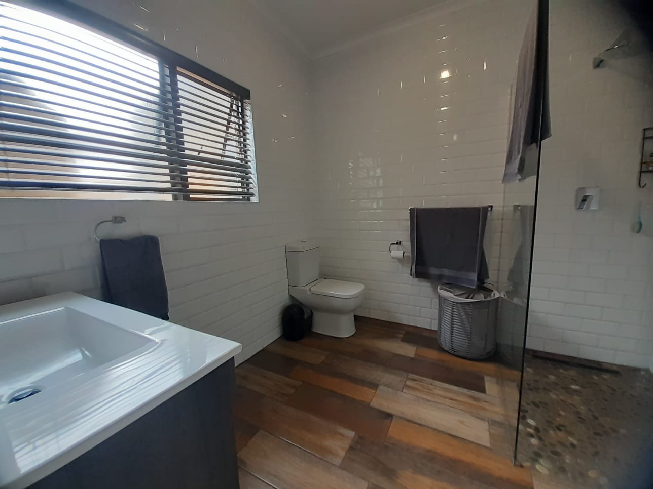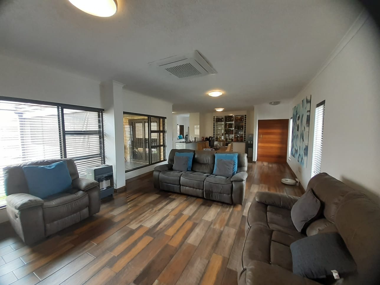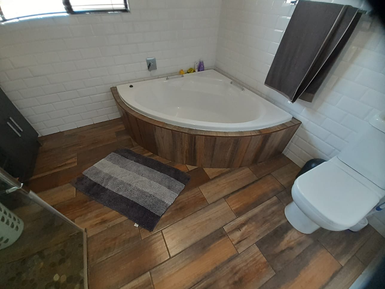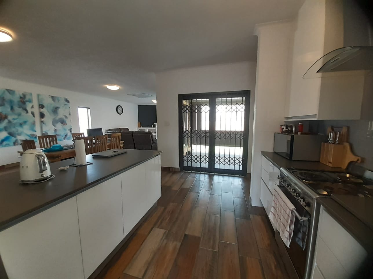 This distinguished residential property, situated within a secure estate in Bartletts, Boksburg, presents an impeccable exterior with a paved driveway leading to a double garage and a meticulously maintained garden. Upon entry, the residence reveals a spacious open-plan interior, characterized by contemporary wood-look tiled flooring and abundant natural light, seamlessly connecting the lounge, dining area, and kitchen.