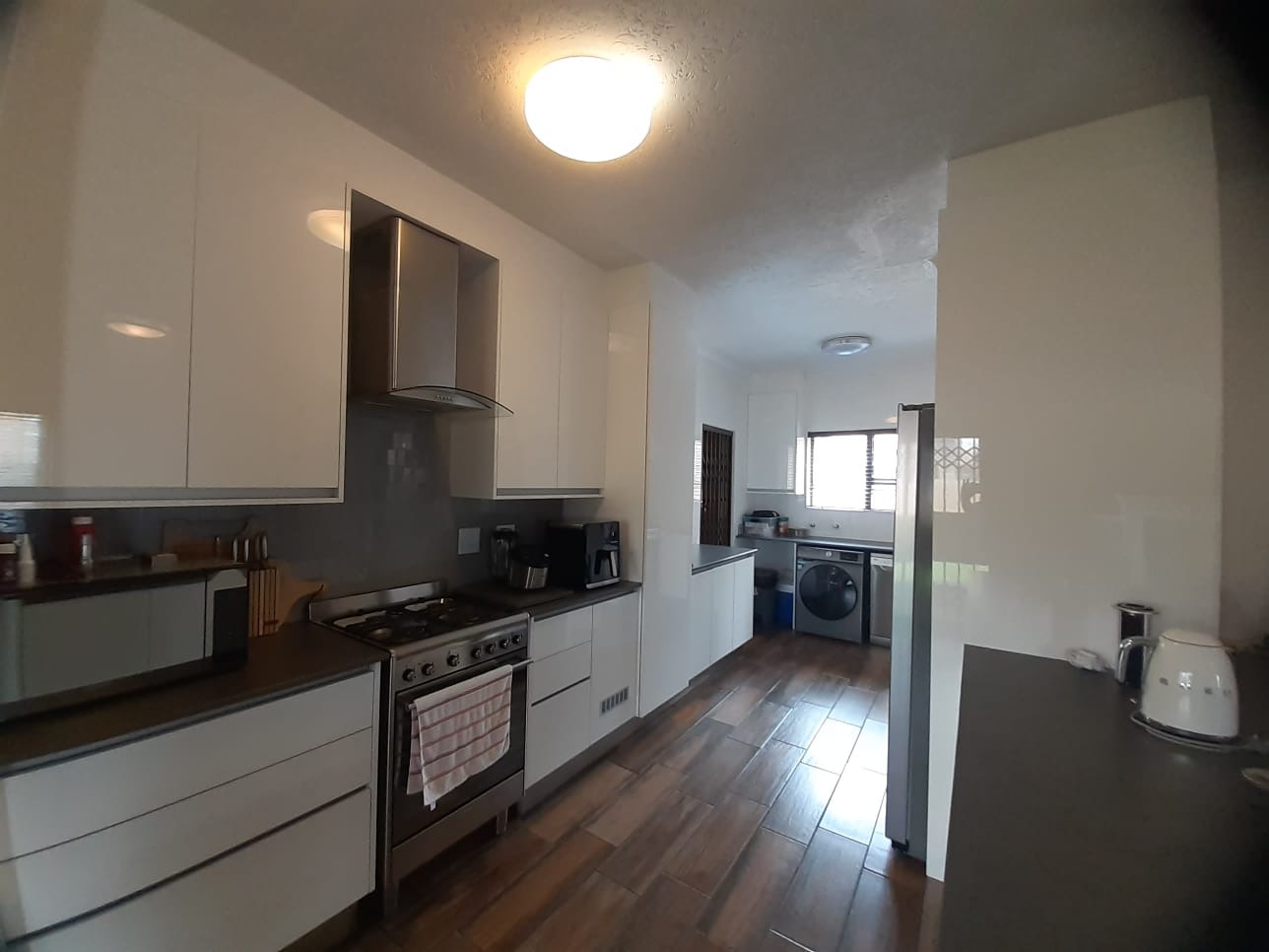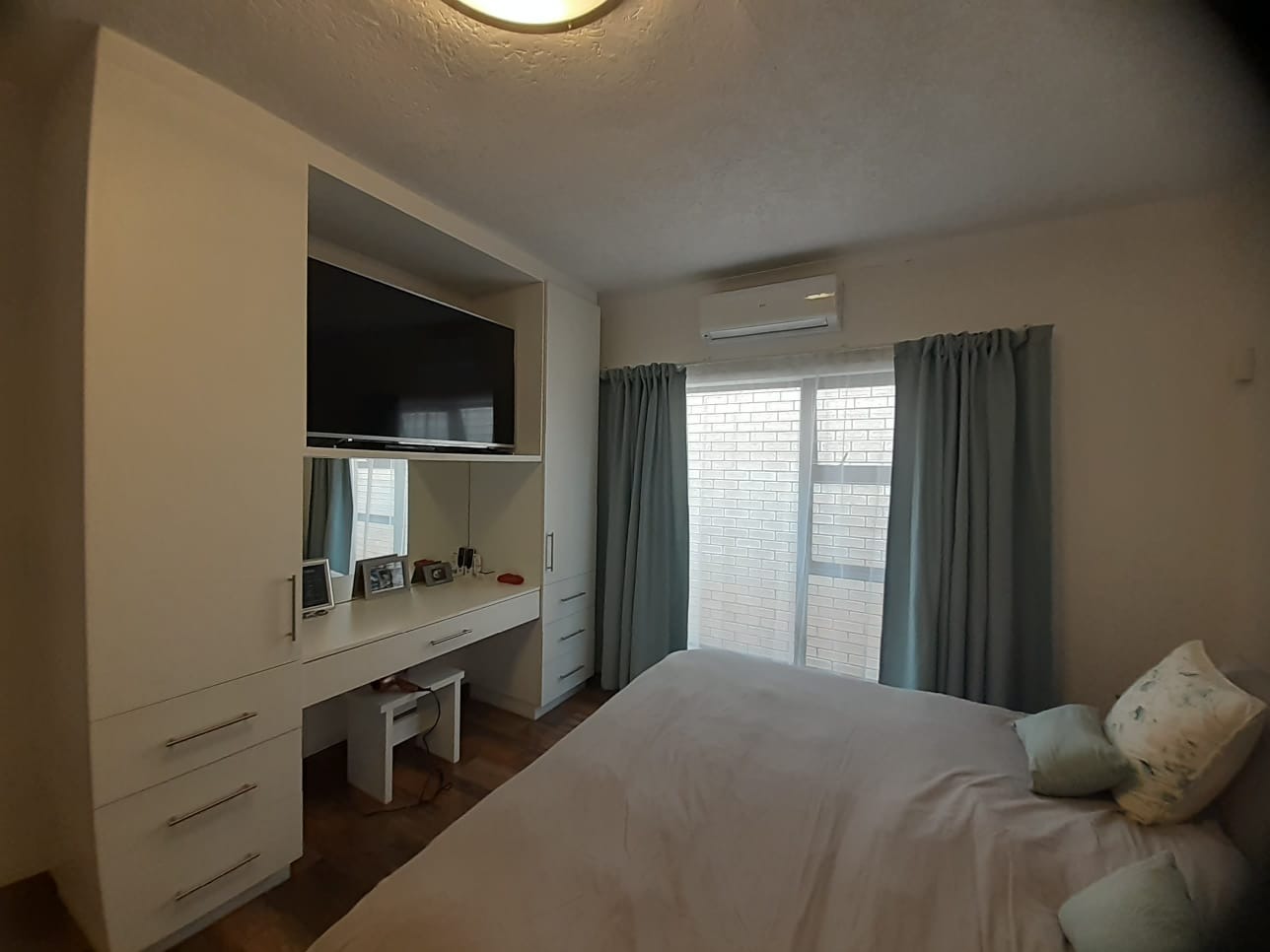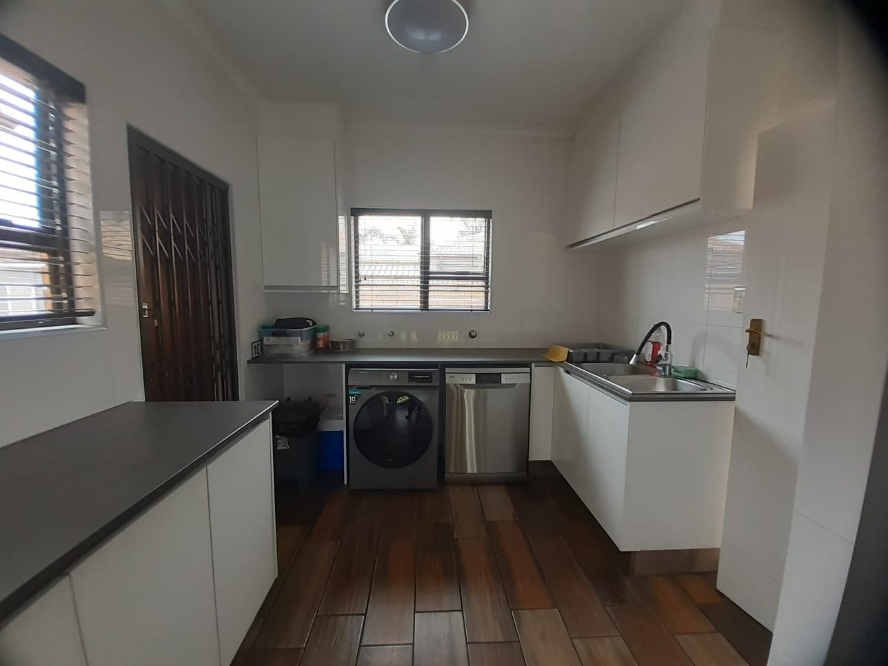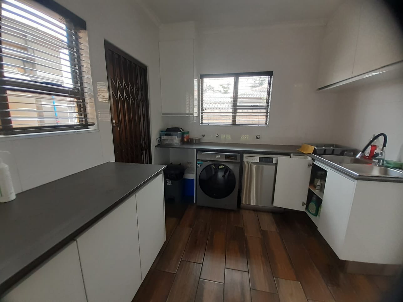 Externally, a generous covered patio offers an ideal setting for outdoor entertaining, overlooking a private garden. The property benefits from its location within a security estate, further enhanced by an access gate and integrated security gates on exterior doors, ensuring peace of mind for occupants.