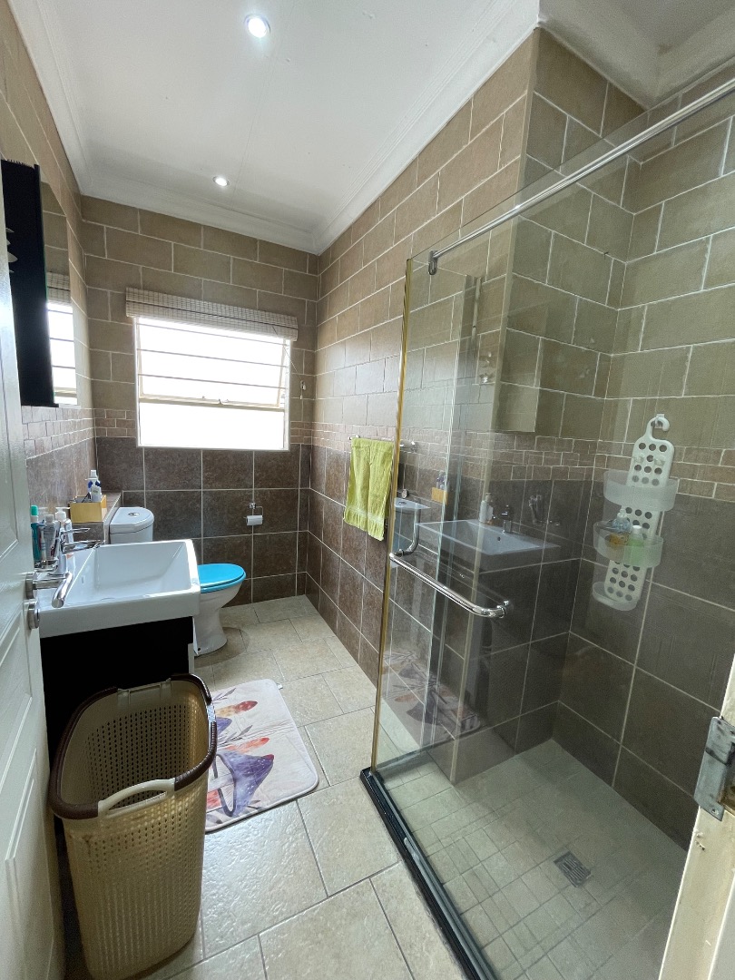 Accommodation includes three well-proportioned bedrooms, each offering a comfortable retreat. The bedrooms feature wood laminate flooring, large windows for natural light, and recessed ceiling lights. Built-in wardrobes provide practical storage solutions, while decorative accent walls add a touch of character. The two modern bathrooms are fully tiled, featuring sleek glass-enclosed walk-in showers and contemporary vanities, ensuring a fresh and functional start to each day.