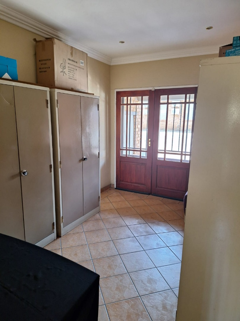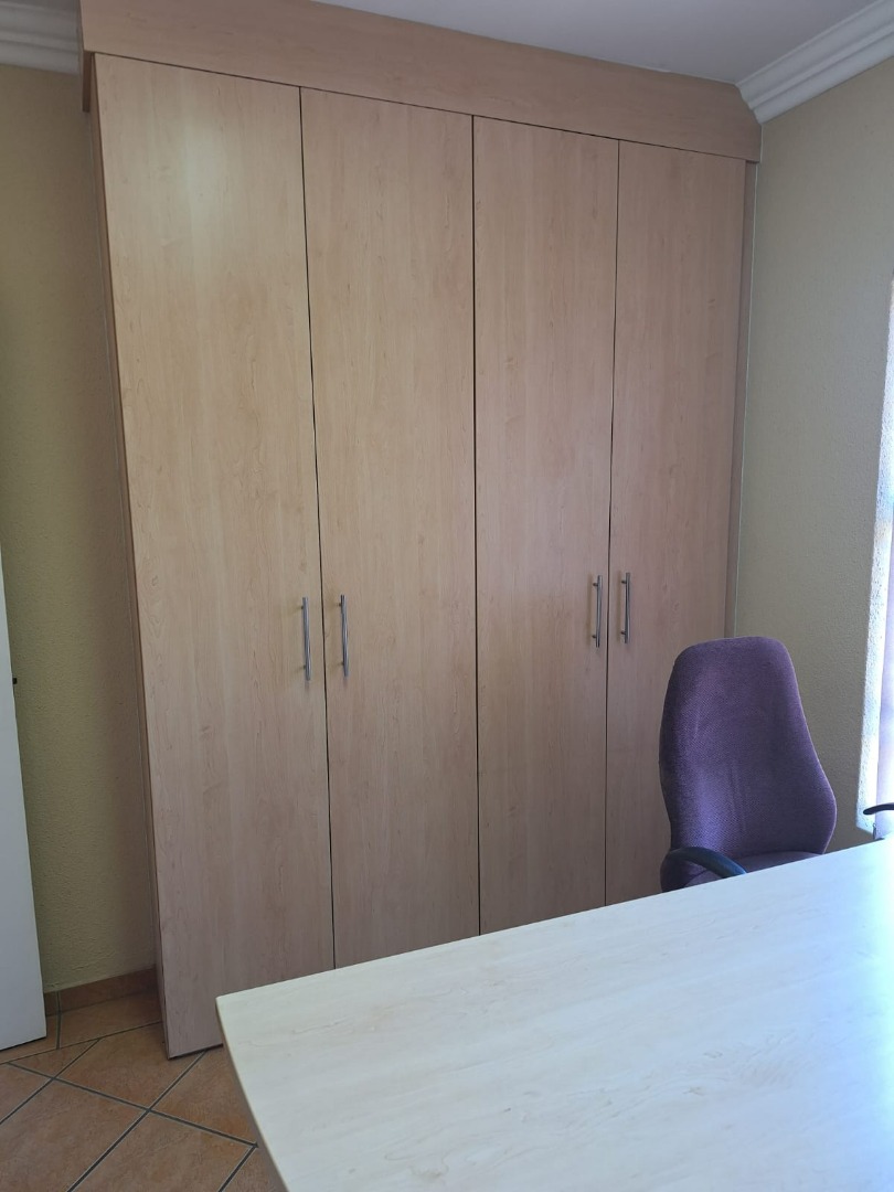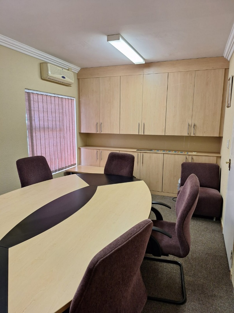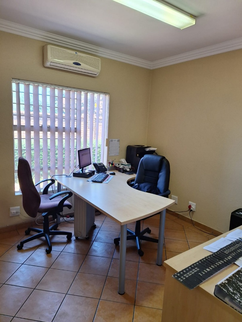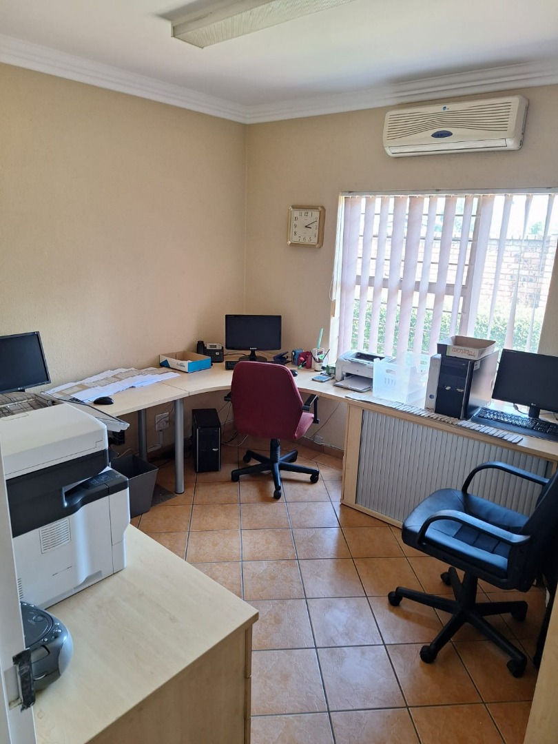 Inside, the layout is designed for efficiency, offering versatile office spaces. Multiple rooms are equipped with air conditioning for climate control and benefit from ample natural light through large windows, fitted with vertical blinds for privacy. The interiors boast practical tiled flooring throughout, crown molding, and bright fluorescent lighting. One dedicated office space includes generous built-in storage, while another features a functional corner desk setup.