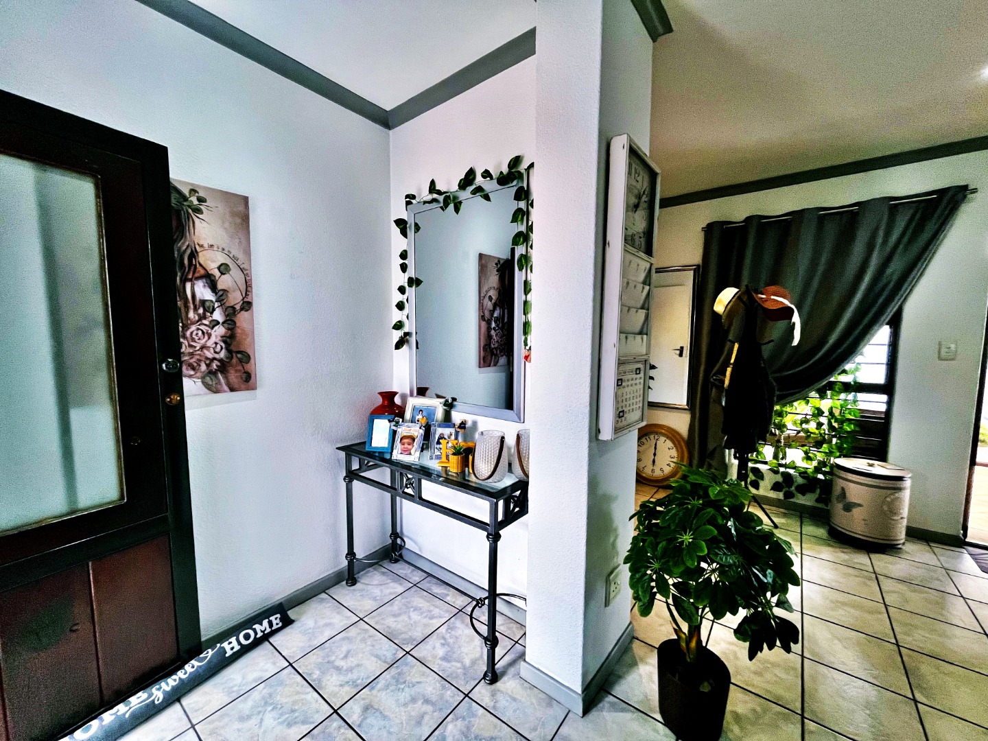 Enclosed patio/braai room from the living room that opens up to the back yard, suitable for a doggy or play space for kids.