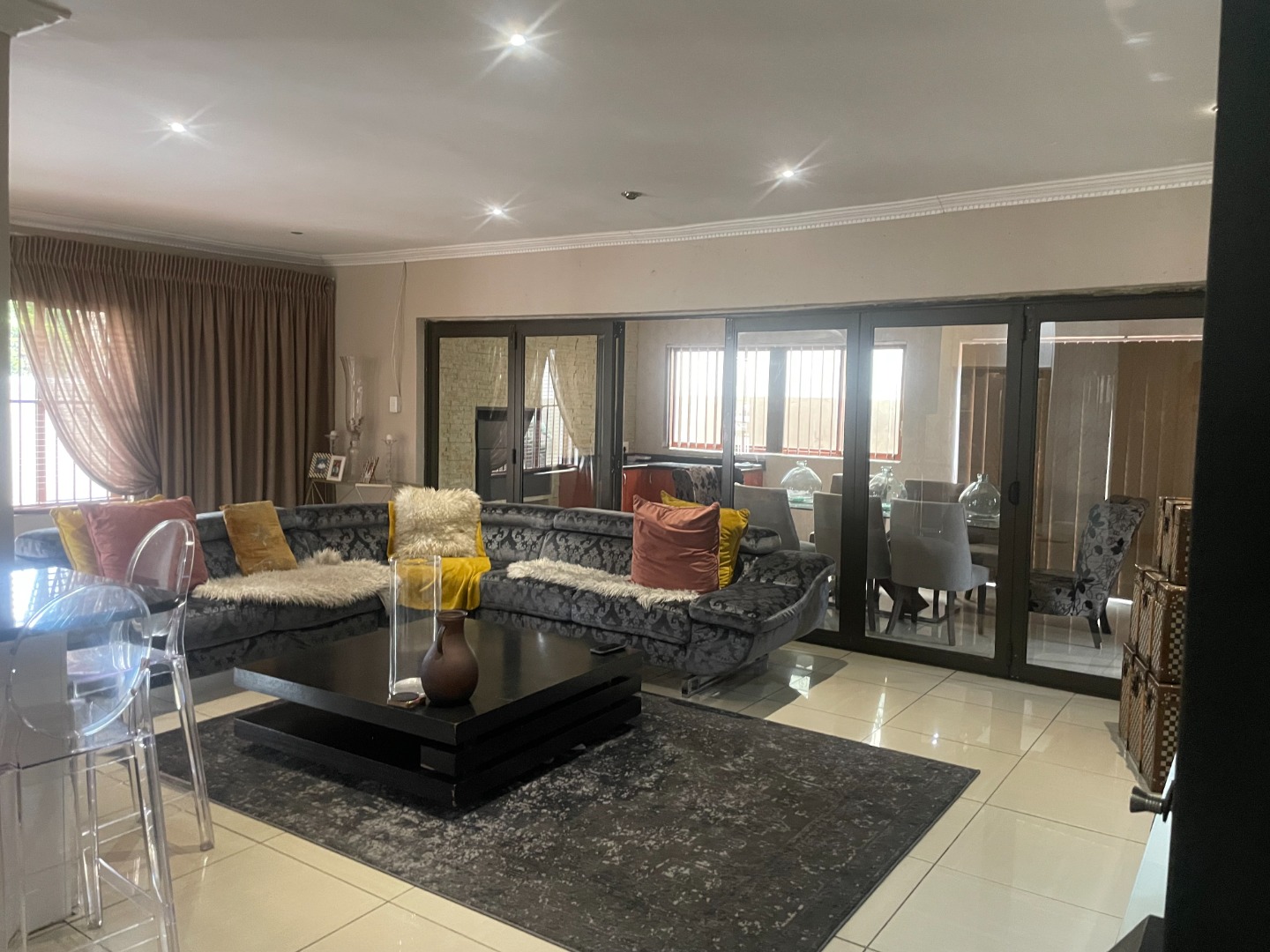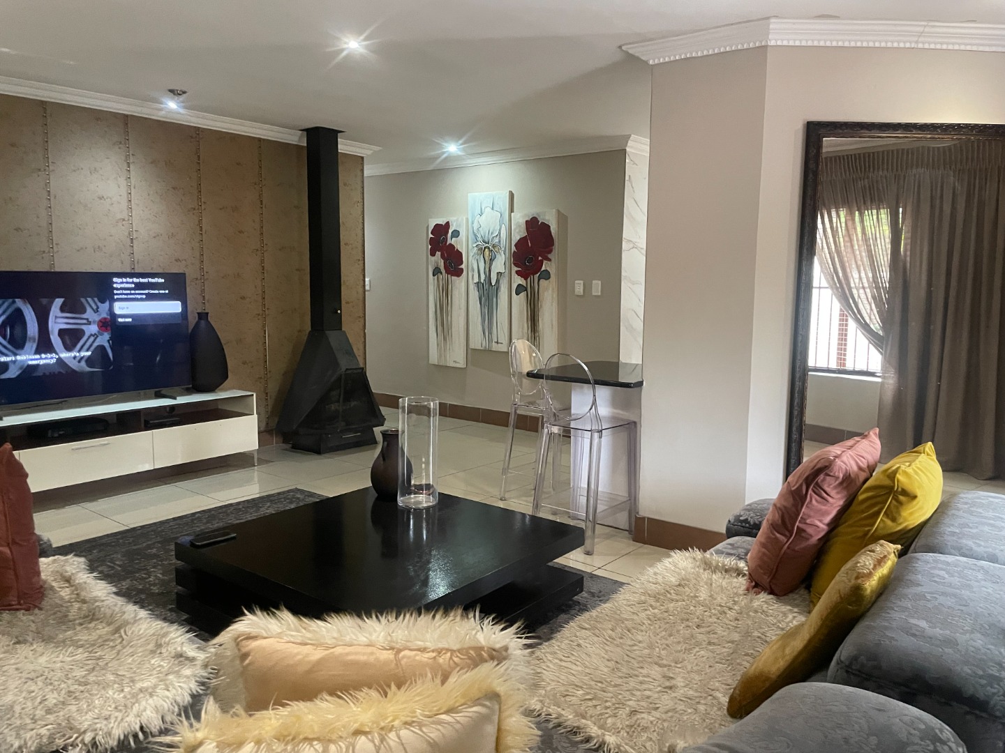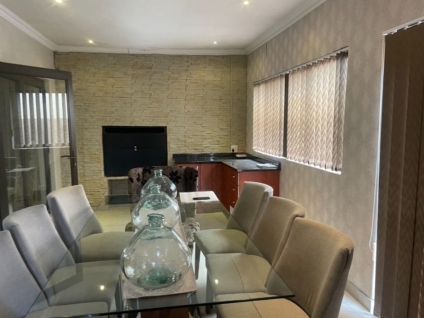 The interior boasts laminated flooring throughout the rooms, offering a modern and clean aesthetic. The kitchen is equipped with an instant heating stove and hob, ideal for efficient cooking. The open-plan lounge is enhanced by a cozy gas fireplace, creating a warm and inviting atmosphere, and flows seamlessly into an enclosed entertainment area. This versatile space can easily serve as a dining room or continue to function as an entertainment area, complete with a built-in braai and sliding doors leading to the pool—perfect for hosting guests or unwinding in privacy.