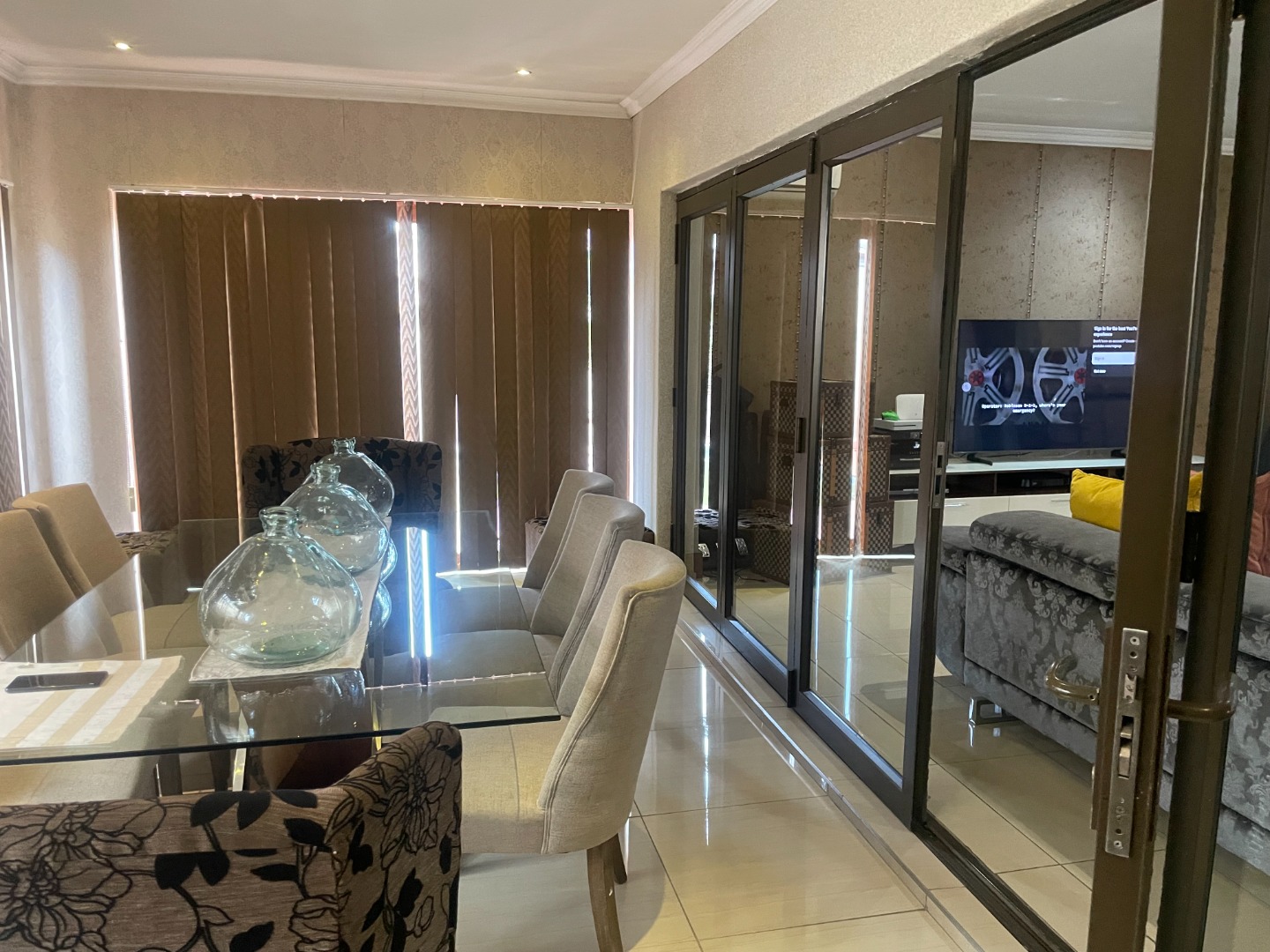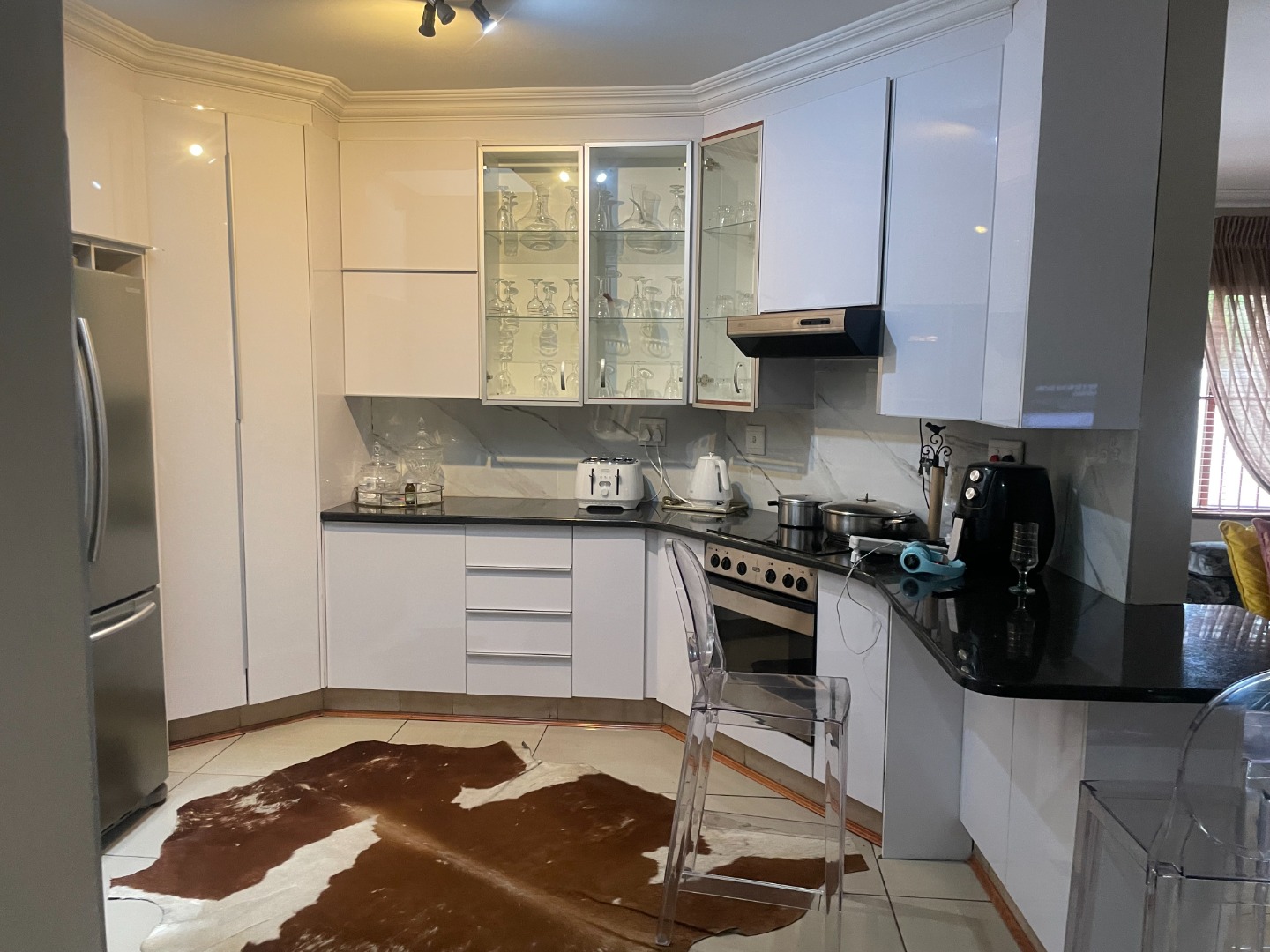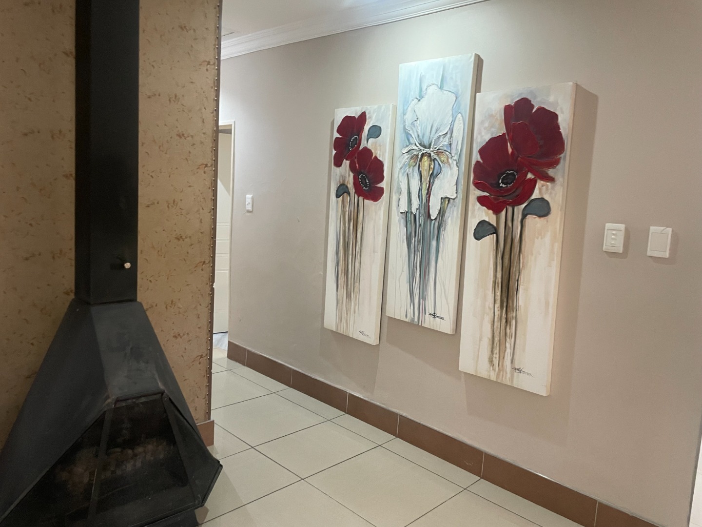 The interior boasts laminated flooring throughout the rooms, offering a modern and clean aesthetic. The kitchen is equipped with an instant heating stove and hob, ideal for efficient cooking. The open-plan lounge is enhanced by a cozy gas fireplace, creating a warm and inviting atmosphere, and flows seamlessly into an enclosed entertainment area. This versatile space can easily serve as a dining room or continue to function as an entertainment area, complete with a built-in braai and sliding doors leading to the pool—perfect for hosting guests or unwinding in privacy.