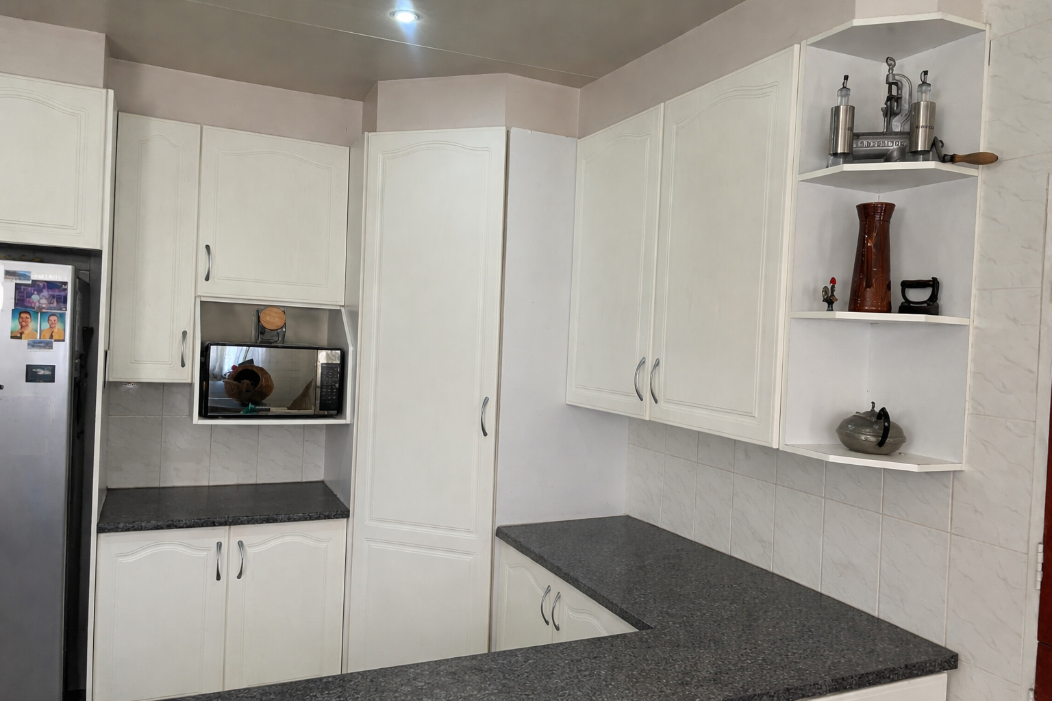 The home comprises three comfortable bedrooms, all with laminated flooring. The main bedroom boasts an en-suite bathroom with a bath and toilet. A second bathroom serves the remaining bedrooms, featuring a toilet and shower. Outside toilets are also available for added convenience.