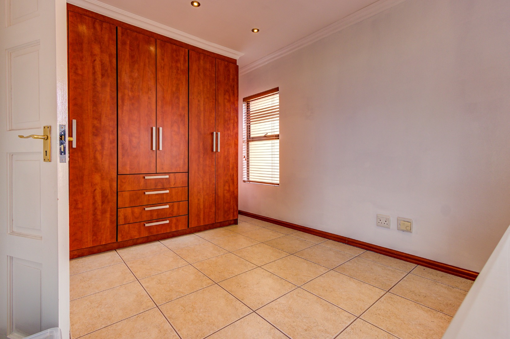 The residence features three generously proportioned bedrooms, complemented by four luxurious bathrooms, three of which are en-suite, ensuring ultimate comfort and privacy. Ample storage is provided by built-in wooden wardrobes, enhancing the home's functional elegance.