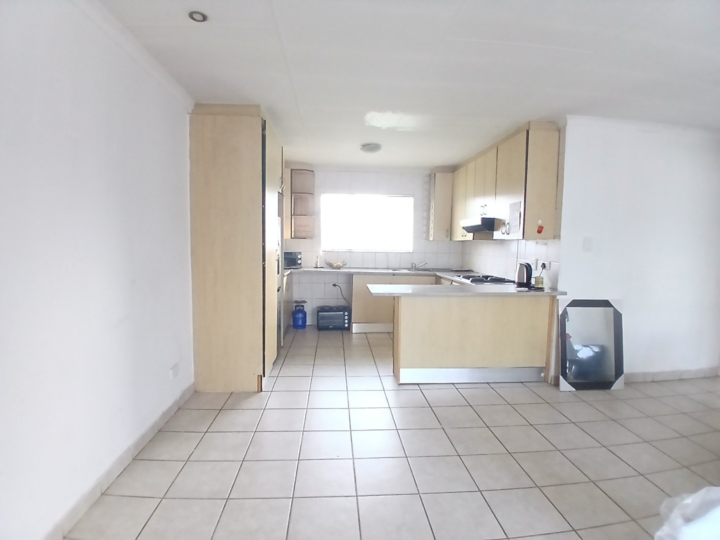 The interior features a functional kitchen equipped with light wood-colored cabinetry, providing ample storage, and a practical island/breakfast bar. Tiled flooring ensures durability and easy maintenance, complemented by a large window that bathes the space in natural light. The property includes a dedicated lounge area, offering a comfortable space for relaxation and entertainment, characterized by neutral white walls and tiled floors, creating a versatile canvas for personal decor.