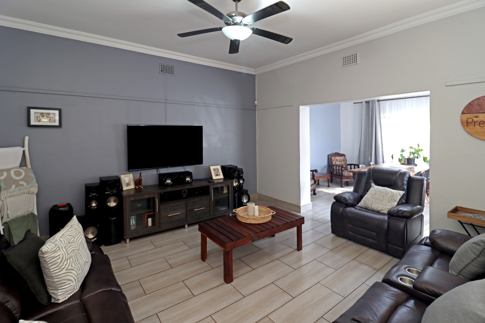 The interior features an open-plan layout, enhancing the sense of space and connectivity between the main living areas. A well-equipped kitchen, a dedicated dining room, and a comfortable lounge provide versatile spaces for daily life. For those who enjoy hosting, the property includes a dedicated thatch lapa with a built in braai and an entertainment area with a built-in bar, perfect for social gatherings. Air conditioning ensures comfort throughout the year, and fibre internet connectivity is available, catering to modern lifestyle needs.