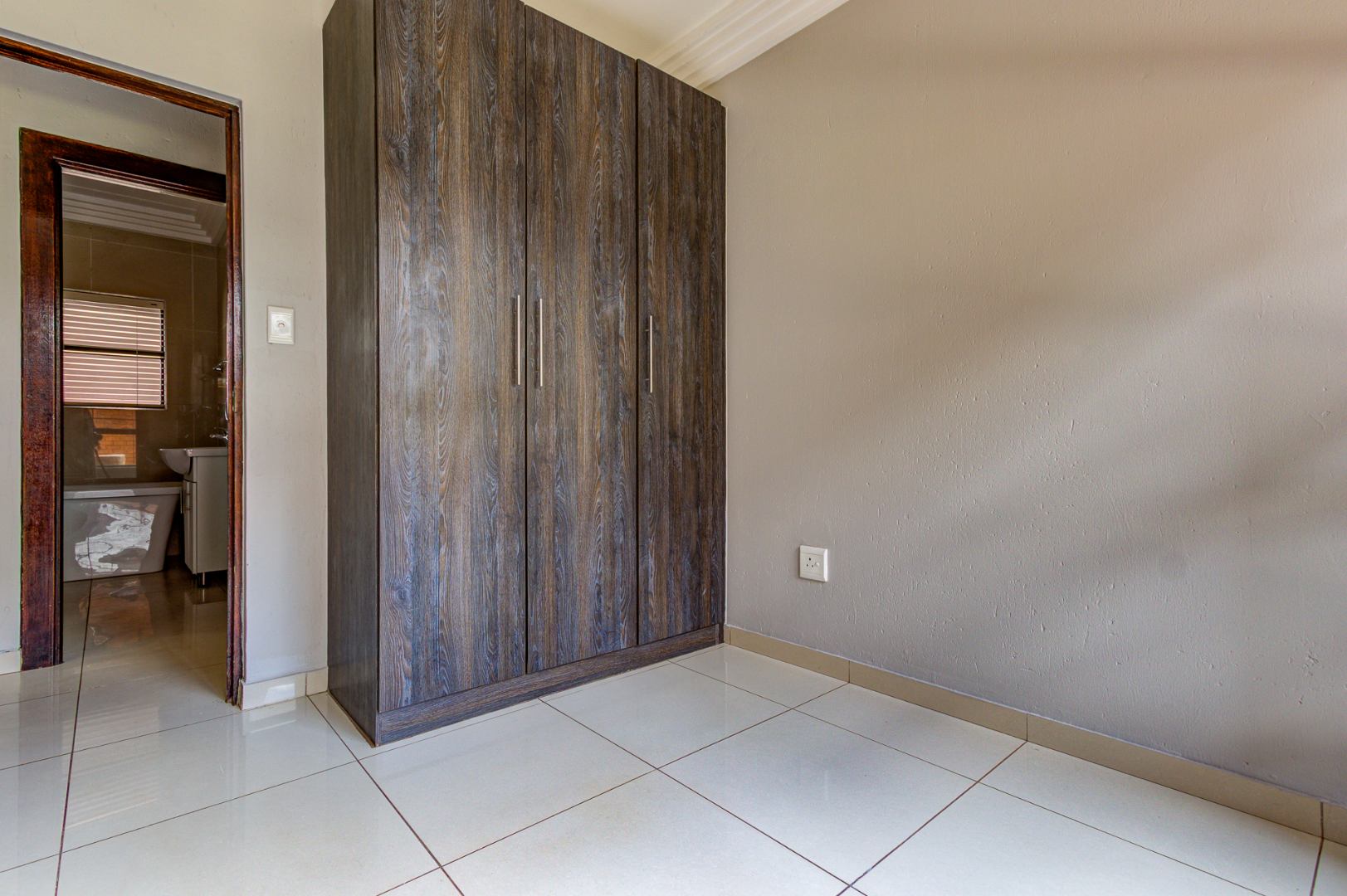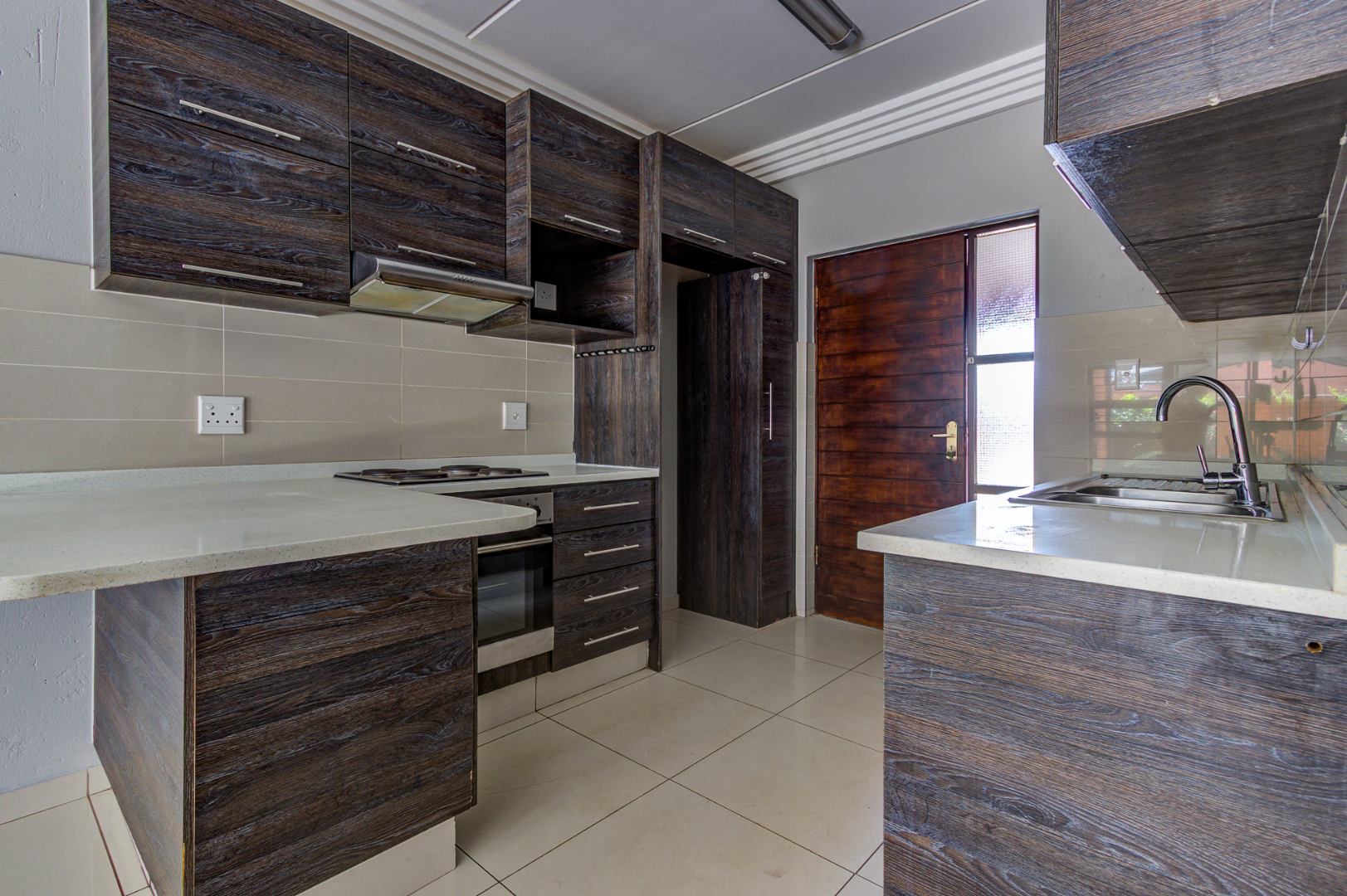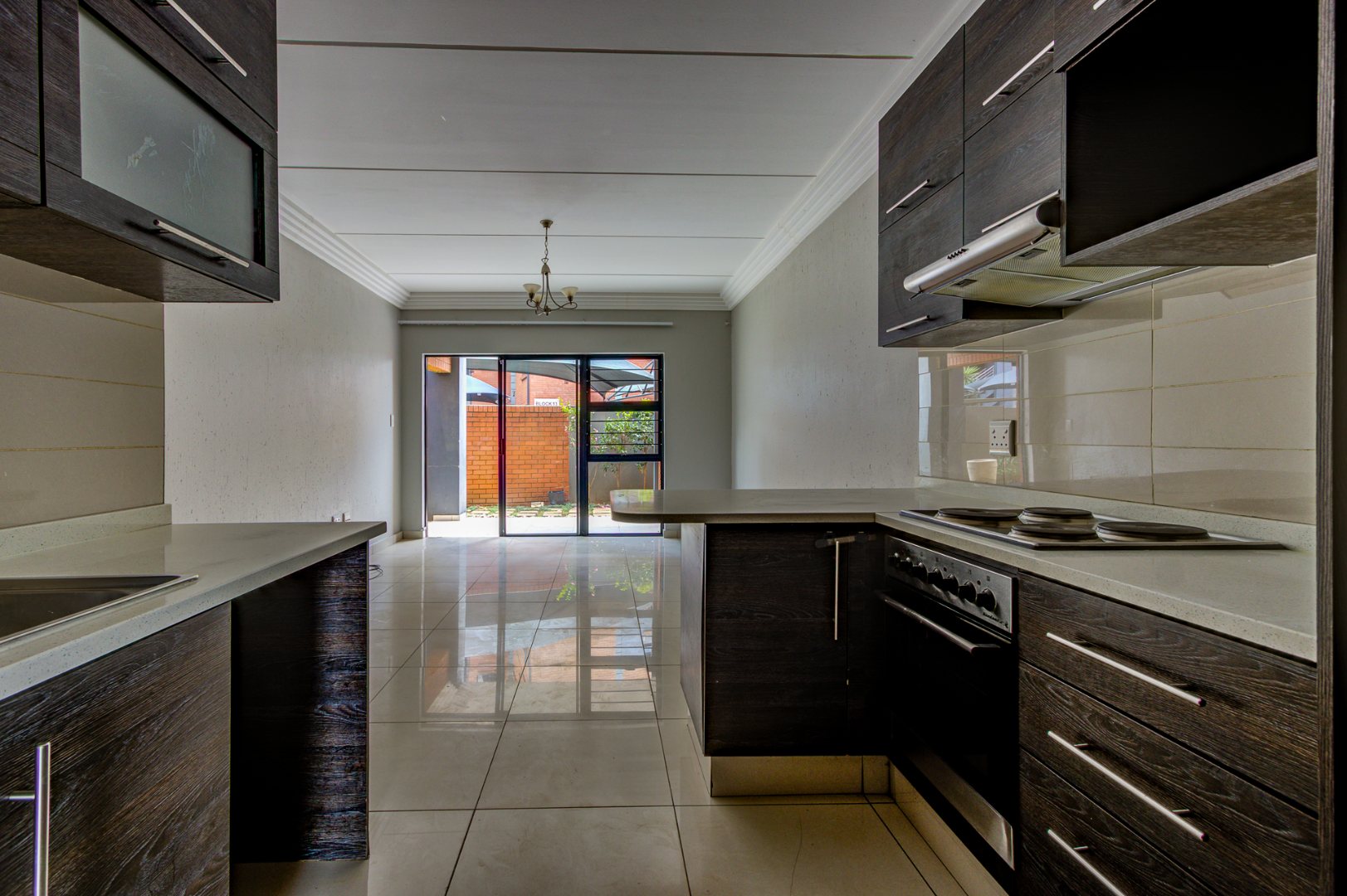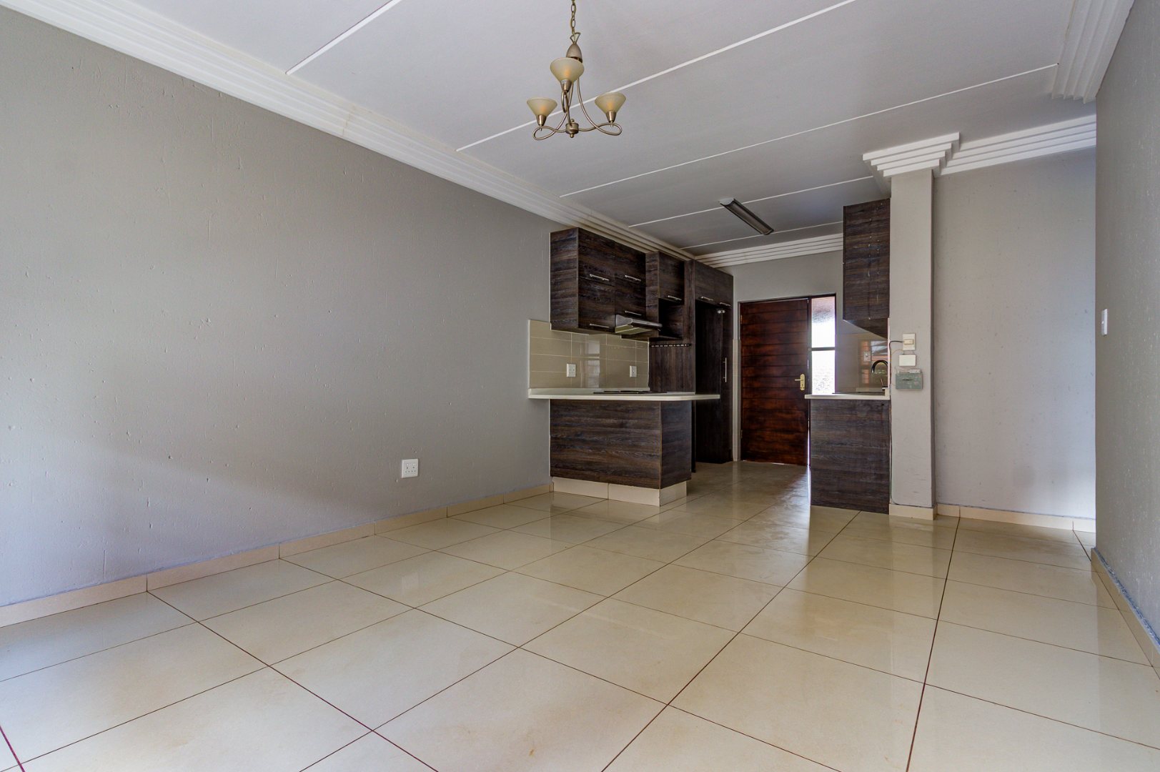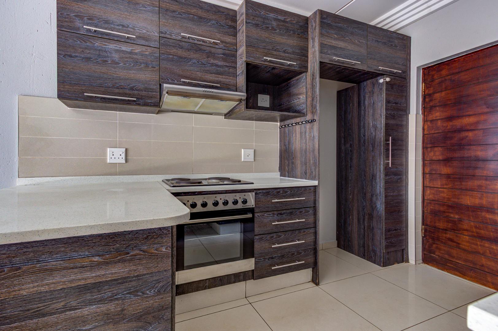 Discover modern living in this inviting 3-bedroom, 2-bathroom apartment located within a secure complex in Eveleigh, Boksburg. Spanning 86 square meters, this residence offers a contemporary open-plan layout, seamlessly connecting the living area with a stylish kitchen. The kitchen boasts modern dark cabinetry, light countertops, an integrated hob, extractor fan, and a convenient breakfast bar, perfect for casual dining. Neutral grey walls and white tiled flooring create a clean, versatile canvas throughout the main living spaces, complemented by decorative ceiling cornices.