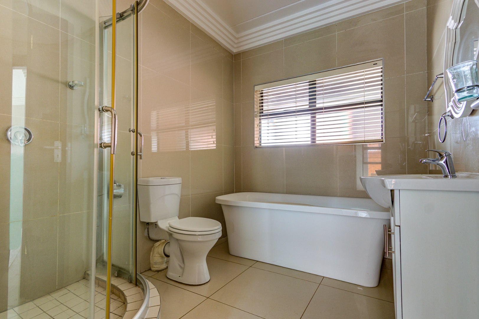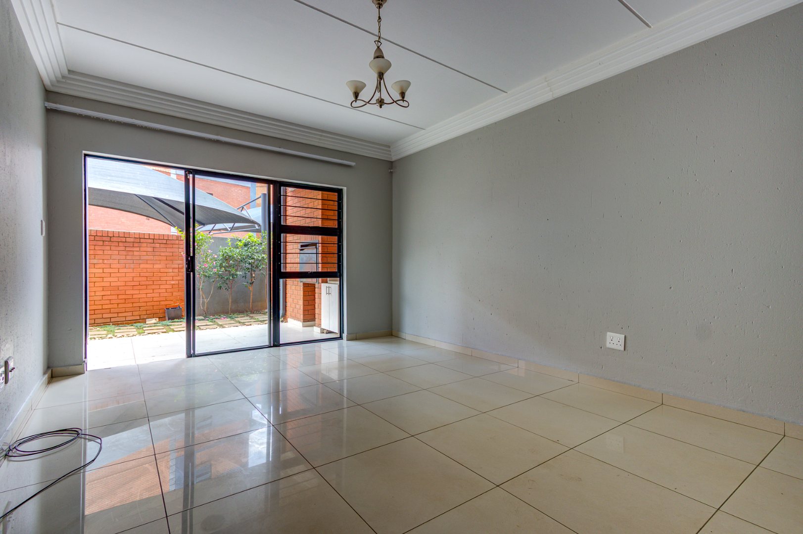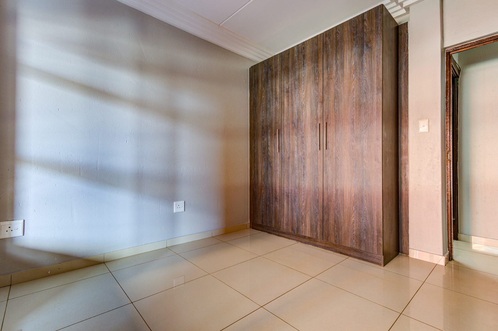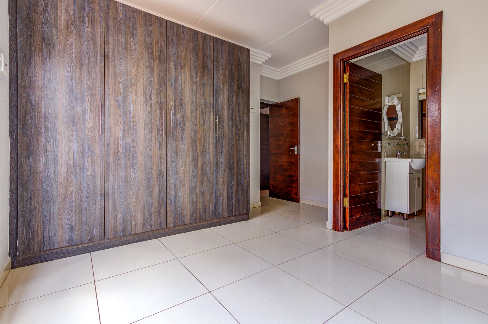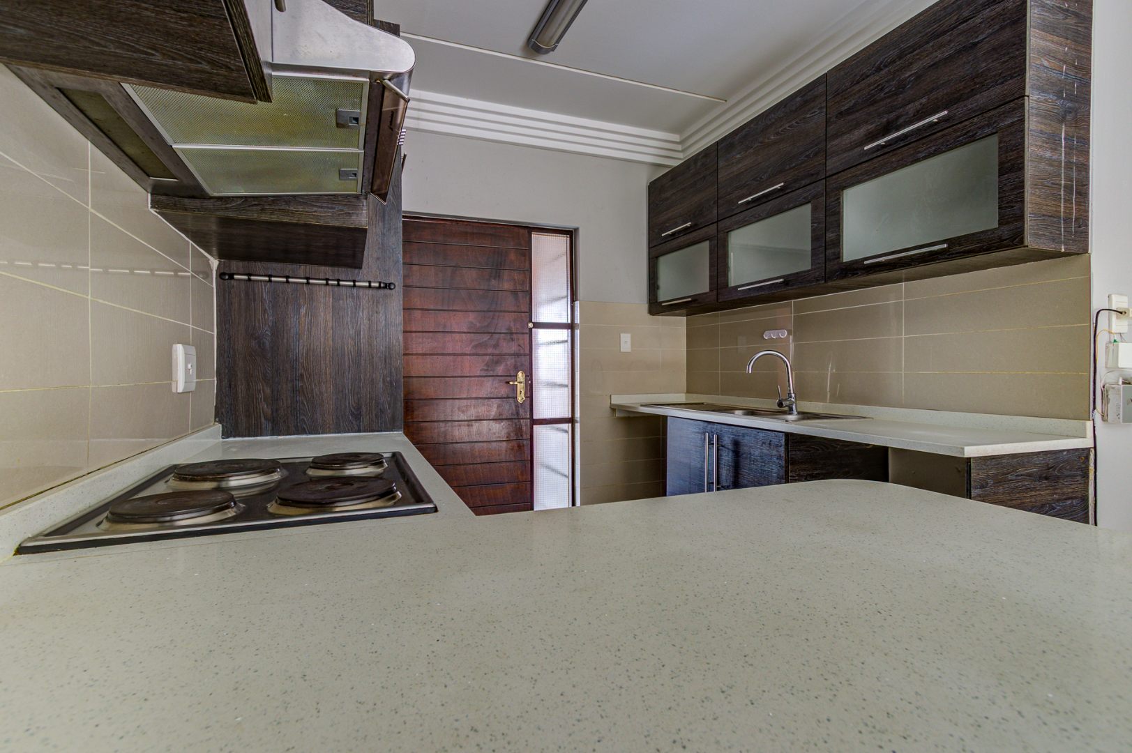 Discover modern living in this inviting 3-bedroom, 2-bathroom apartment located within a secure complex in Eveleigh, Boksburg. Spanning 86 square meters, this residence offers a contemporary open-plan layout, seamlessly connecting the living area with a stylish kitchen. The kitchen boasts modern dark cabinetry, light countertops, an integrated hob, extractor fan, and a convenient breakfast bar, perfect for casual dining. Neutral grey walls and white tiled flooring create a clean, versatile canvas throughout the main living spaces, complemented by decorative ceiling cornices.