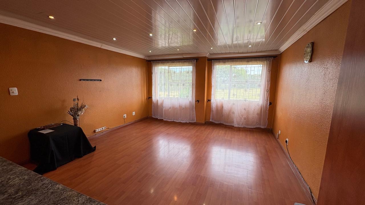 Spacious lounge with laminate wood flooring and ample natural light from large windows.. The kitchen has ample cupboard space, a built-in oven, stovetop, and extractor fan, alongside a double sink. There is also a breakfast nook.
