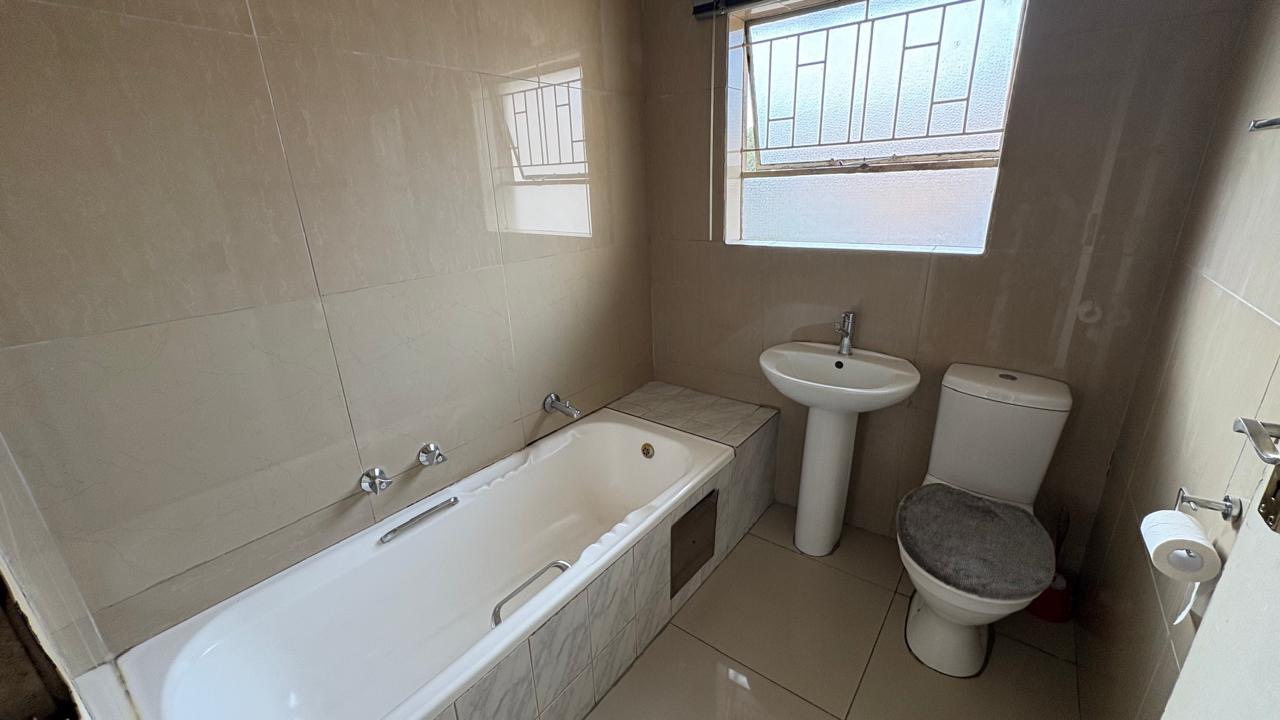 Both bedrooms are well-proportioned, offering natural light and laminate flooring. The fully tiled bathroom features a bathtub, pedestal sink, and toilet, catering to daily needs. Security bars on windows throughout the unit contribute to a secure living environment.
