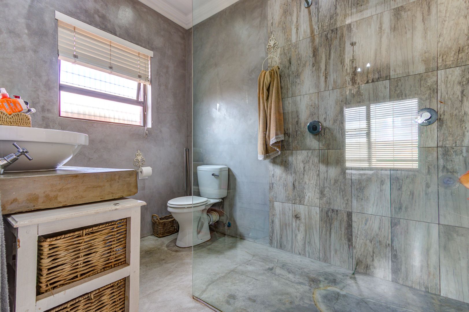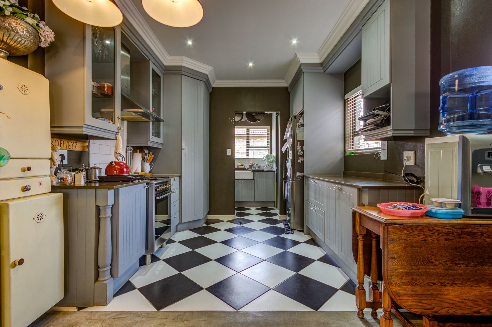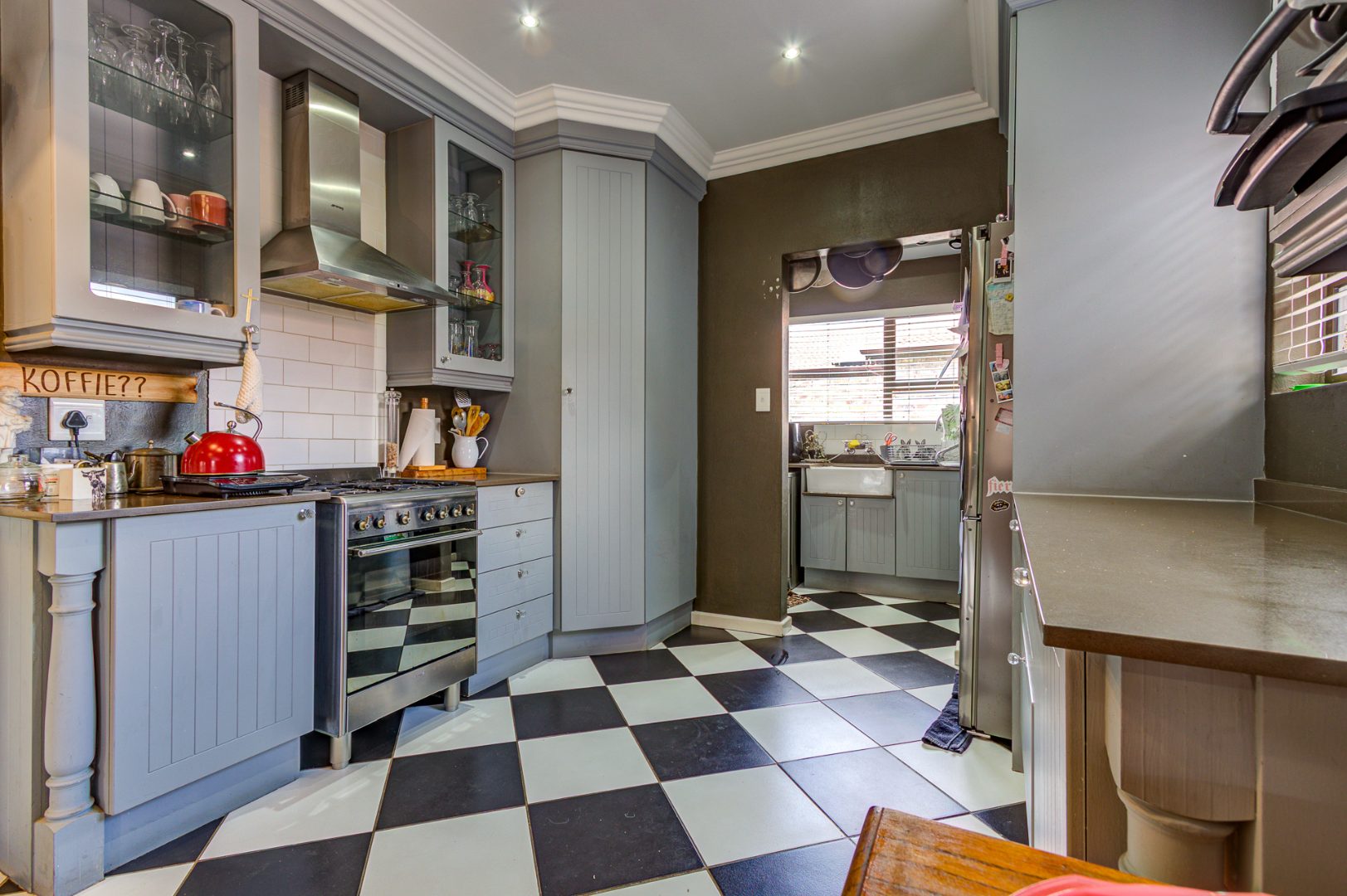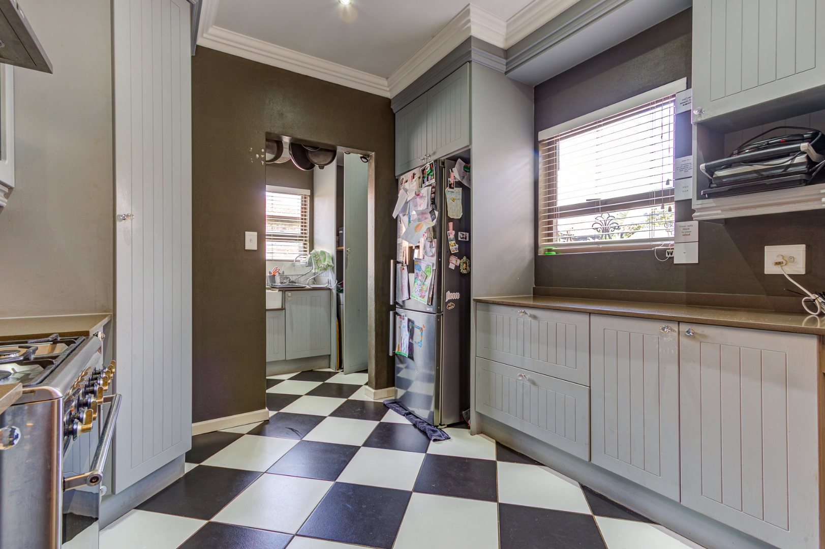 The open-plan kitchen is equipped with stylish wooden units, a gas stove, and an under-counter oven, complemented by a separate scullery and pantry cupboard. The residence offers three generously sized bedrooms with built-in cupboards. The main bedroom includes a private en-suite bathroom with a shower, toilet, and washbasin, while a second bathroom features a bath, shower, and washbasin.