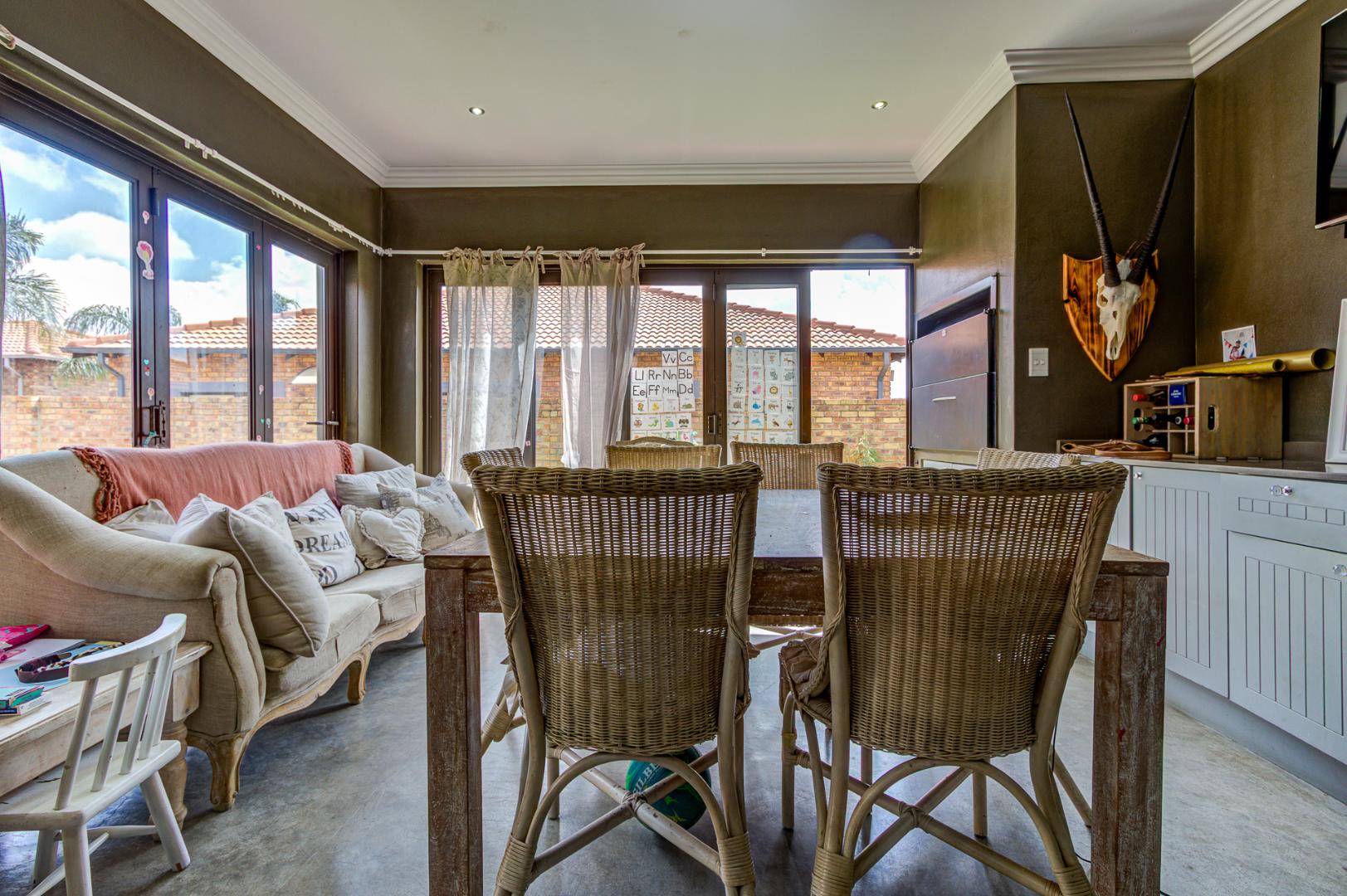 Discover this exceptional three-bedroom cluster home, perfectly situated within a secure estate in Jansenpark, Boksburg. Designed for contemporary living, the property features a spacious open-plan lounge area that connects to an enclosed patio. This inviting space boasts a built-in braai and stacker doors, opening directly to the private pool area, ideal for relaxation and entertaining.
