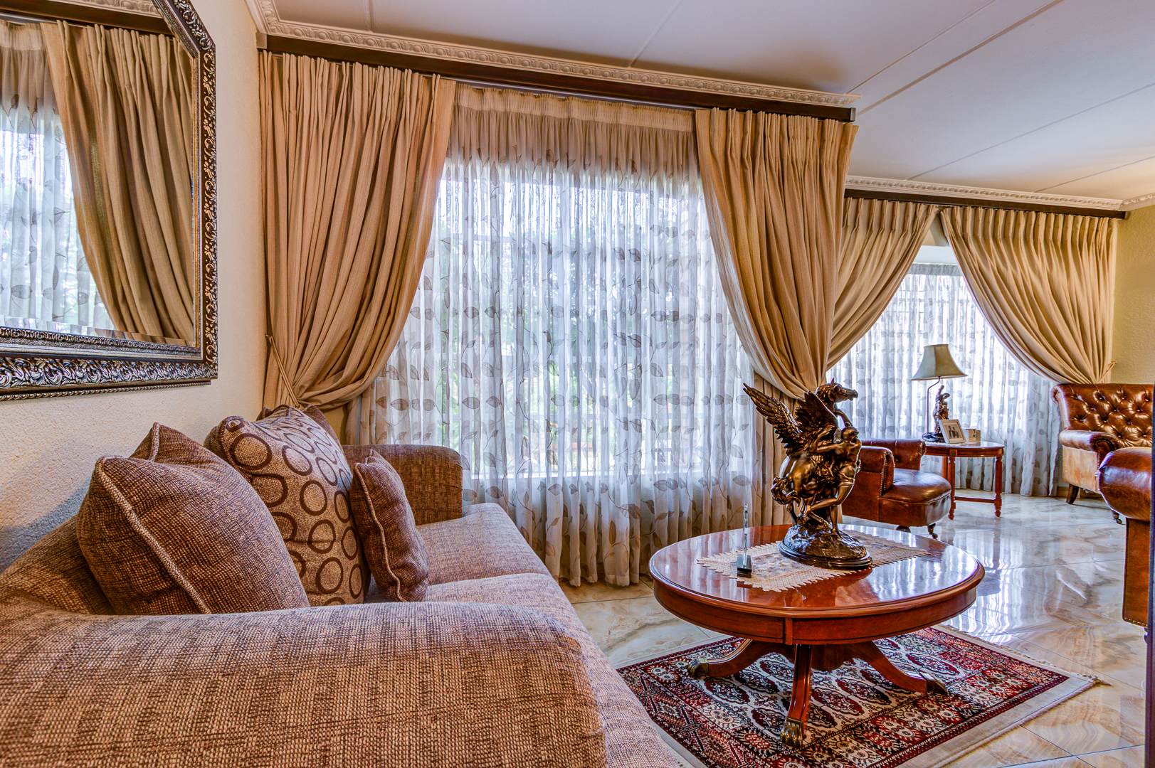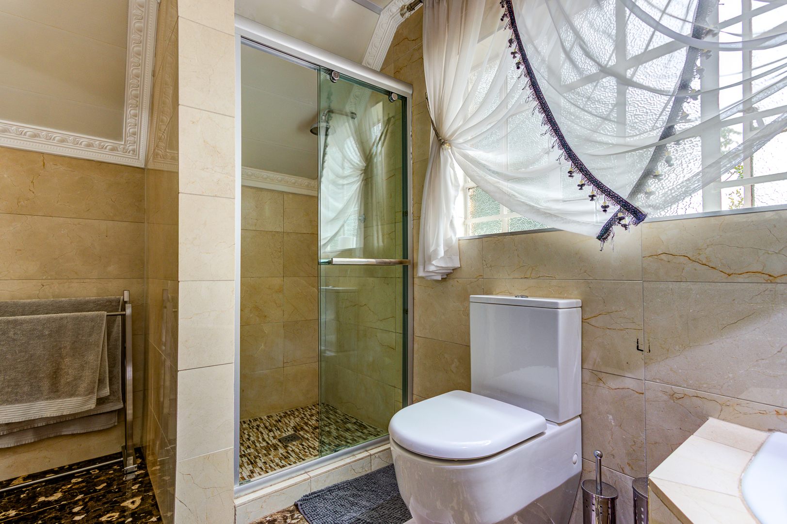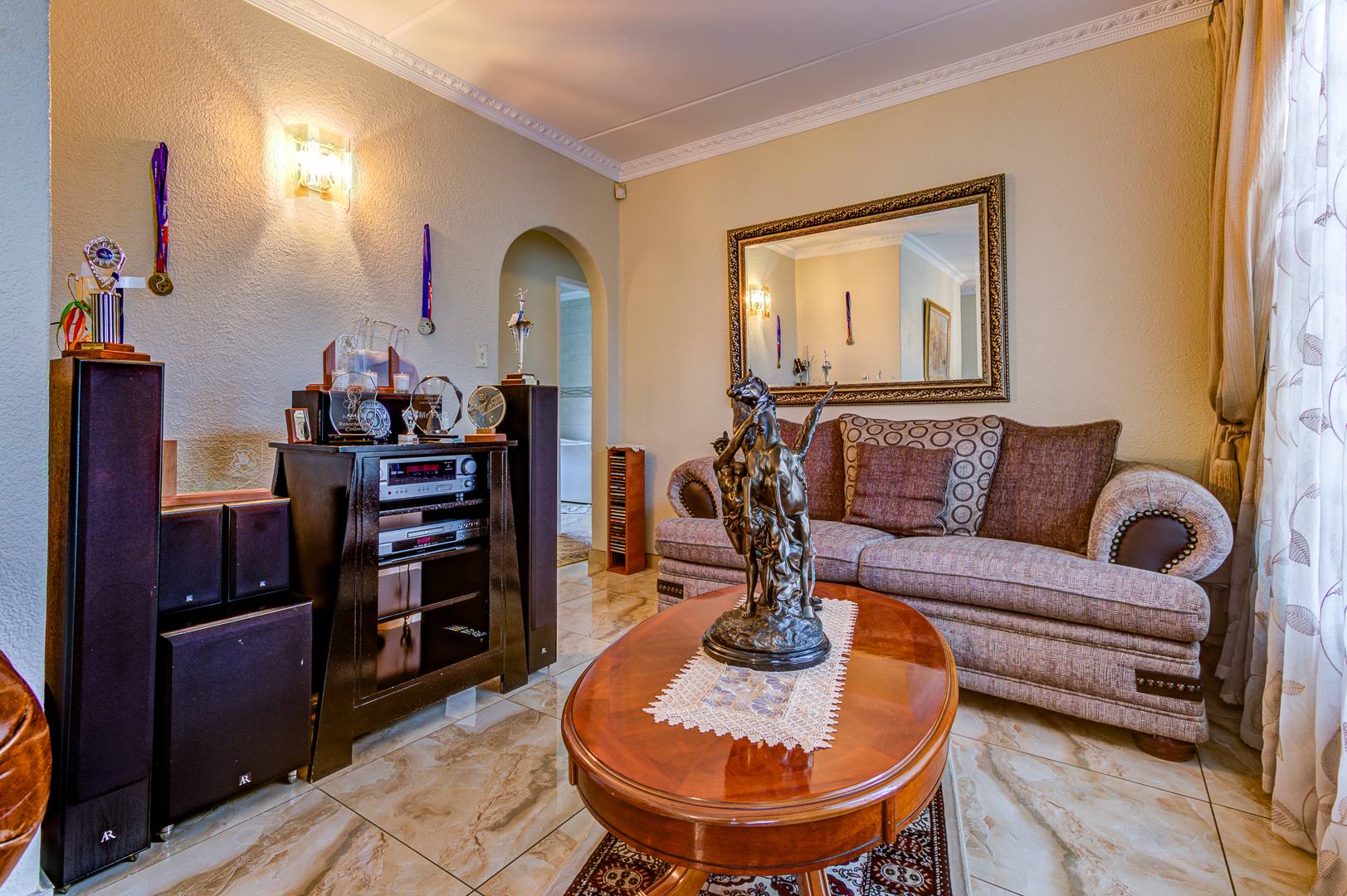 Large tiled (marble) entrance hall with sliding doors and trellidoors to outside garden.