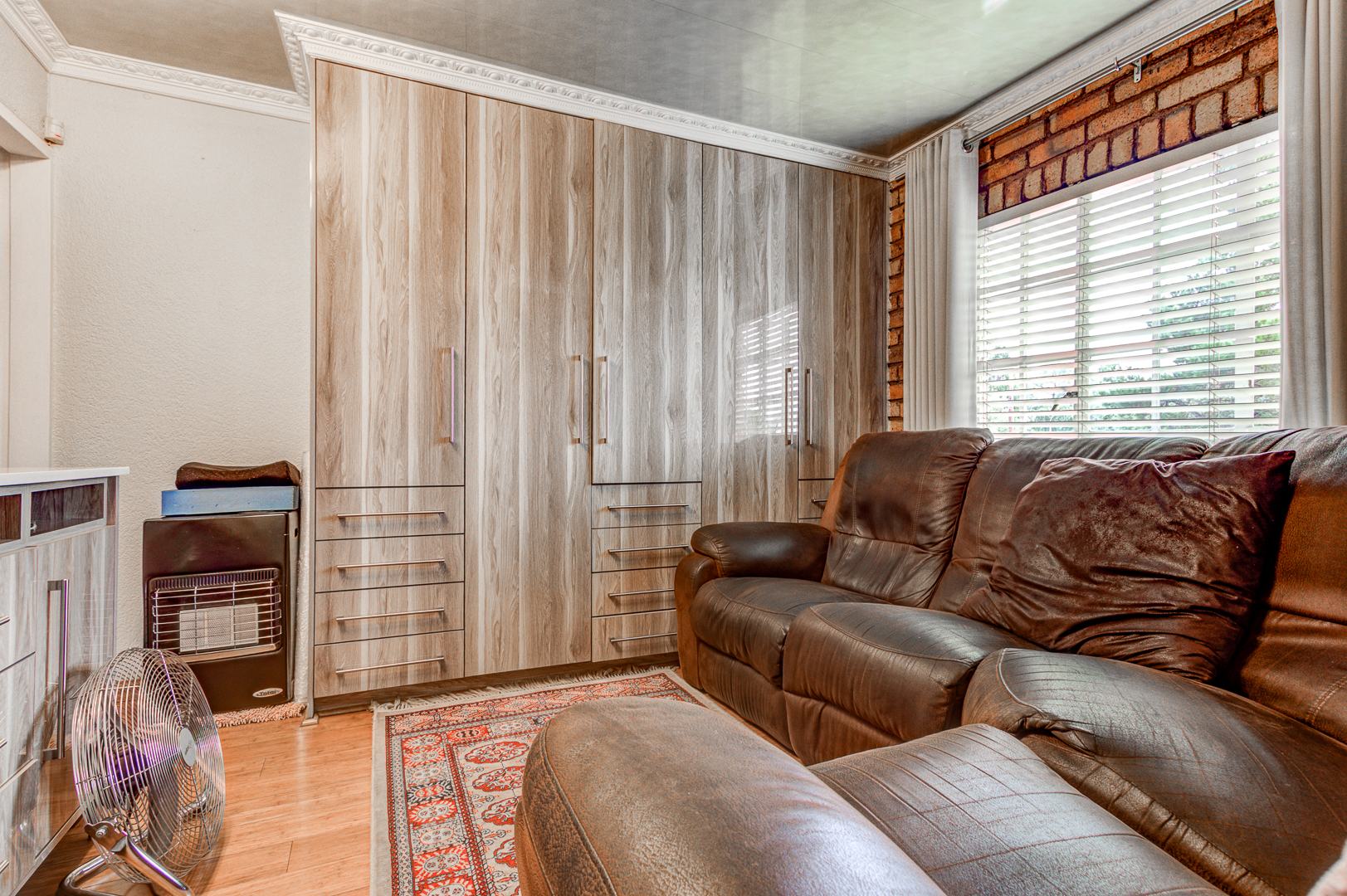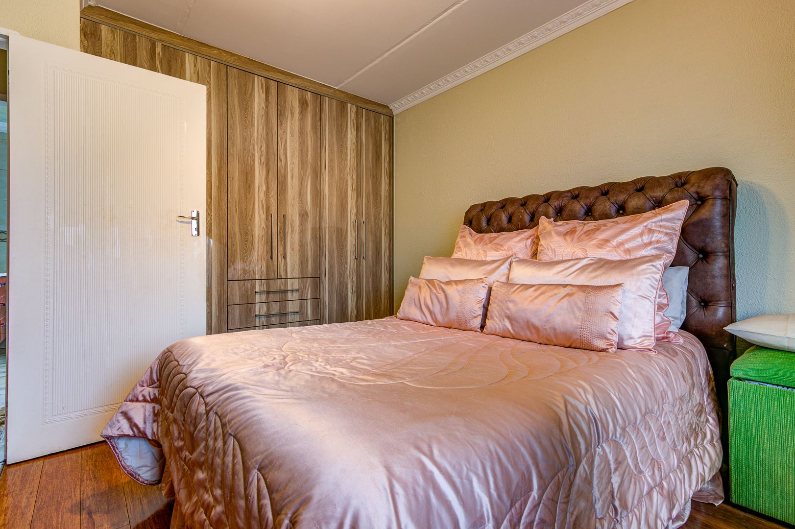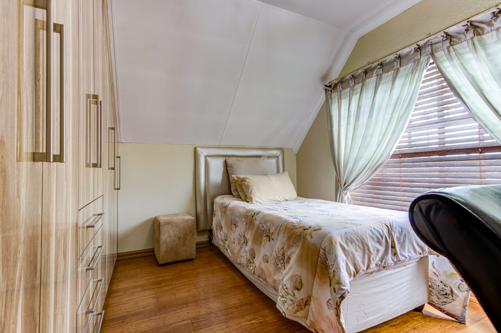 Downstairs bedroom with wooden (bamboo flooring) with built in cupboards and a bay window