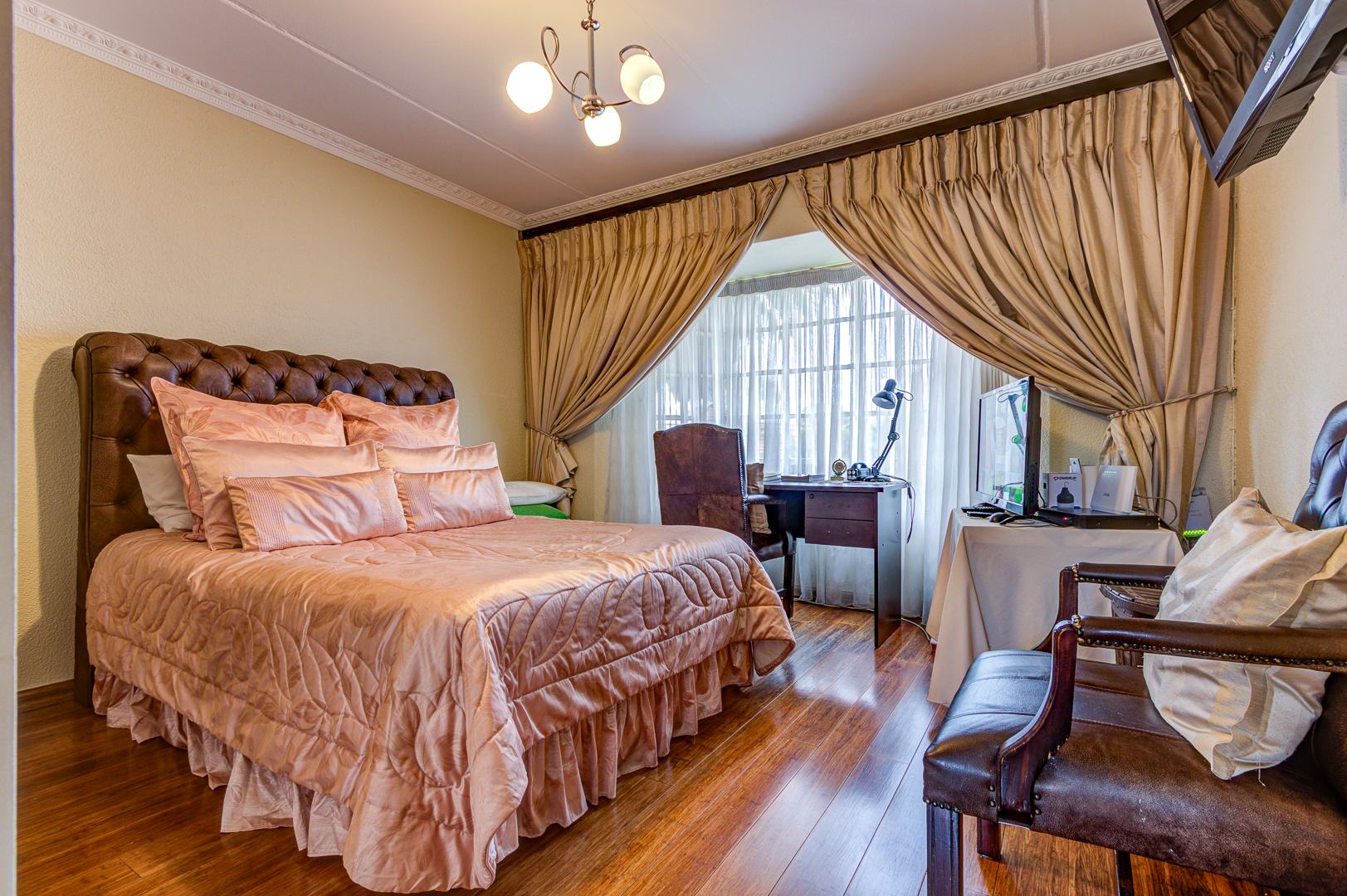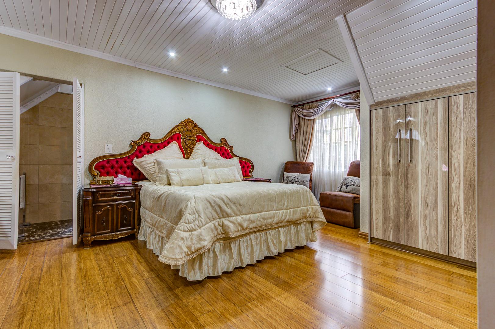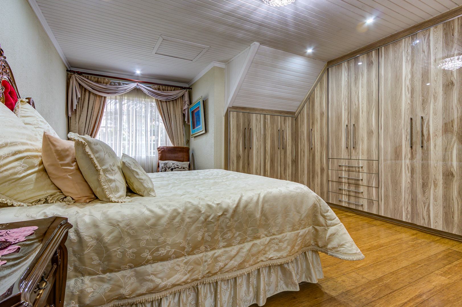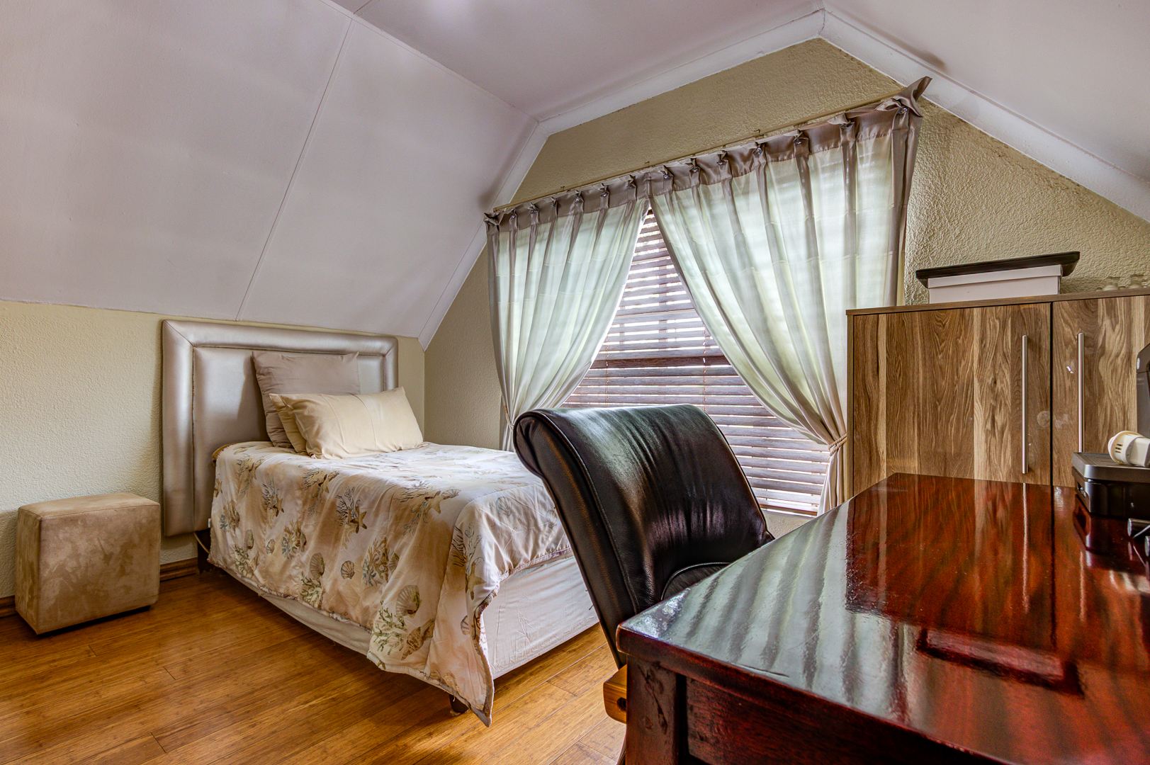 Downstairs bedroom with wooden (bamboo flooring) with built in cupboards and a bay window