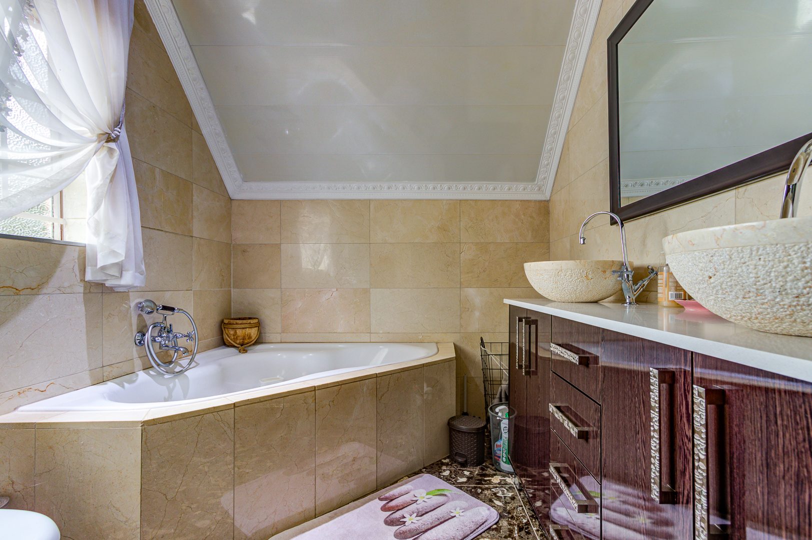corner bath/shower/double basin and vanity