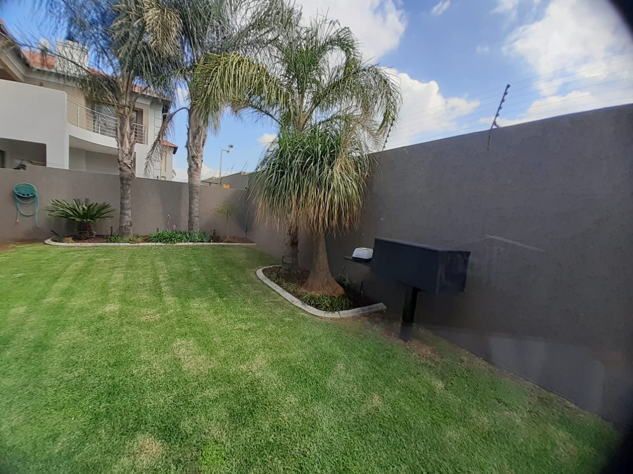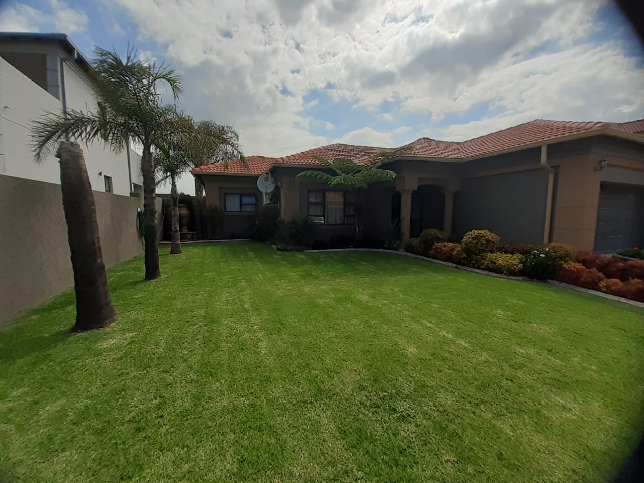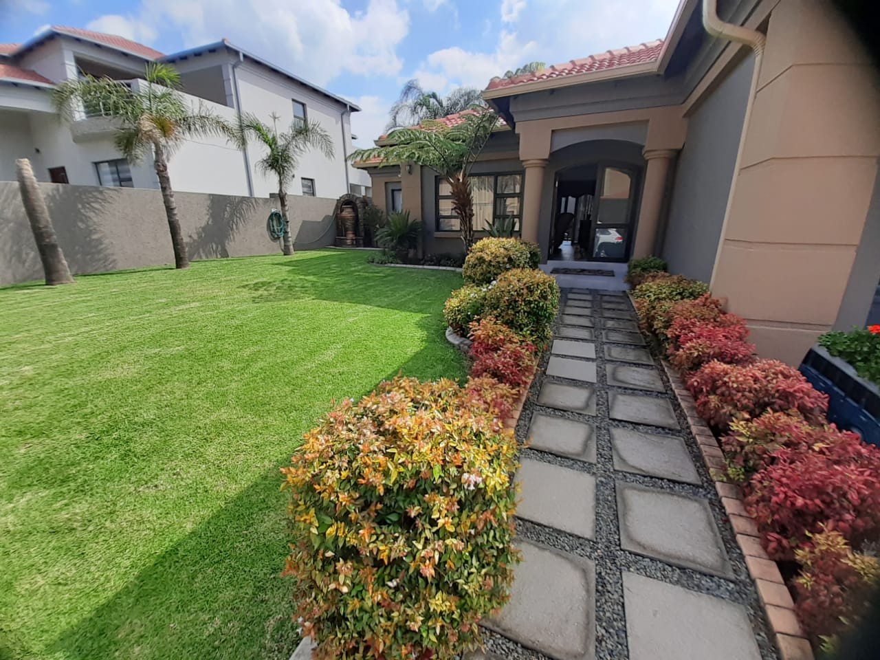 Discover an exquisite lifestyle within this captivating residence, perfectly situated in a secure estate in Parkrand, Boksburg. The property immediately impresses with its exceptional kerb appeal, featuring a lush, meticulously maintained lawn, an inviting stone pathway bordered by vibrant shrubs, and mature palm trees leading to a welcoming entrance adorned with architectural pillars. The modern two-tone exterior and classic red tiled roof exude timeless elegance.
