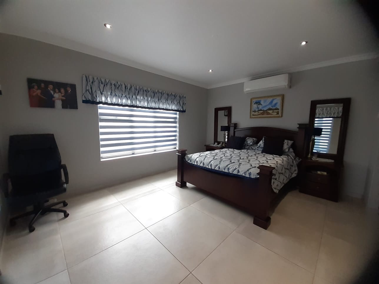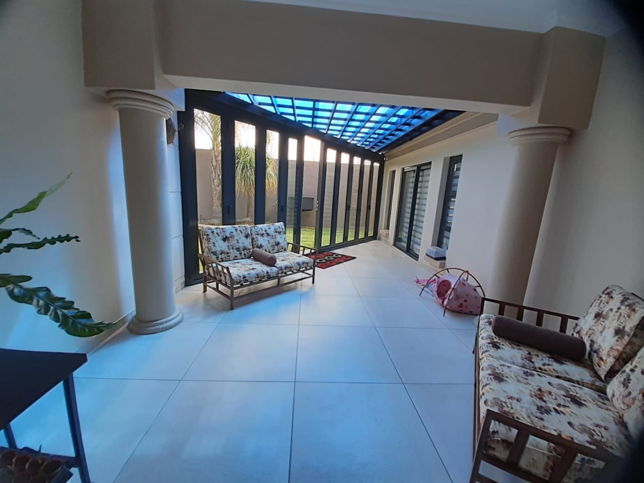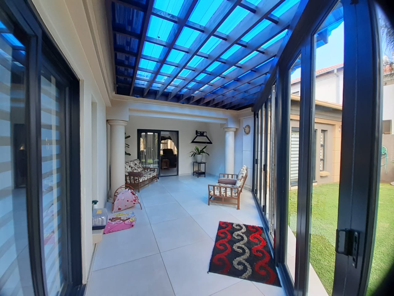 Discover an exquisite lifestyle within this captivating residence, perfectly situated in a secure estate in Parkrand, Boksburg. The property immediately impresses with its exceptional kerb appeal, featuring a lush, meticulously maintained lawn, an inviting stone pathway bordered by vibrant shrubs, and mature palm trees leading to a welcoming entrance adorned with architectural pillars. The modern two-tone exterior and classic red tiled roof exude timeless elegance.