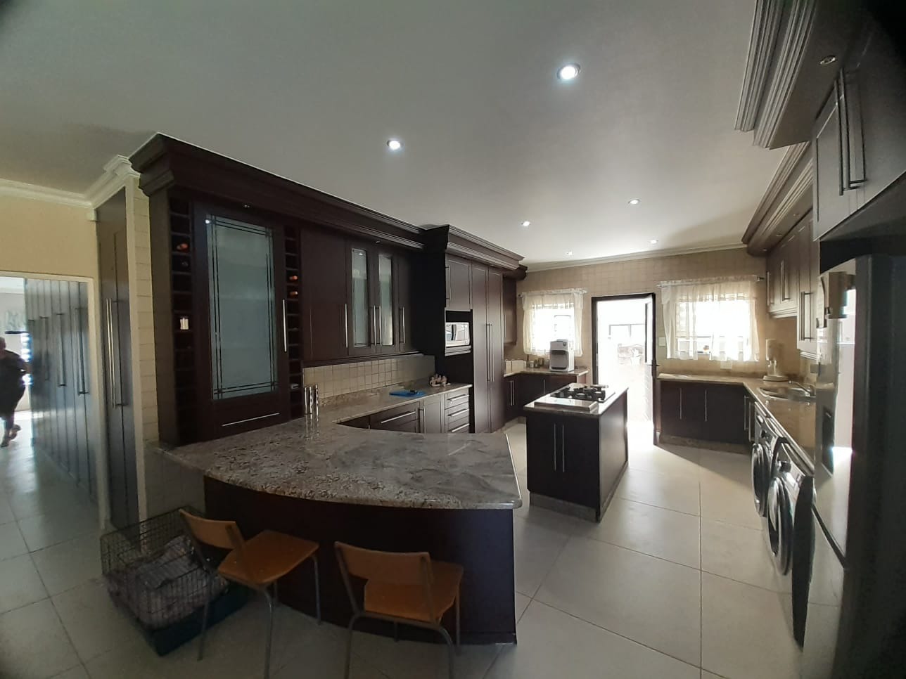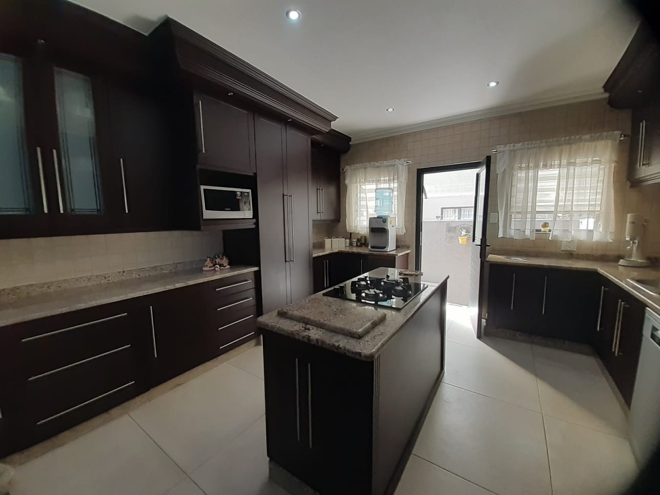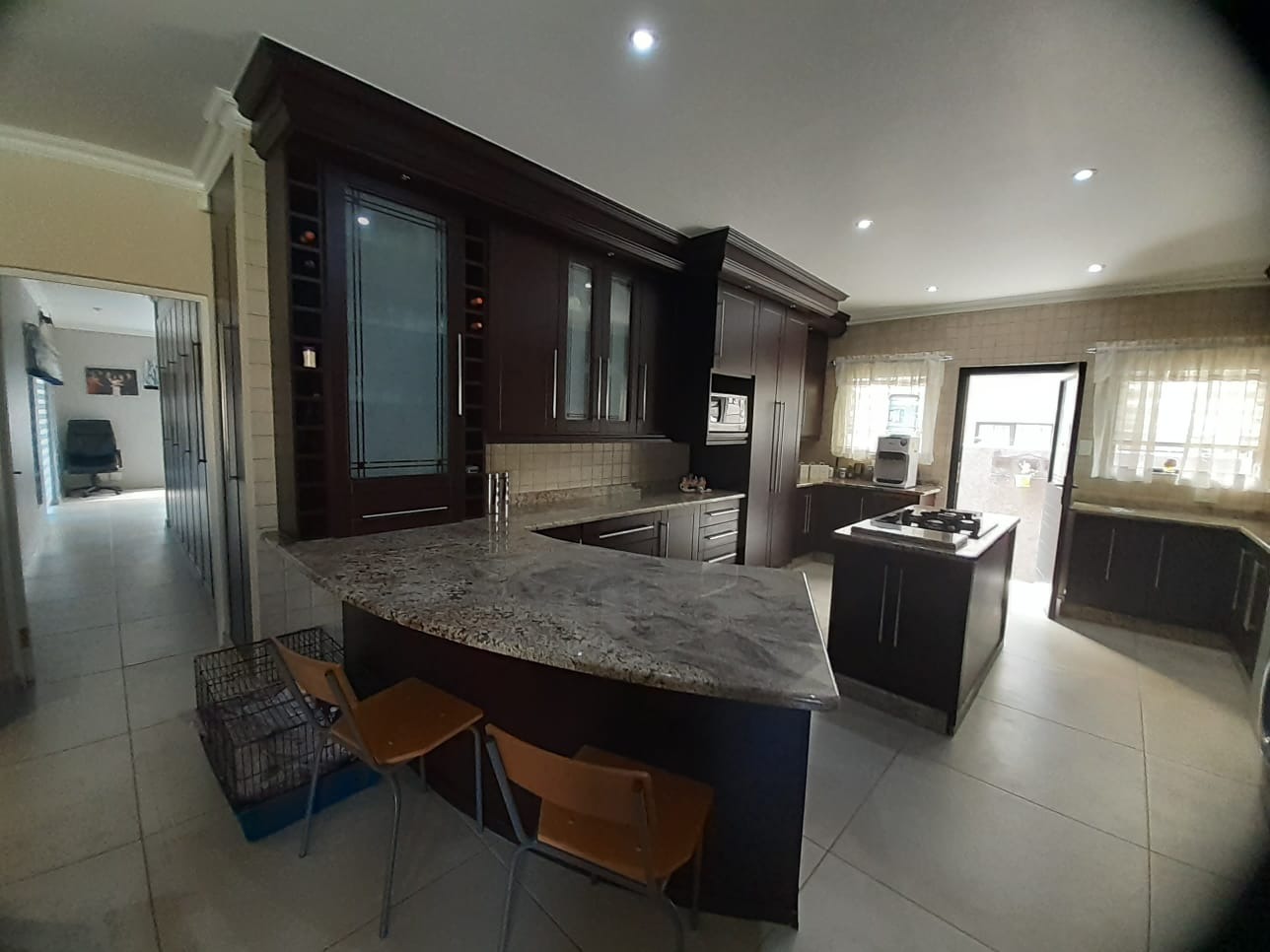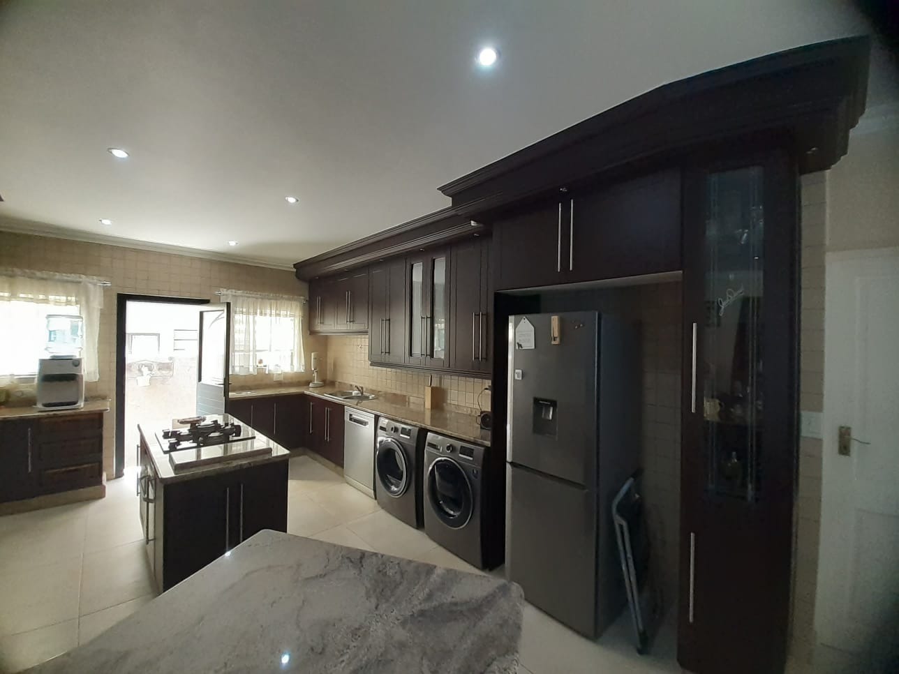 Step inside to an expansive 232 sqm of refined living space, where an open-plan design seamlessly integrates two sophisticated lounges and a dedicated dining area, all bathed in natural light and finished with elegant tiled flooring and recessed lighting. The heart of this home is its gourmet kitchen, boasting abundant dark wood cabinetry, luxurious granite countertops, a central island with a built-in cooktop. A convenient pantry ensures ample storage.