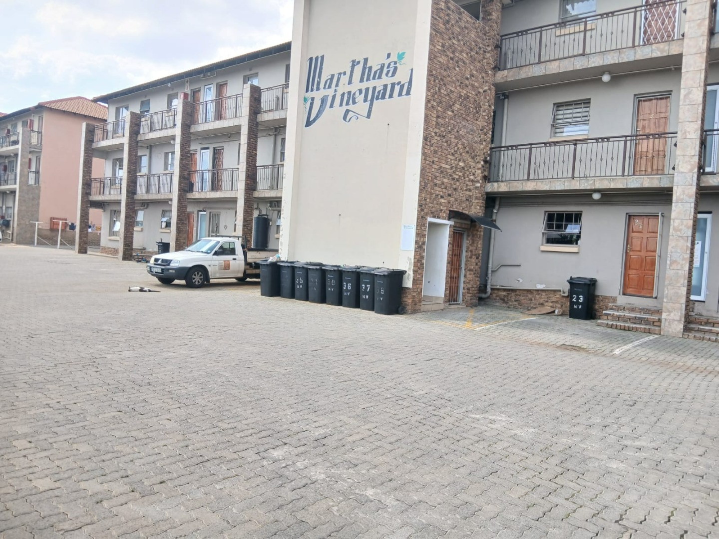 The building's exterior, with its distinctive grape vine mural and balconies, presents a welcoming facade. Ravenswood, Boksburg, offers a well-established suburban setting with essential amenities nearby, making it an ideal location for convenient living.