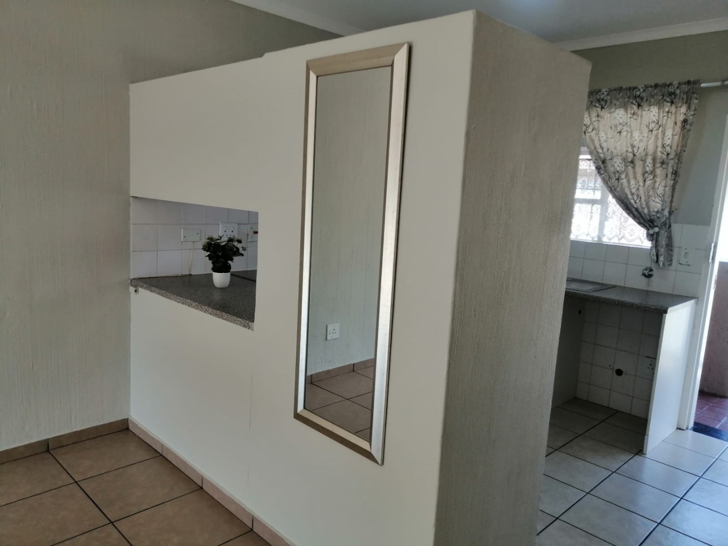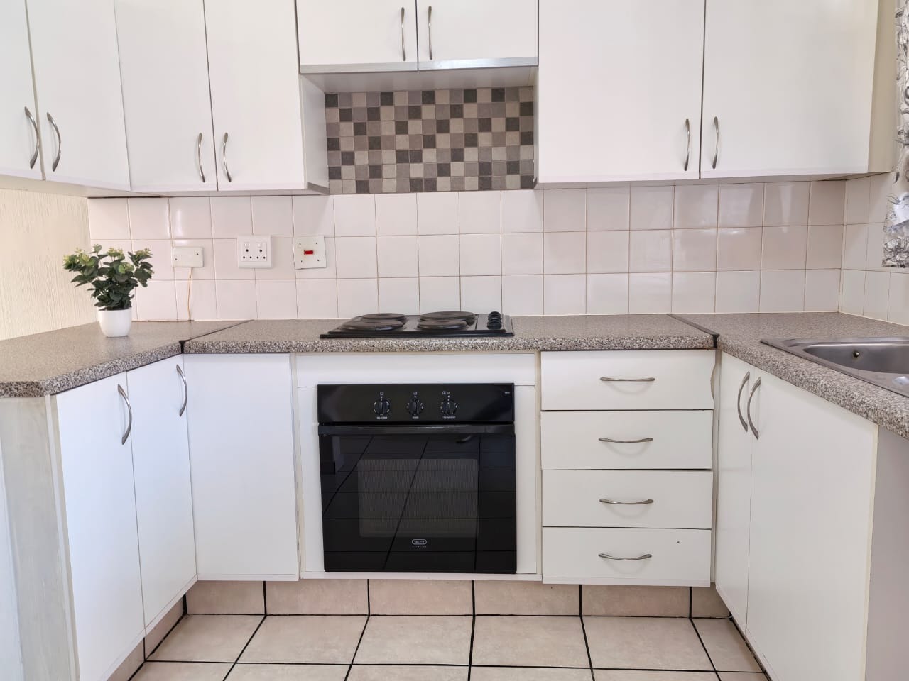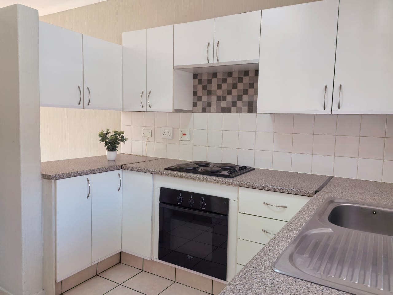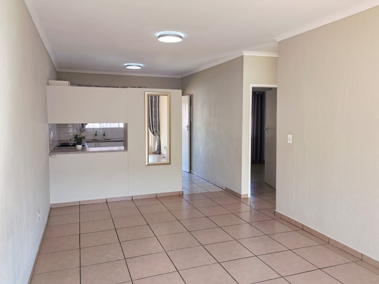 Step inside to an open-plan living area, bathed in natural light, featuring durable tiled flooring and neutral wall tones, ready for your personal touch. The functional kitchen boasts modern white cabinetry, ample L-shaped speckled countertops, an integrated oven and hob, and a sink. A convenient service hatch connects to the living space, enhancing the flow.